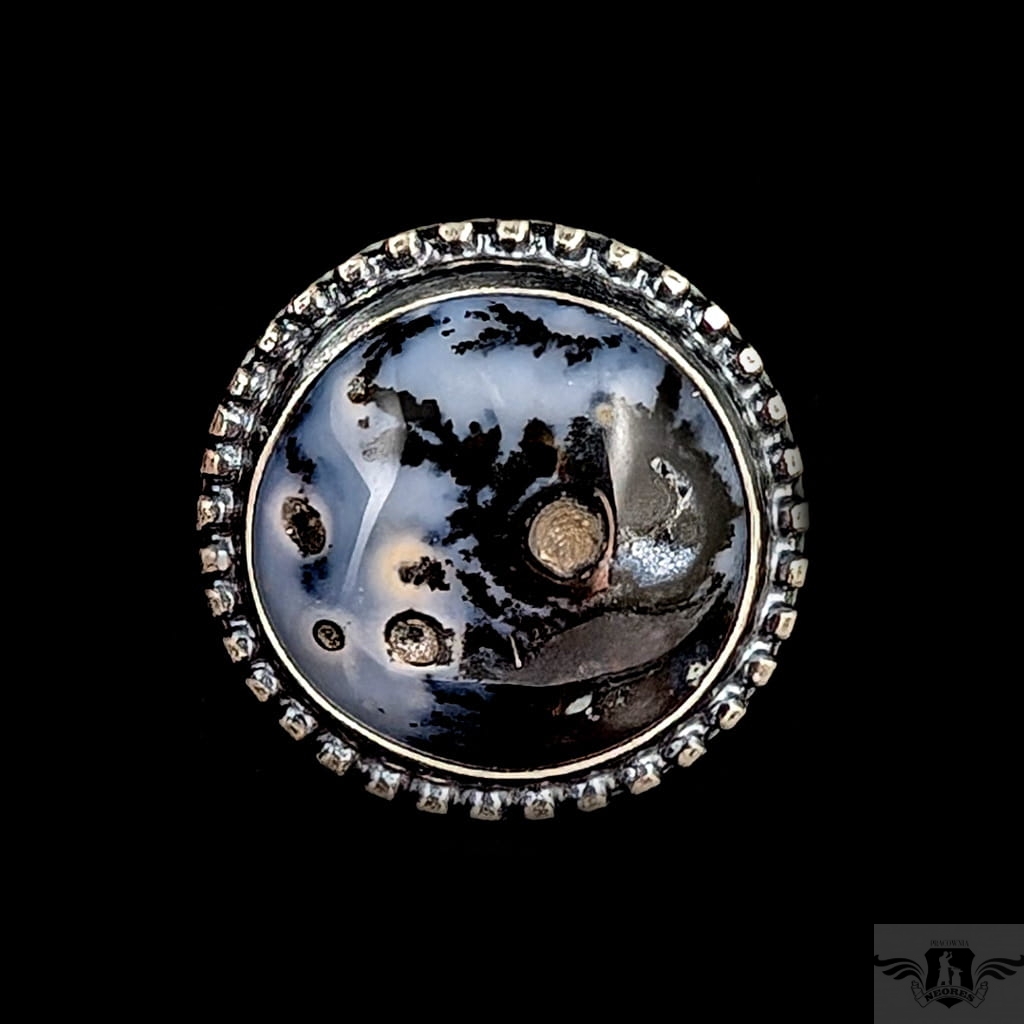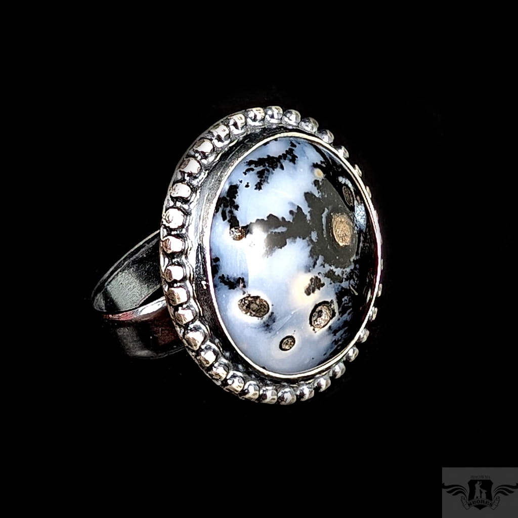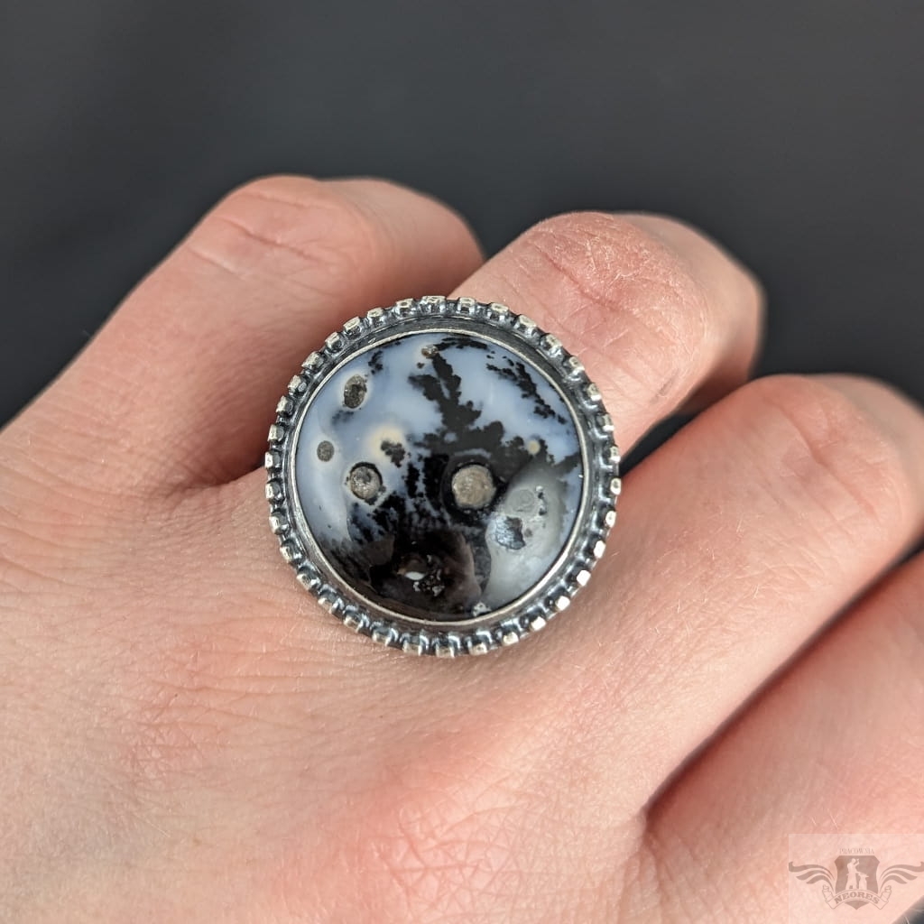 Pierścień z pięknym agatem dendrytowym. Kamień oprawiony w oksydowane srebro pr. 925. Rozmiar pierścionka regulowany w szerokim zakresie, proszę napisać na jaki dopasować. Wymiary oprawy 27 mm,, waga 13 g, obrączka szer. 5 mm. Pierścień będzie zapakowany w ozdobne pudełeczko.