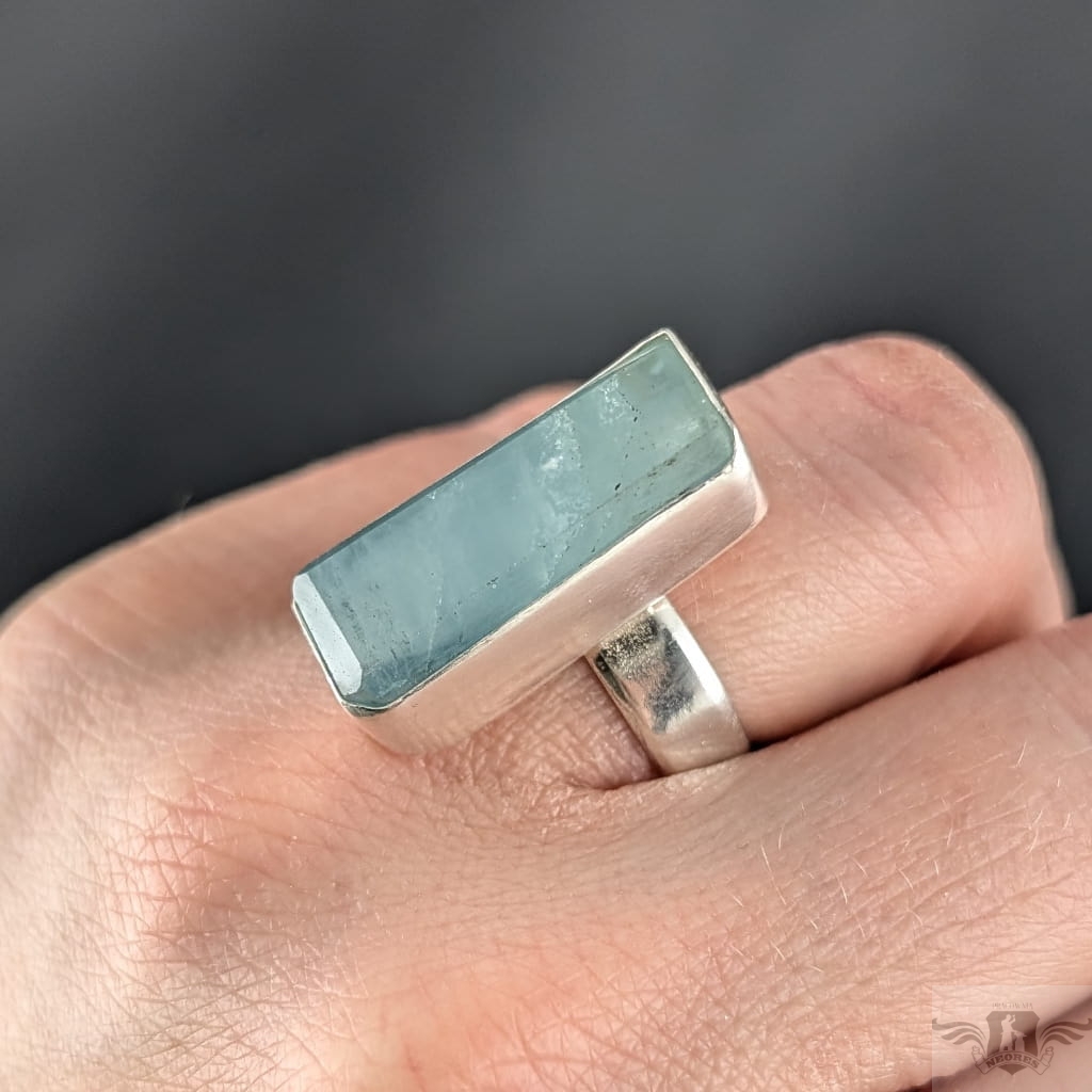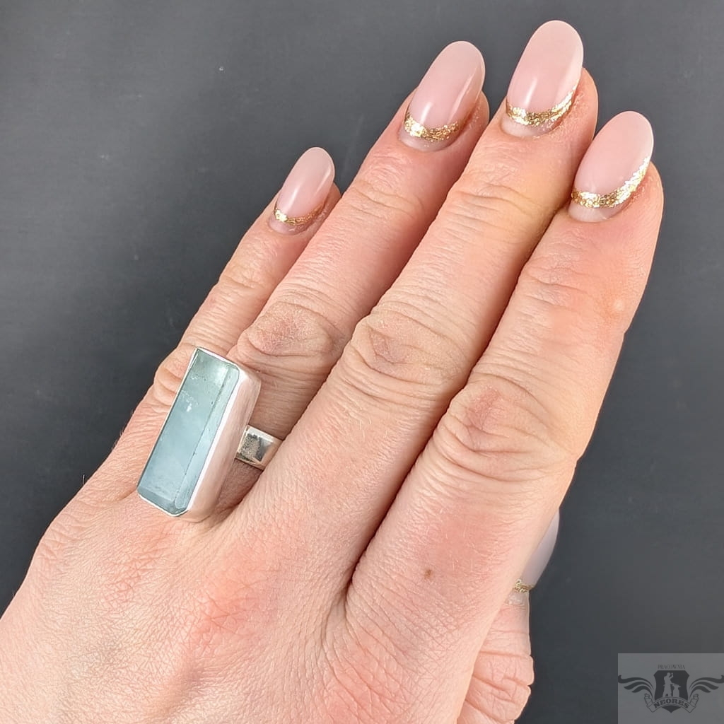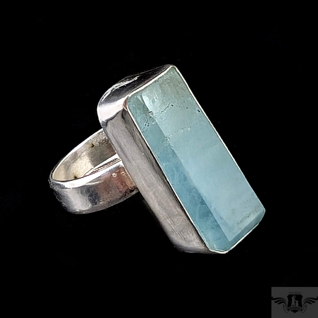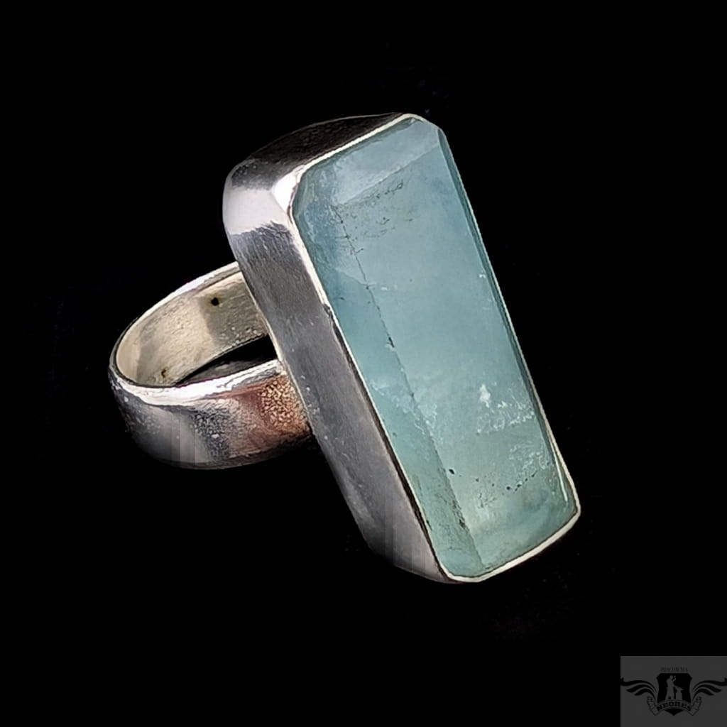 Pierścionek z oprawionym ręcznie w srebro pr.925 przepięknym, świetlistym akwamarynem. Oprawa 25 x 11 mm, rozmiar jubilerski jest regulowany, dzięki obrączce, którą można dopasować w szerokim zakresie 9-26. Proszę napisać na jaki rozmiar dopasować. Obrączka o szerokości 5 mm. Waga 10,5 grama. Pierścień zostanie zapakowany w ozdobne pudełeczko.