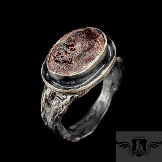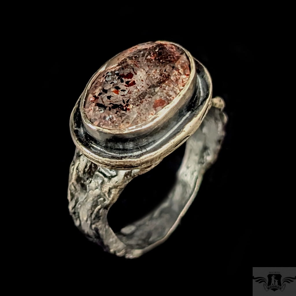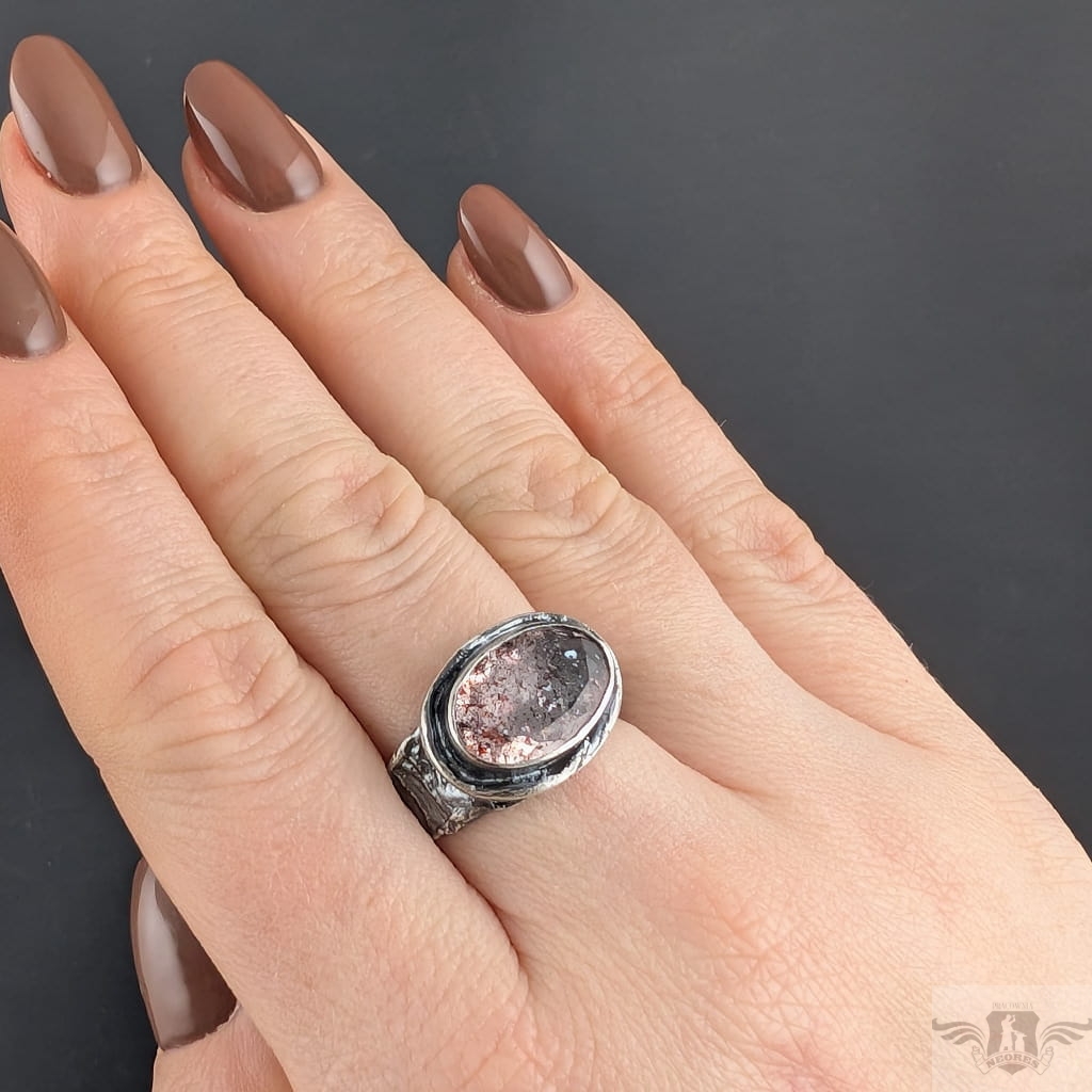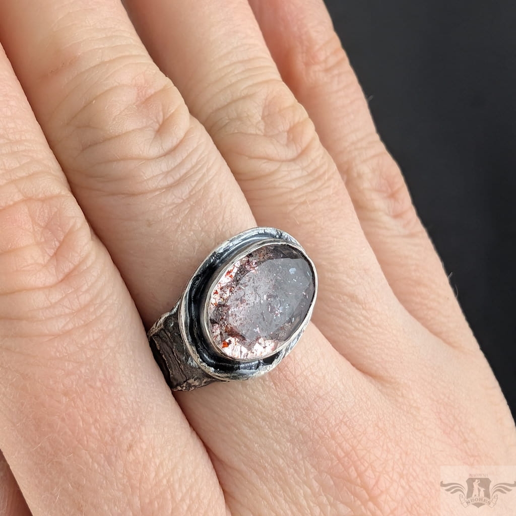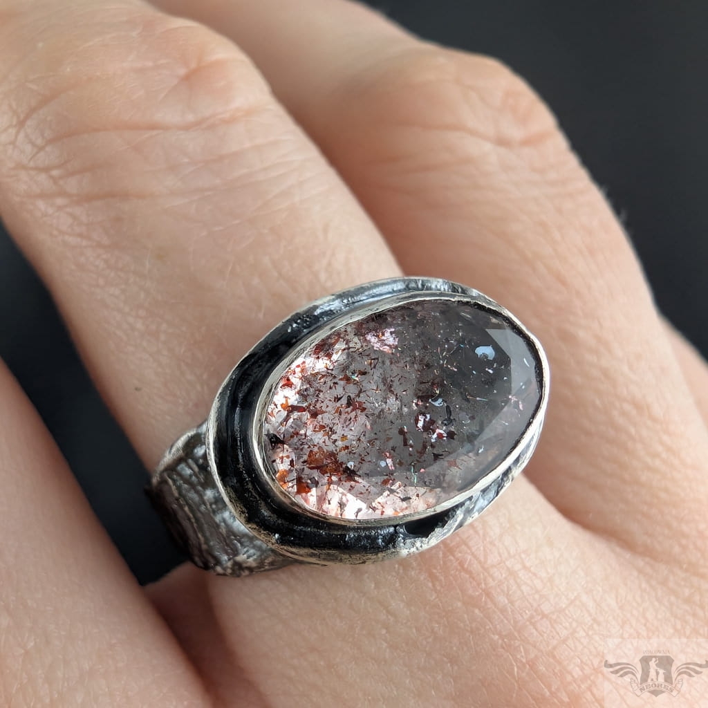 Pierścień wykonany z oksydowanego srebra próby 925. Srebrną gałązkę zdobi wyjątkowy okaz Super Seven- zjawiskowa kombinacja 7 minerałów zaklętych w pięknym szlifie na calej powierzchni (m.in.lepidokrocyt, kwarc dymny,ametyst, rutyl, kryształ górski). Kamień ma oprawę 13 x 17 mm. Pierścionek w rozmiarze jubilerskim 17, mogę powiększyć do max 18 waga 6,8 grama. Zostanie wysłany w ozdobne pudełeczko.