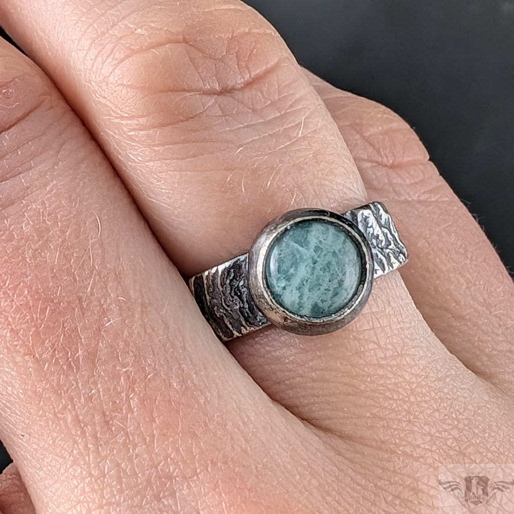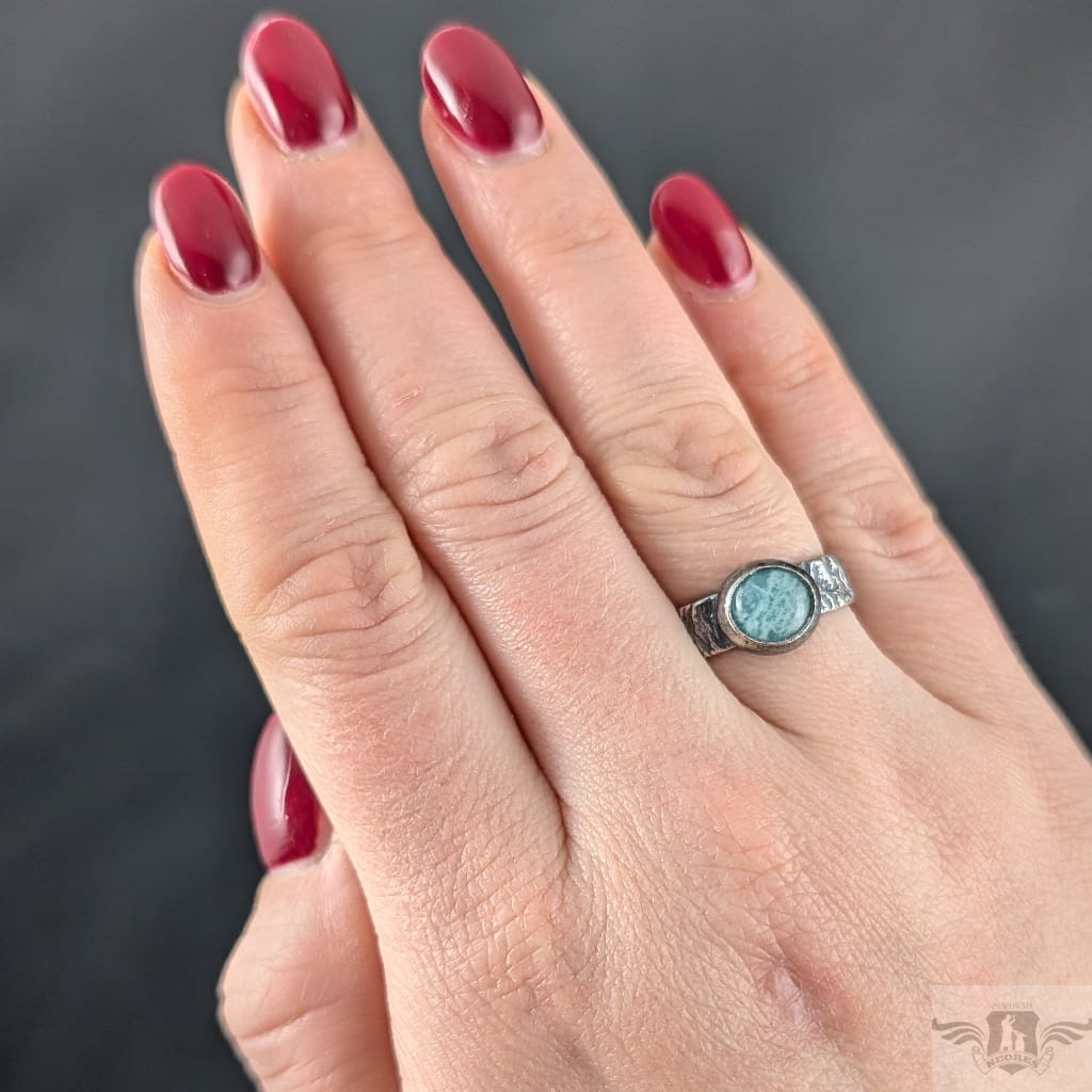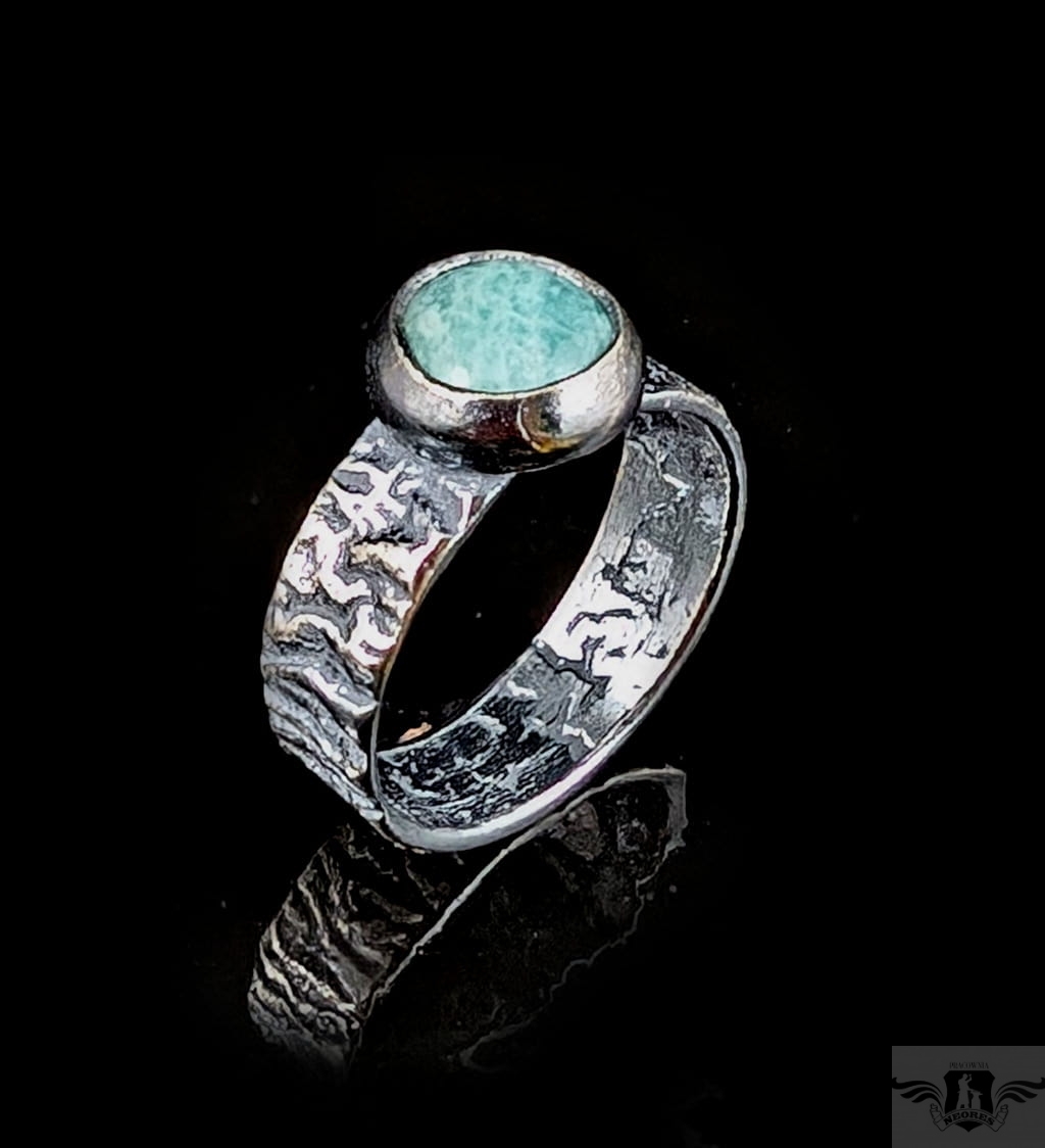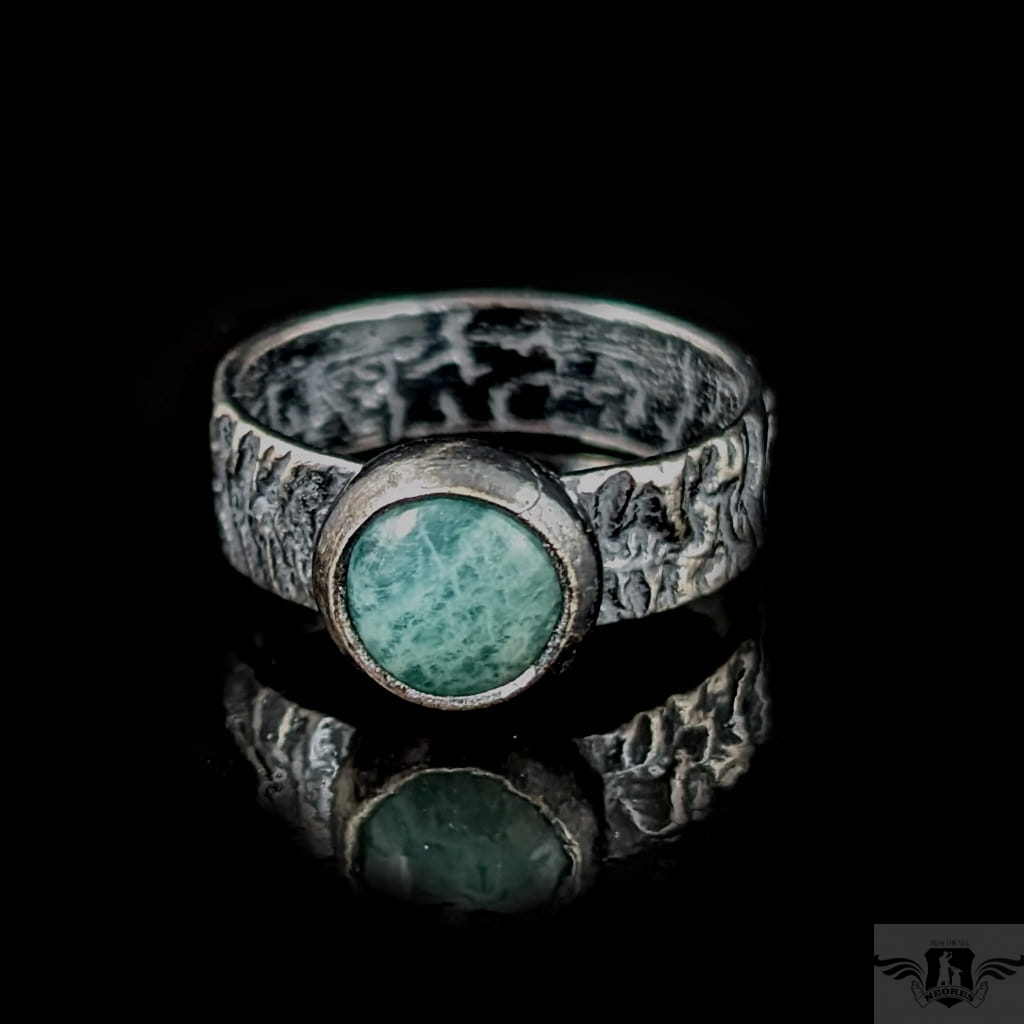 Pierścień wykonany z oksydowanego srebra próby 925 oraz miętowego amazonitu. Wymiary oprawy 9 mm, rozmiar jubilerski 17 moge powiekszyc na max 18. Obrączka ma 5 mm szerokosci. Pierścień zostanie zapakowany w ozdobne pudełeczko.