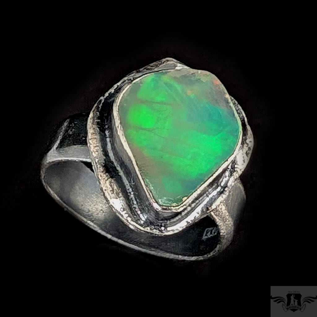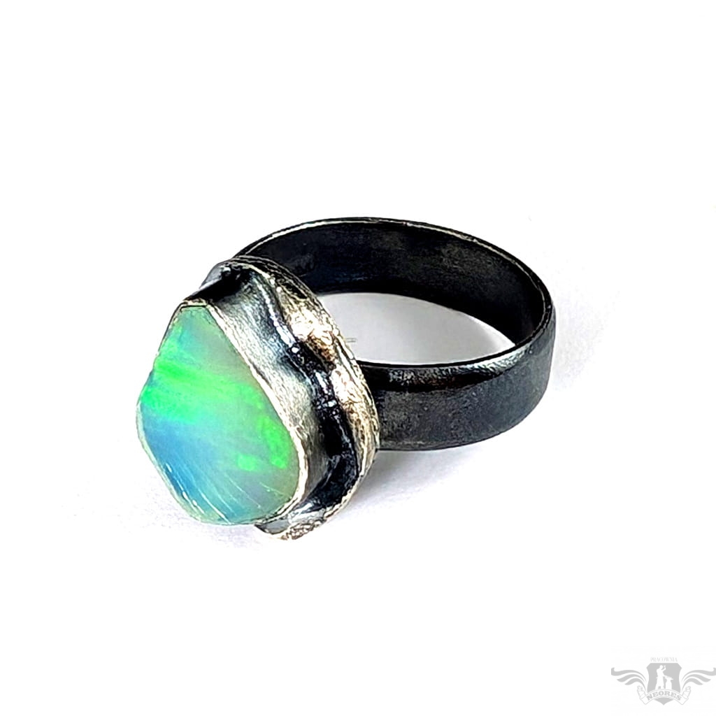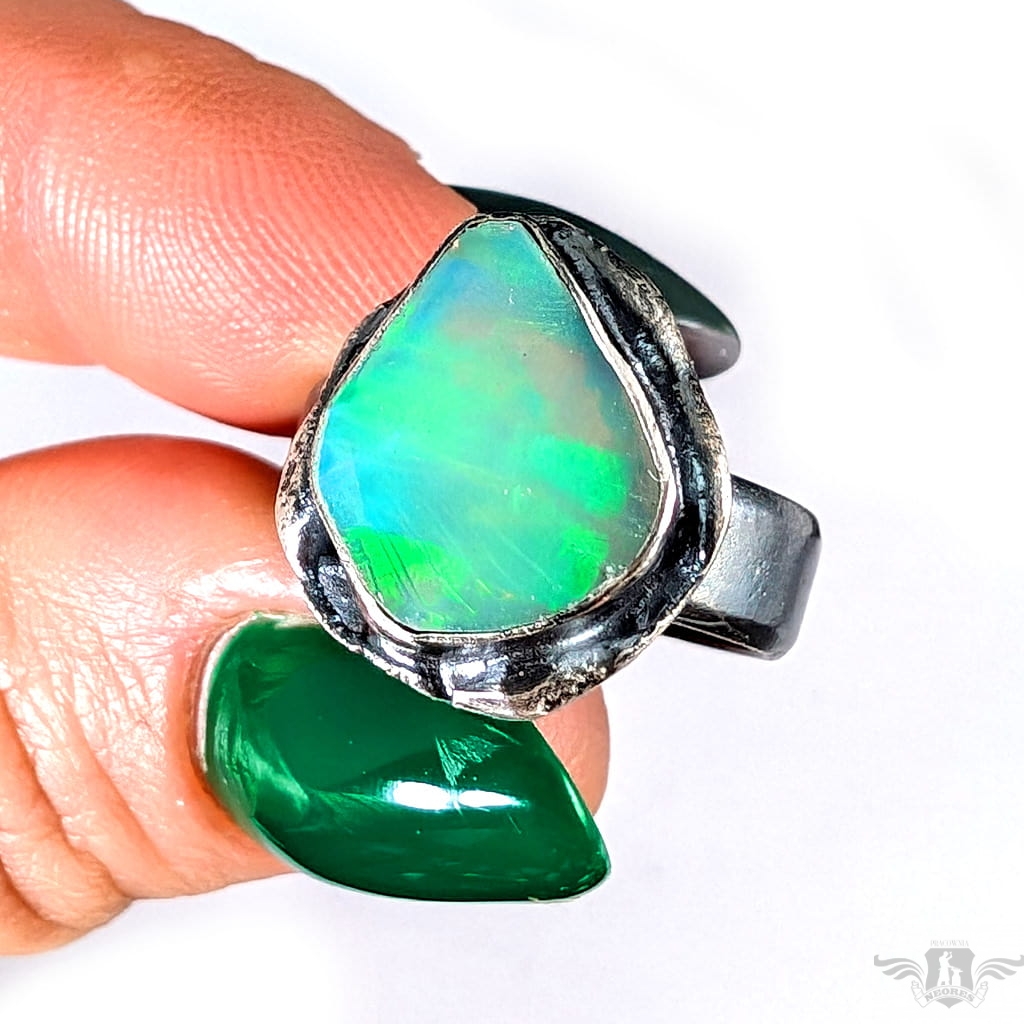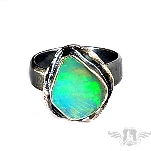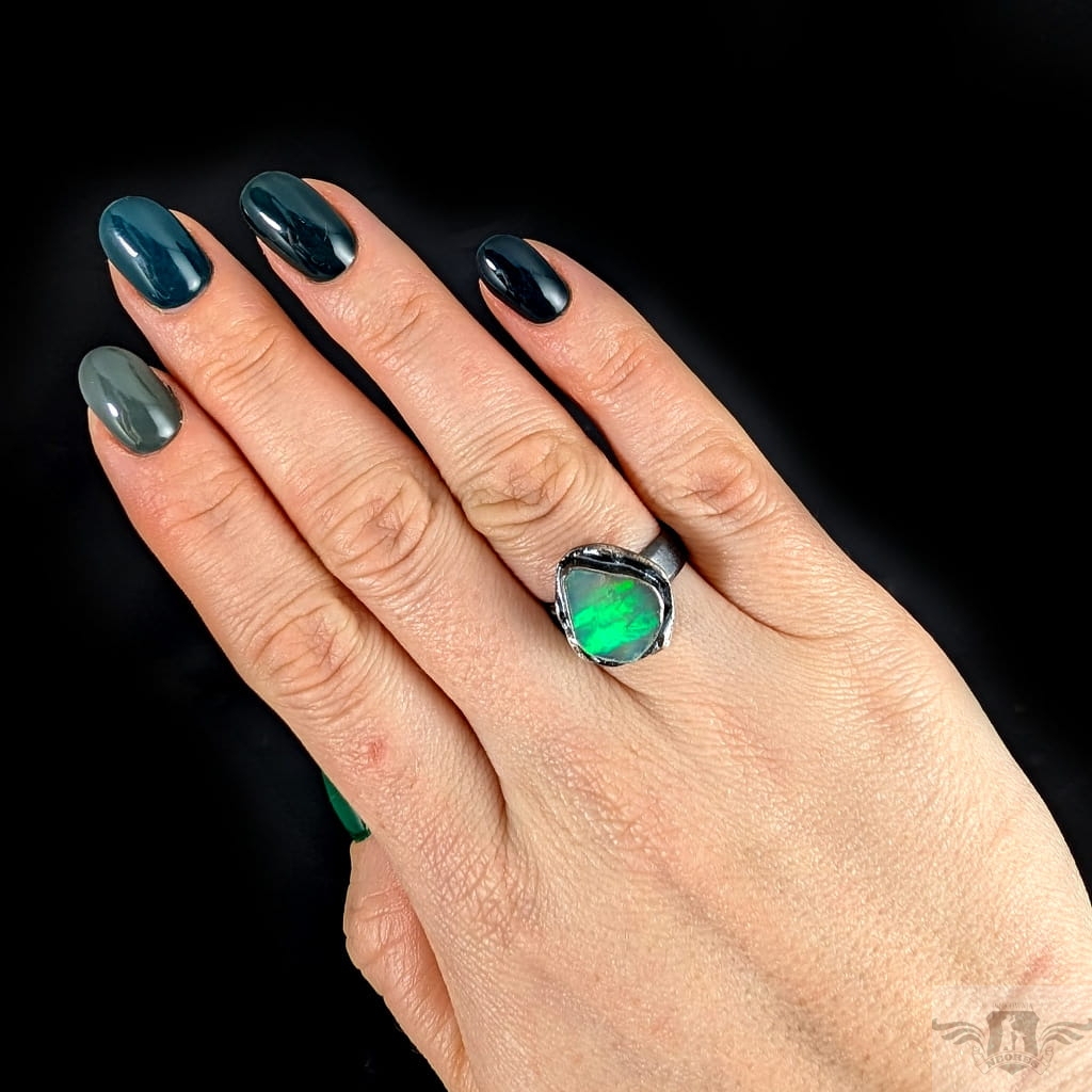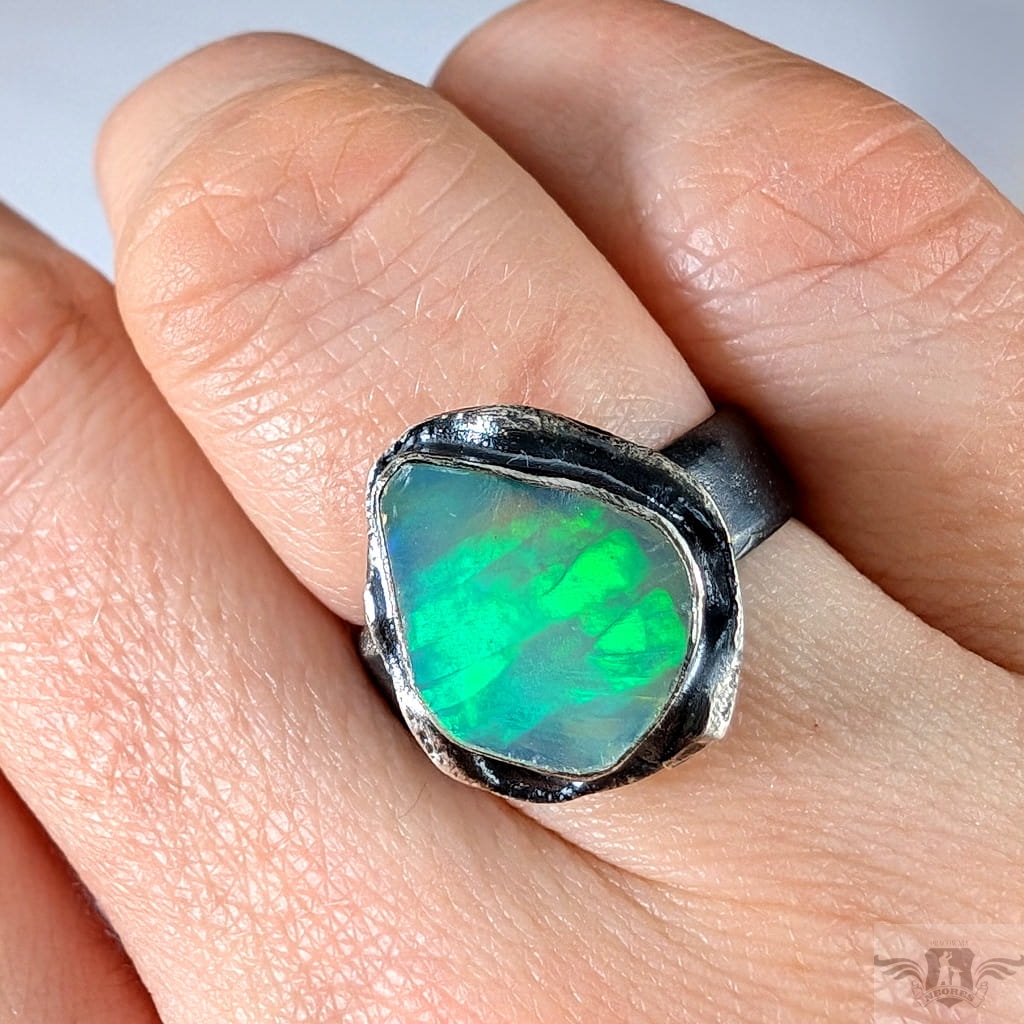 Piękny, surowy pierścień z oprawionym opalem etiopskim o intensywnie zielonej tafli przypominającej zorzę polarnąna niebieskim niebie. Piękno nie do oddania na zdjęciu. Srebro pr.925, oksydowane. Wymiary oprawy 17x15 mm. Waga 6.5 g. Obrączka regulowana w szerokim zakresie (9-26), proszę napisać po zakupie, to dopasuję na konkretny rozmiar. Obrączka ma 5 mm szerokości. Zapakowany w ozdobne pudełeczko.