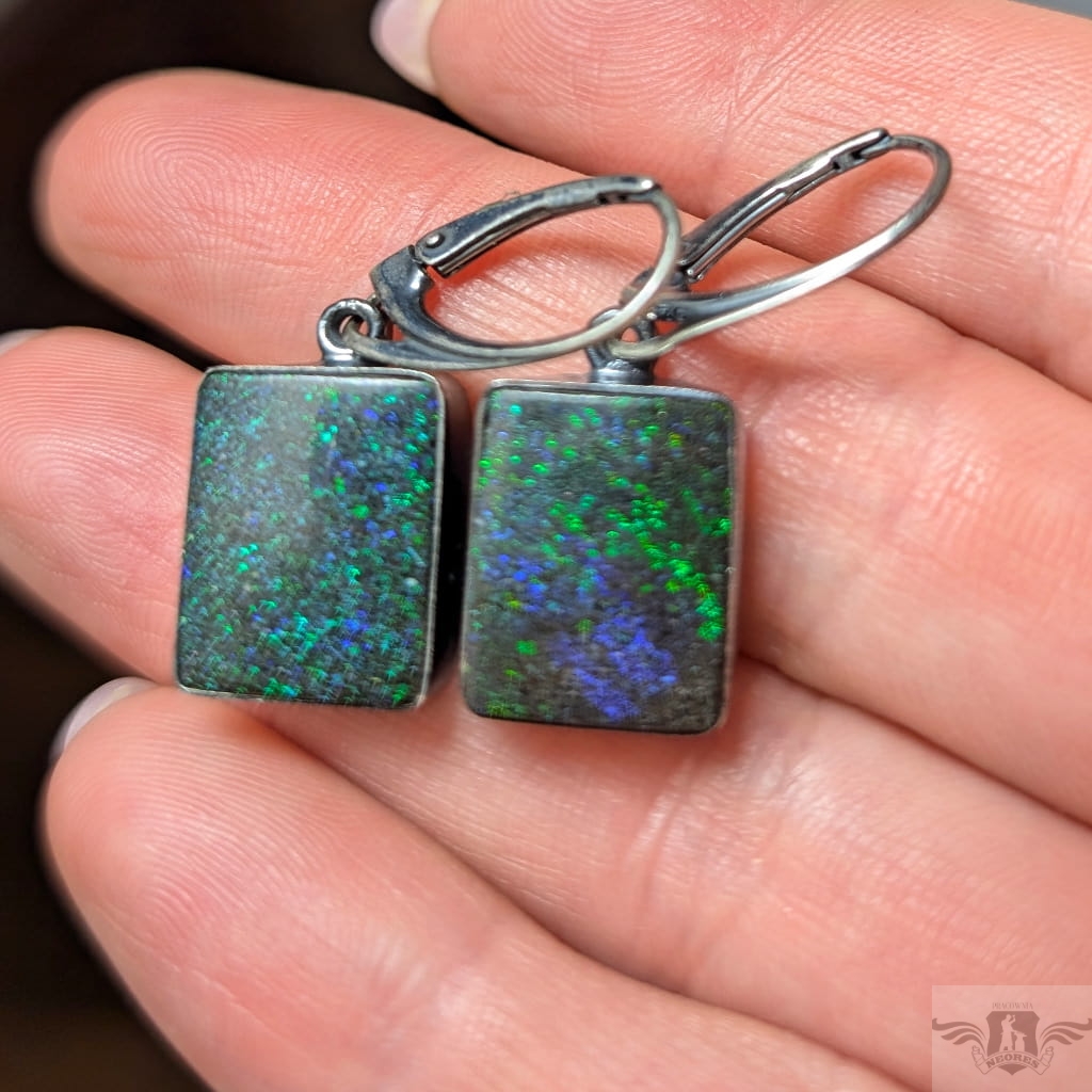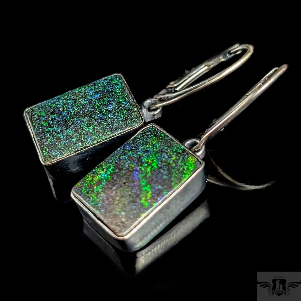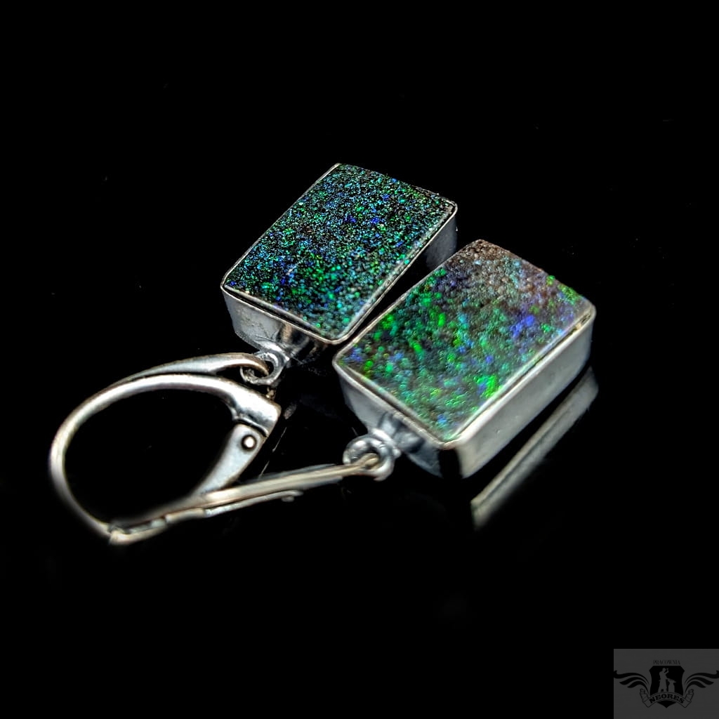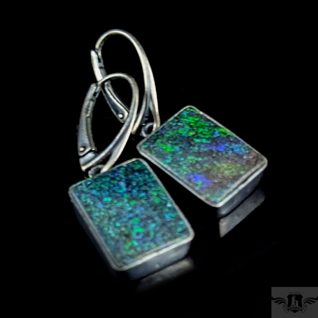Kolczyki wykonane z oksydowanego srebra 925 oraz opali australijskich matrix. Wymiary oprawy 16 x 12 mm. Długość z krawatką 34 mm. Iskrząca opalizacja. Waga jednego kolczyka 3,7 grama. Kolczyki zapakowane w ozdobne pudełeczko.