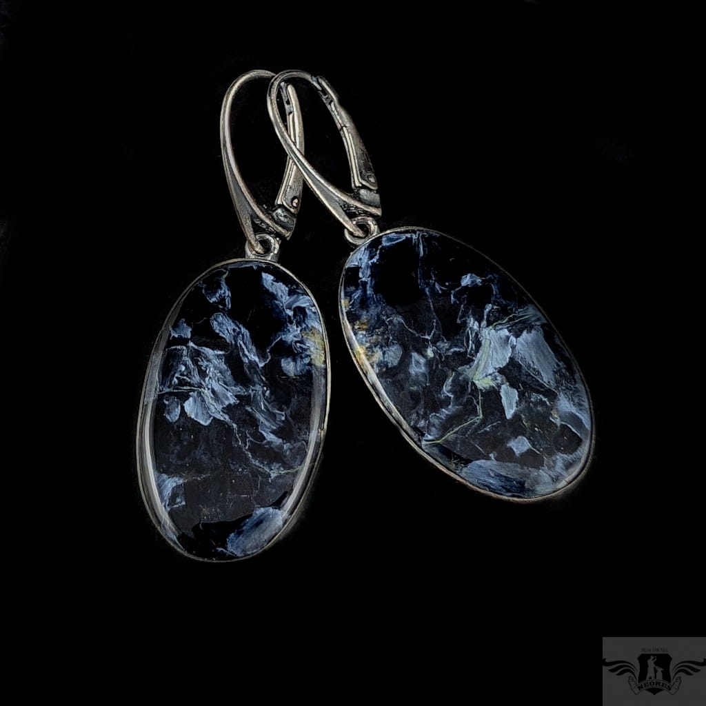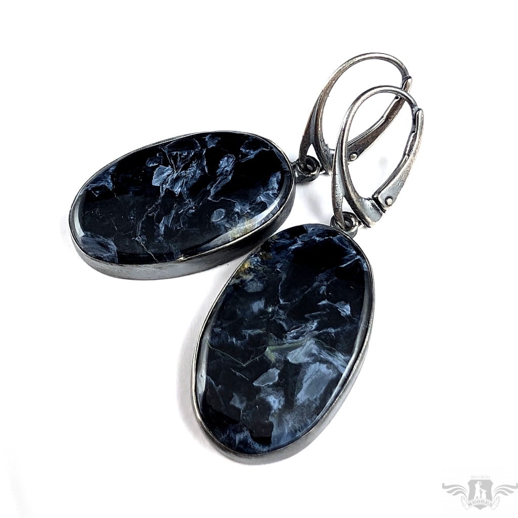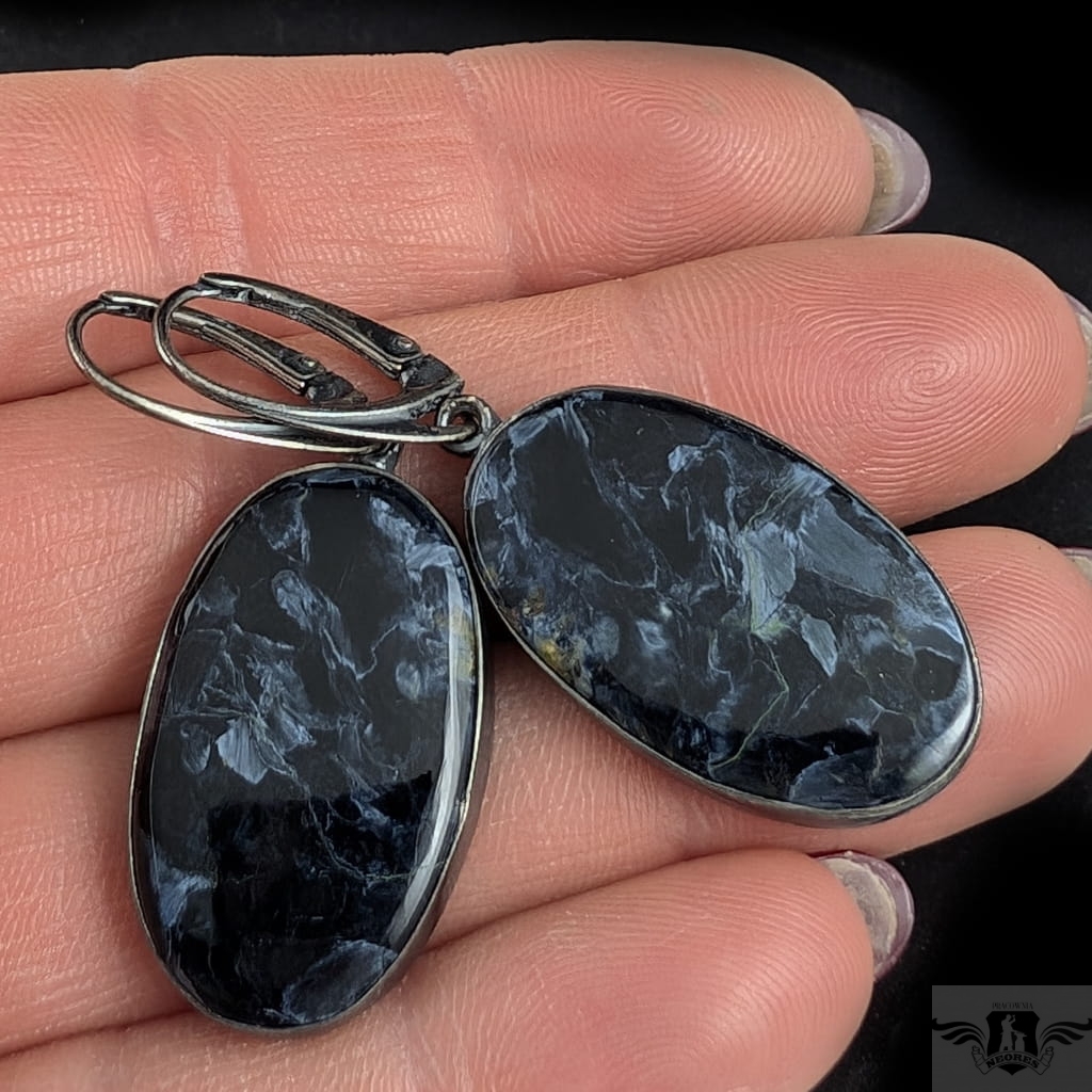 Oryginalne kolczyki z tajemniczym Pietersitem. Wykonane ze srebra, które zostało poddane zabiegowi oksydowania. Długość kolczyka max. 47 mm. Bigle angielskie. Kamienie mają oprawę 27 x 17 mm. Waga jednego kolczyka 6 g. Pietersite to rzadki, naturalny minerał o ciekawym efekcie tygrysiego oka. Kolory pietersitu to granat, gołębi błękit, czarny, beż. Piękna para zostanie wysłana w opakowaniu ozdobnym.