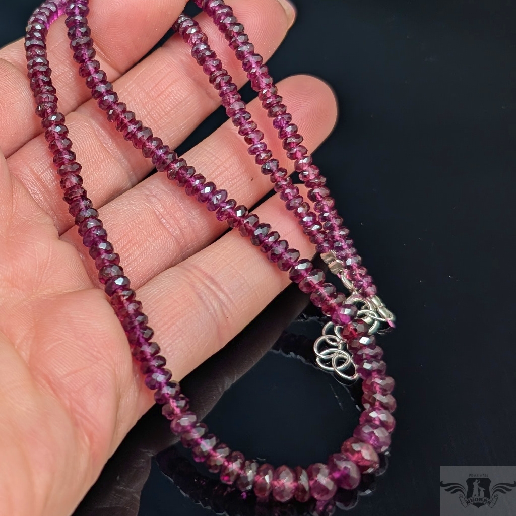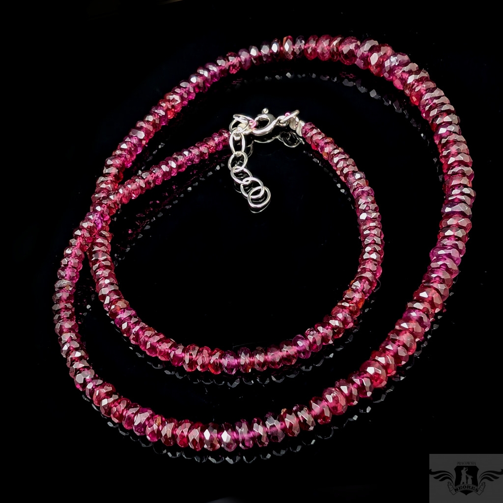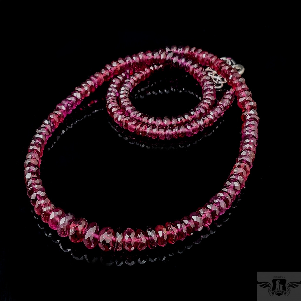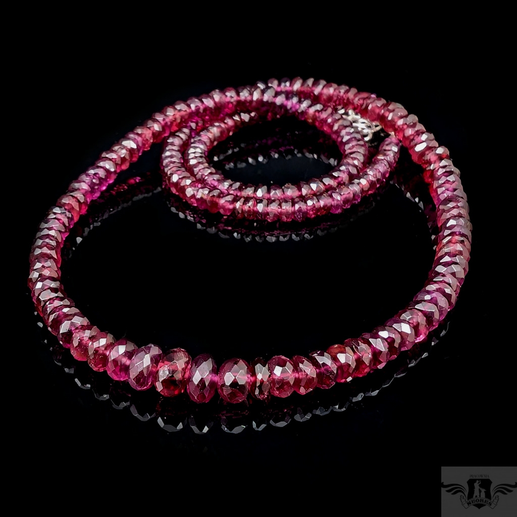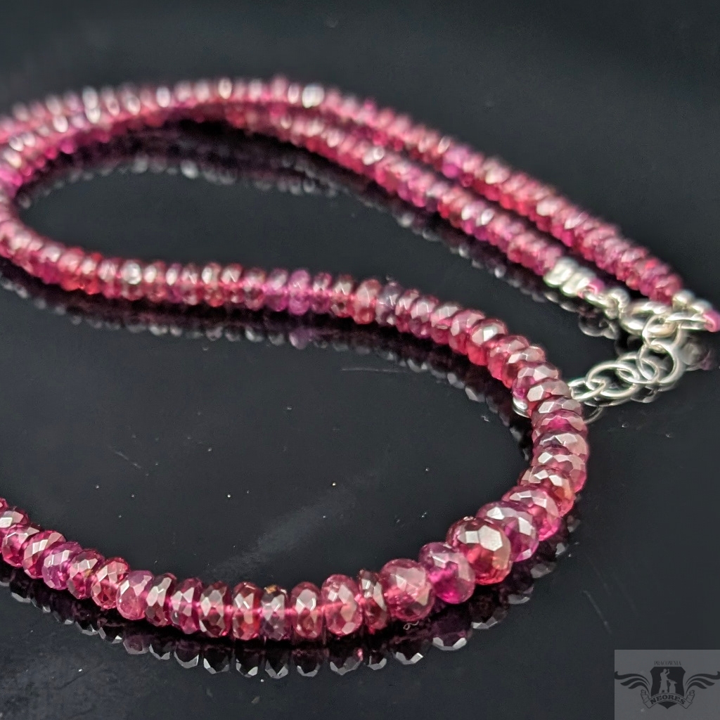 Naszyjnik ze szlachetnych, zjawiskowo pięknych rodolitów. Niezwykły, głęboki kolor podkreślony fasetowaniem. Zapięcie i łańcuszek srebro 925. Grubość 6 mm max, kamienie stopniowane do min. 3 mm. długość naszyjnika max. 50 cm. Bardzo kobiecy i elegancki. Naszyjniki i bransoletki robimy sami.