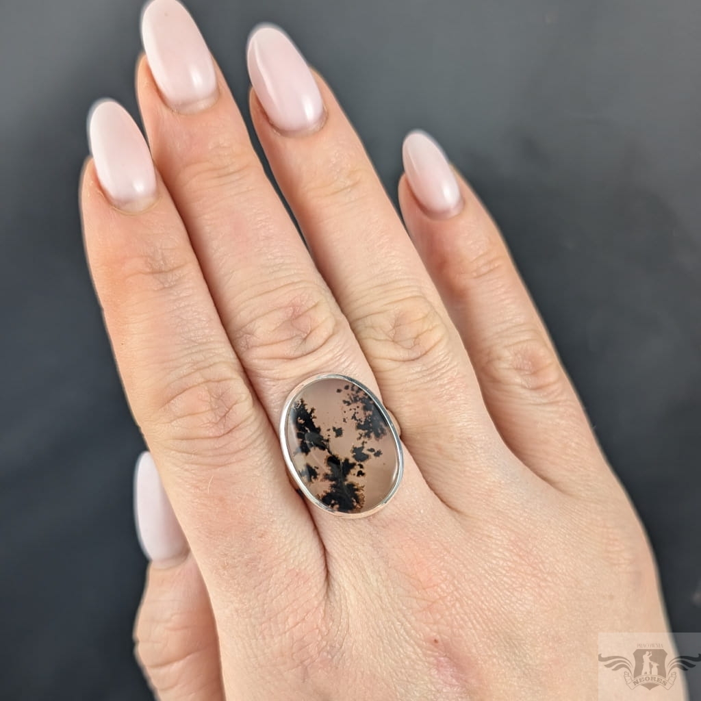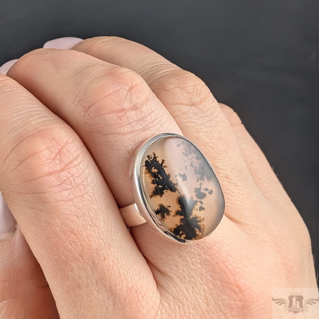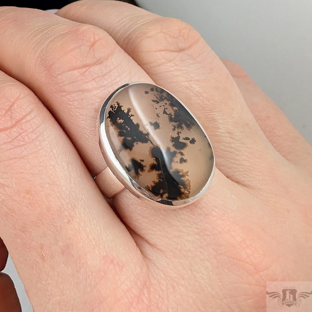Pierścień z agatem montana oprawionym w srebro próby 925. Wymiary 23 x 17 mm, waga 8 g. Wewnątrz kamienia piękne, naturalne malunki dendrytowe. Rozmiar jubilerski regulowany w zakresie 15-19, proszę napisać, na jaki dopasować. Pierścień zostanie zapakowany w ozdobne pudełeczko. Polecam w komplecie z wisiorem. Wykonany przez dostawcę kamieni.