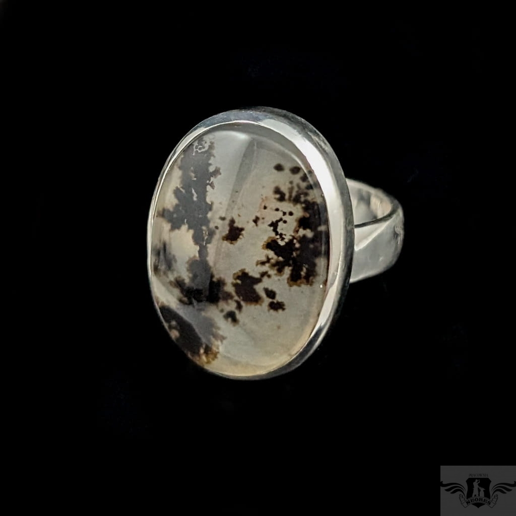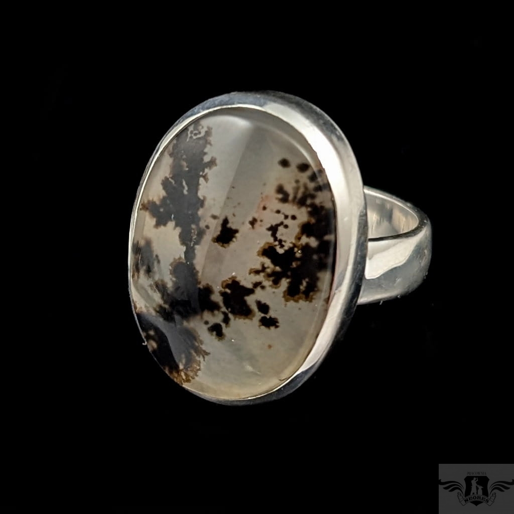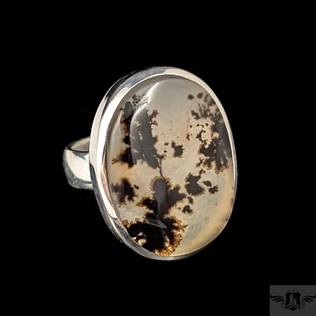 Pierścień z agatem montana oprawionym w srebro próby 925. Wymiary 23 x 17 mm, waga 8 g. Wewnątrz kamienia piękne, naturalne malunki dendrytowe. Rozmiar jubilerski regulowany w zakresie 15-19, proszę napisać, na jaki dopasować. Pierścień zostanie zapakowany w ozdobne pudełeczko. Polecam w komplecie z wisiorem. Wykonany przez dostawcę kamieni.