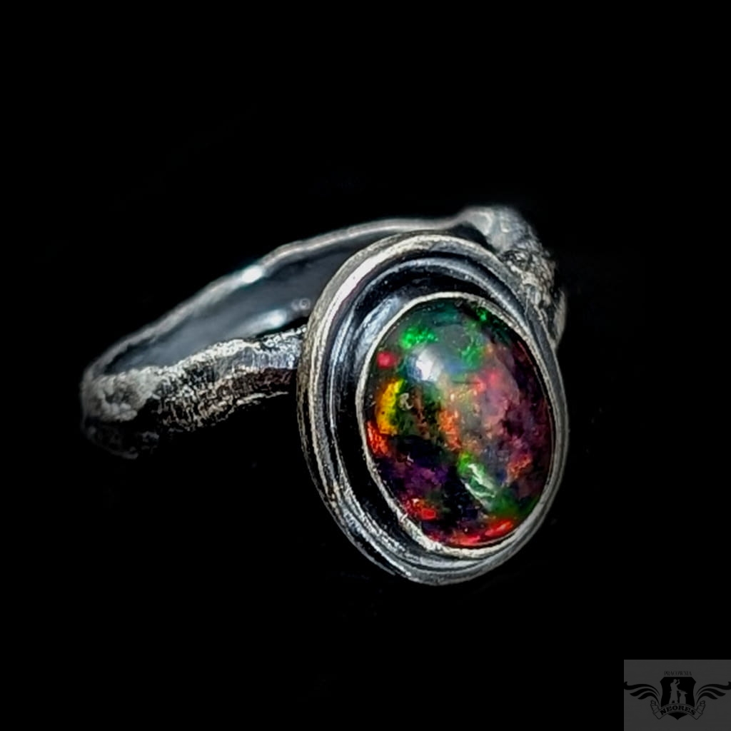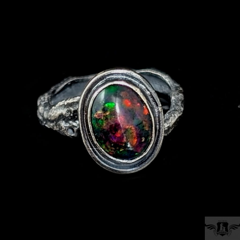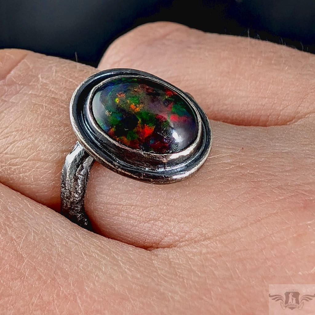 Pierścionek wykonany z oksydowanego srebra próby 925. Rozmiar pierścionka dzięki otwartej podstawie regulowany, mogę dopasować na dowolny rozmiar w zakresie 9-23, proszę napisać na jaki ustawić. Ozdobą pierścionka jest czarny opal z Etiopii. Wymiary oprawy kamienia 13 x 11 mm, szerokość maksymalna obrączki mm, min. 4 mm. Waga 5 g. Pierścień zostanie zapakowany w ozdobne pudełeczko.