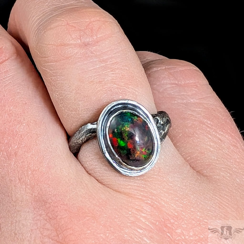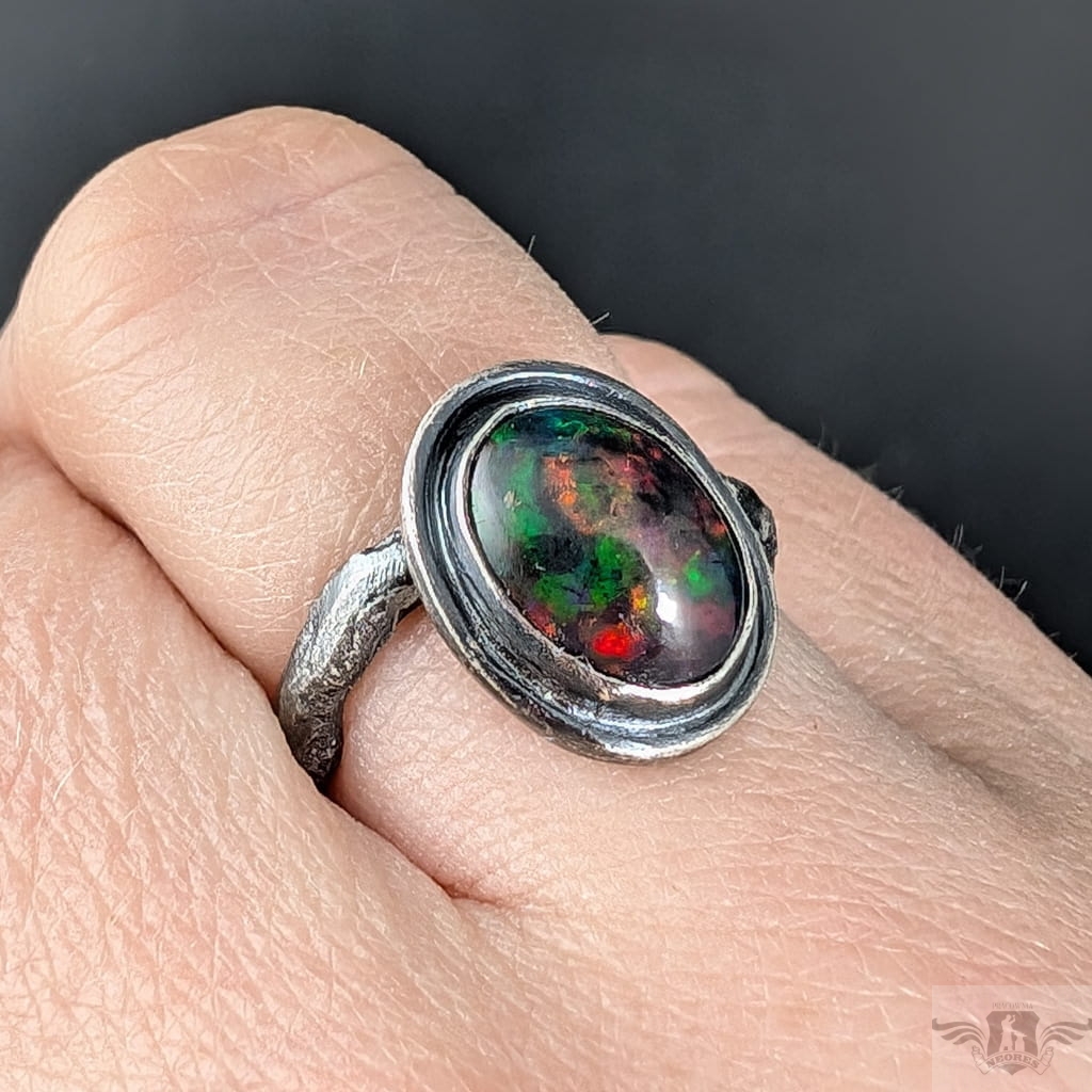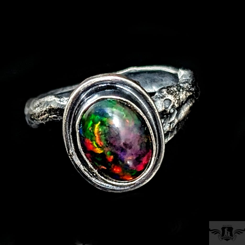 Pierścionek wykonany z oksydowanego srebra próby 925. Rozmiar pierścionka dzięki otwartej podstawie regulowany, mogę dopasować na dowolny rozmiar w zakresie 9-23, proszę napisać na jaki ustawić. Ozdobą pierścionka jest czarny opal z Etiopii. Wymiary oprawy kamienia 13 x 11 mm, szerokość maksymalna obrączki mm, min. 4 mm. Waga 5 g. Pierścień zostanie zapakowany w ozdobne pudełeczko.