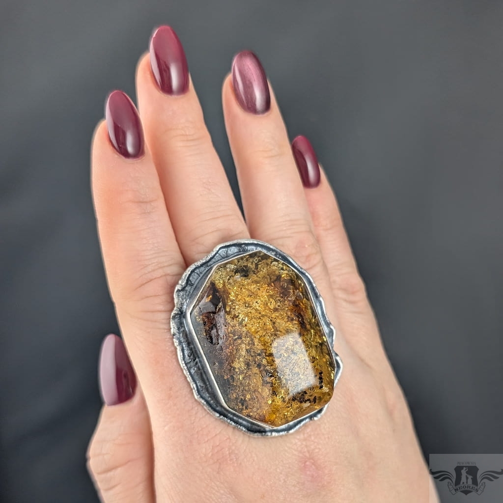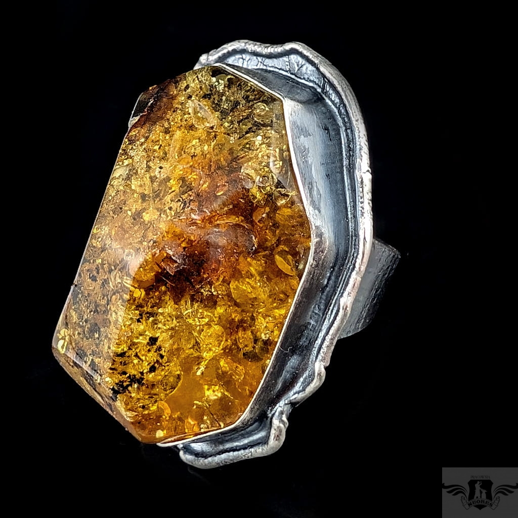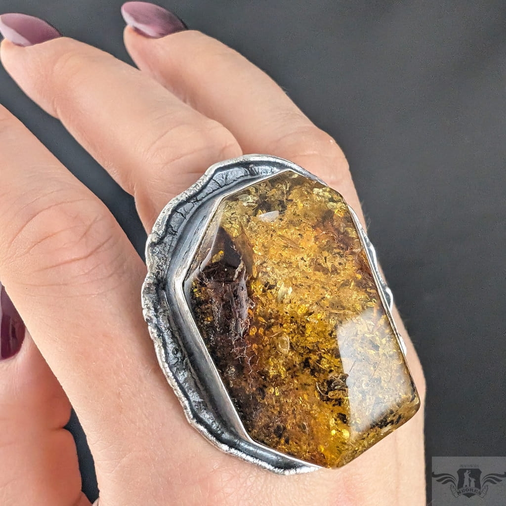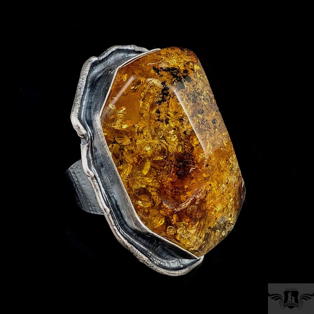 Bardzo okazały pierścień wykonany z oksydowanego srebra pr. 925 oraz naturalnego bursztynu o barwie złocistego miodu. Bursztyn pięknie wyszlifowany, bryła wygląda jak w 3D. Rozmiar jubilerski 24, mogę powiększyć rozmiar pierścienia na max 25. Proszę napisać, jaki ustawić. Obrączka ma max 17 mm szerokości. Wymiary 48 x 37 mm. Waga 30 g. Pierścień zostanie zapakowany w ozdobne pudełeczko.