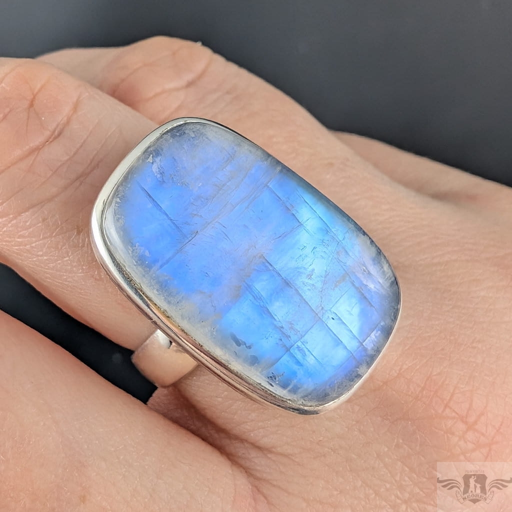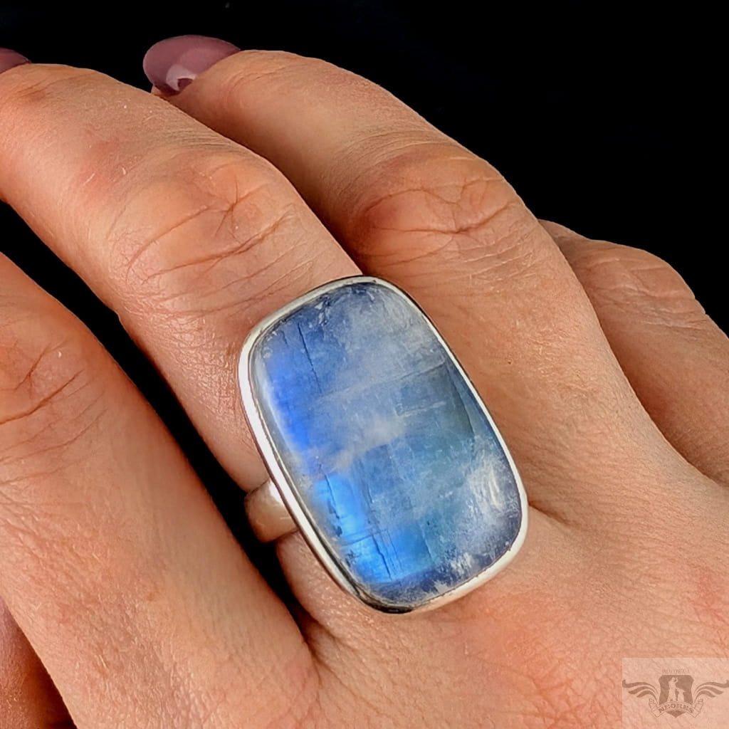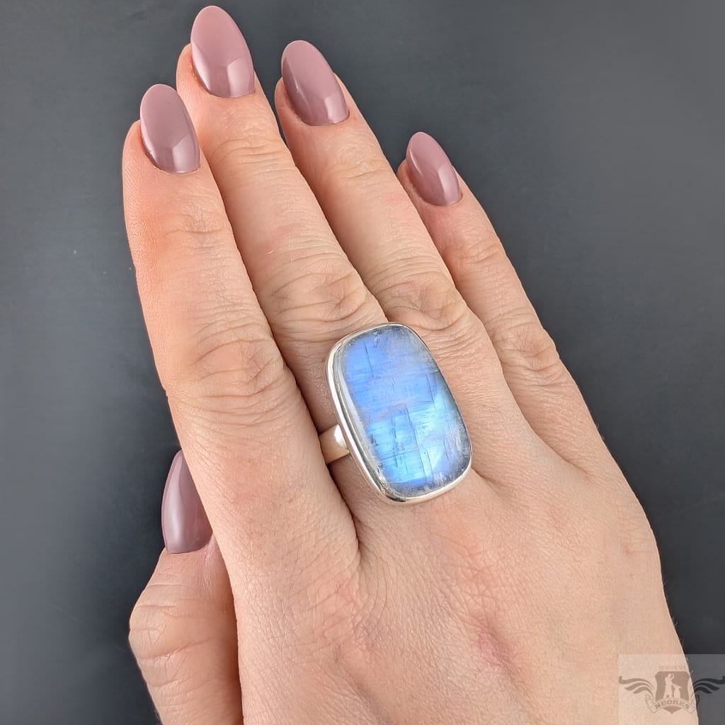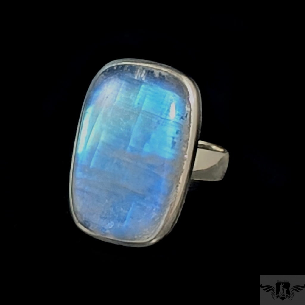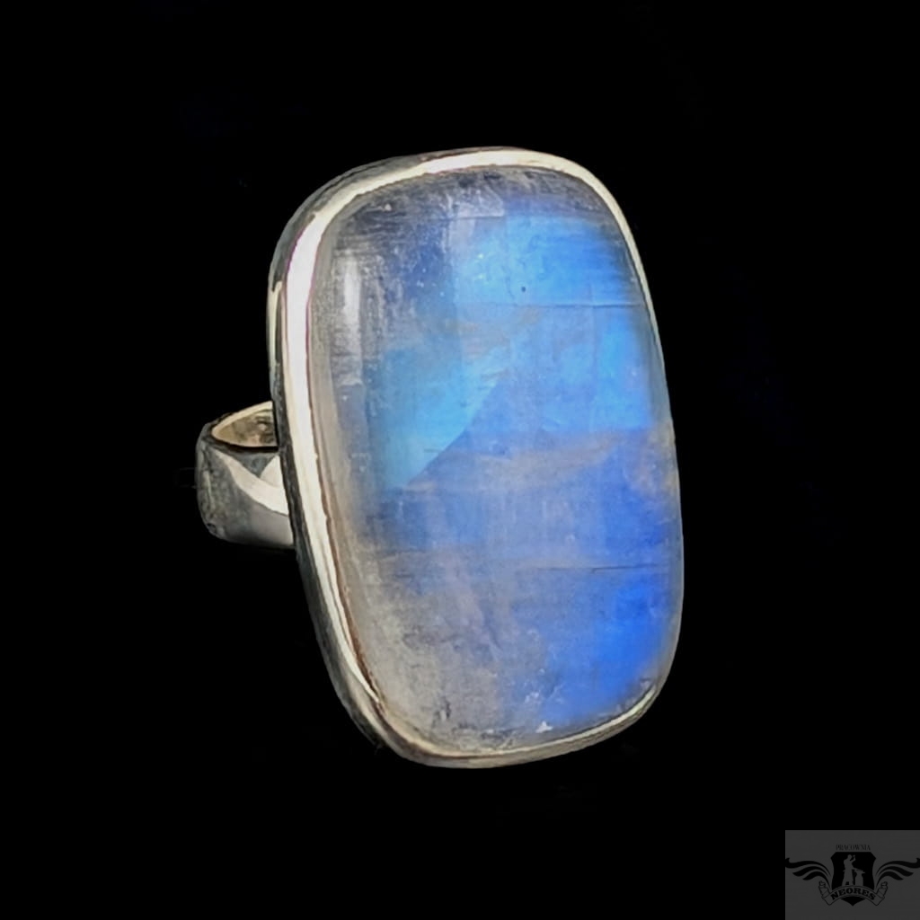 Pierścień z oprawionym w srebro próby 925 pięknym kamieniem księżycowym o błękitnej poświecie . Szerokość obrączki 5 mm. Kamień ma oprawę 28 x 17 mm. Rozmiar jubilerski regulowany w wąskim zakresie 13-19, po zakupie dopasuję do odpowiedniego rozmiaru. Waga 12,5 gramów. Wykonany przez dostawcę kamieni, Pierścień zapakowany zostanie w ozdobne pudełeczko.