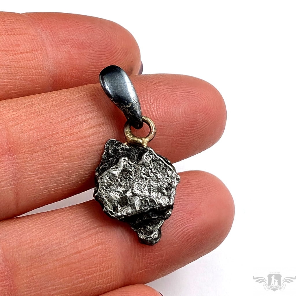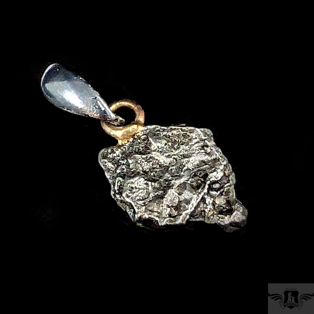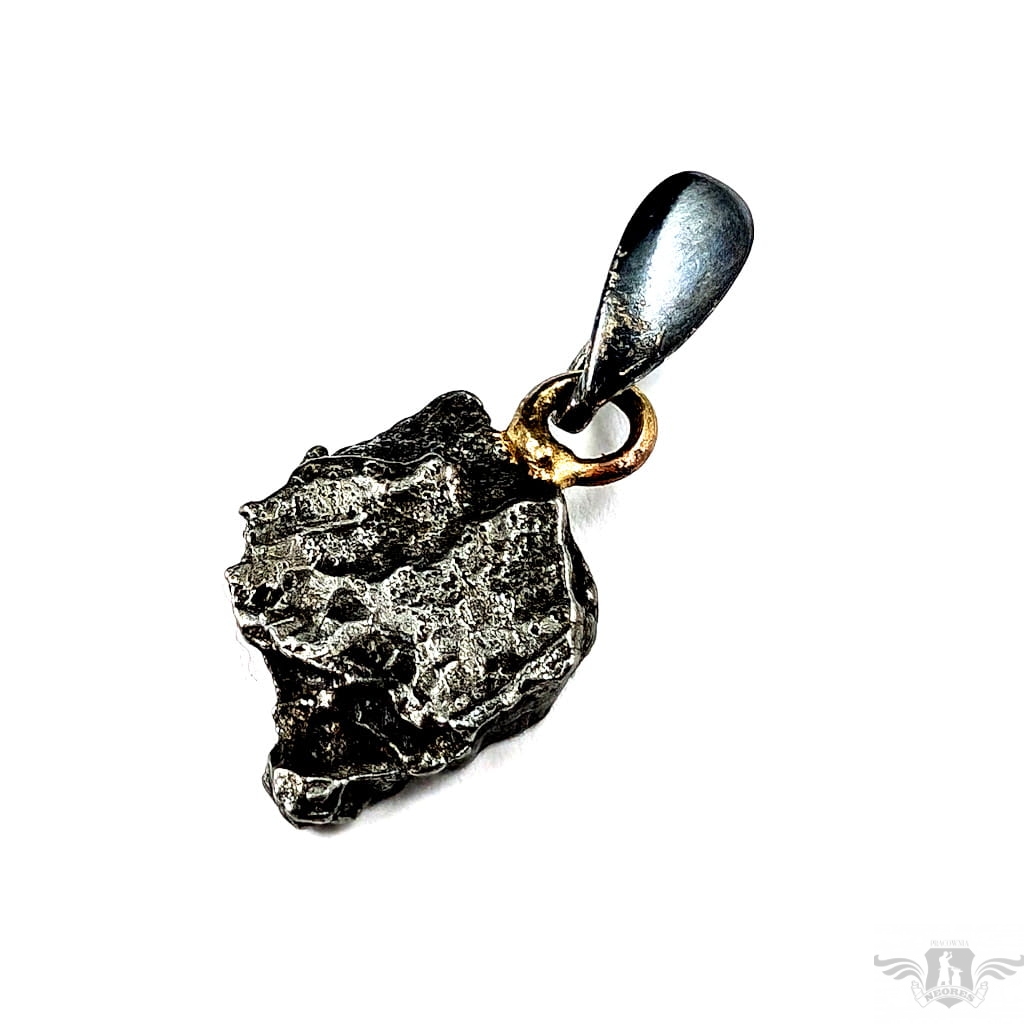 Wyjątkowy wisior z meteorytem żelaznym Campo del Cielo, który znaleziono w 1576 roku w Argentynie. Meteorytom przypisywane są magiczne właściwości talizmanów. Z pewnością jest to niebanalny materiał jubilerski w ciekawy sposób zakomponowany w srebro.Uniwersalny,dla niego lub dla niej. Do meteorytu dołączona jest jego metryka. Wymiaty 15 x 13 mm, z krawatką z oksydowanego srebra długosć 28 mm, Waga wisiora 3,7 g. Wisior zostanie zapakowany w ozdobne pudełeczko.
