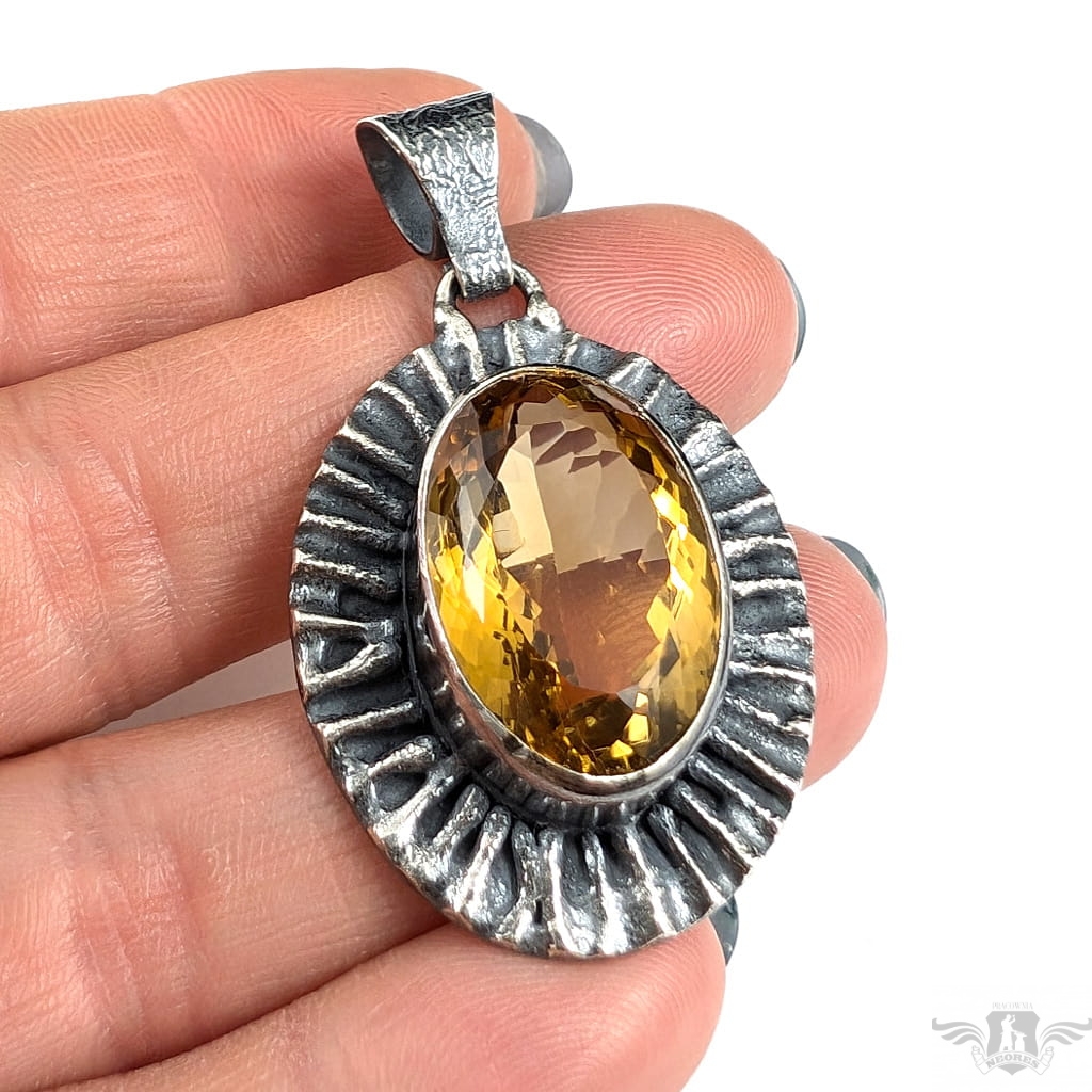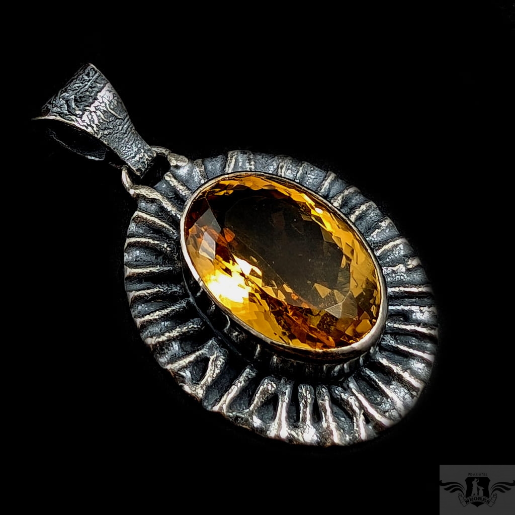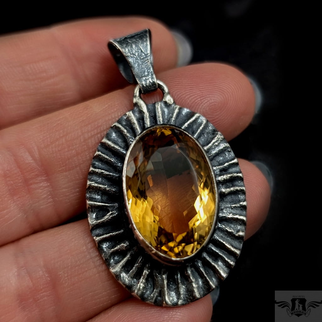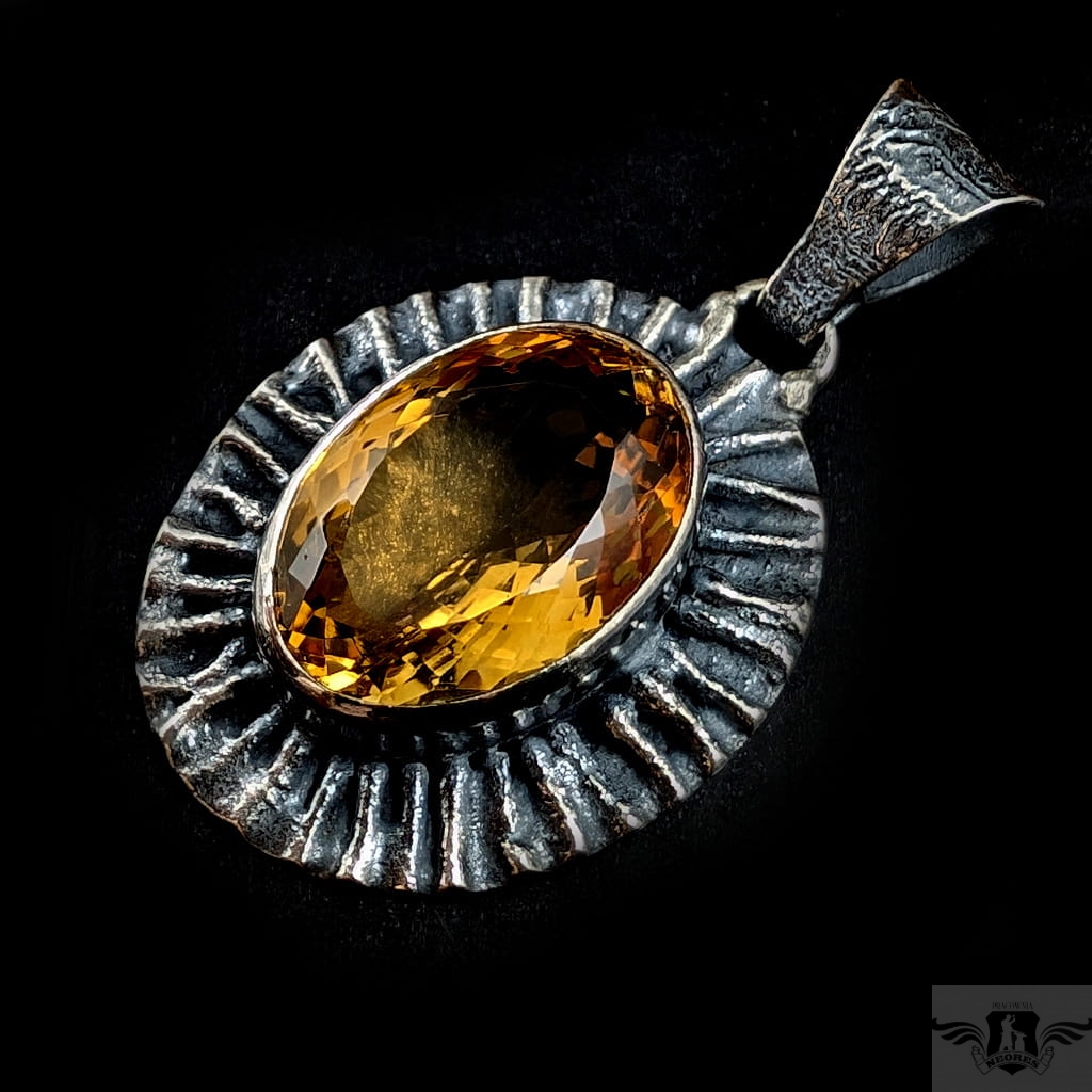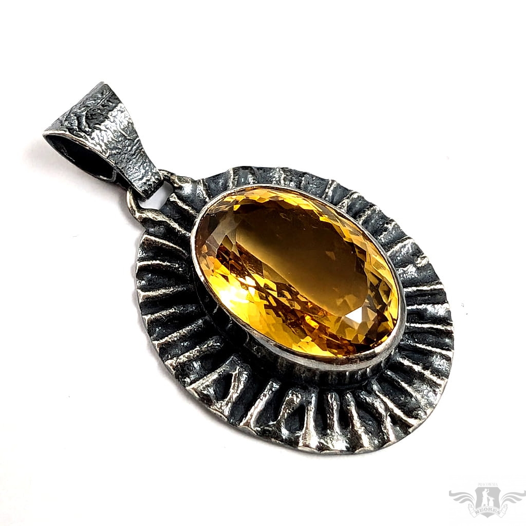 Okazały wisior wykonany z oksydowanego srebra pr. 925 oraz przepysznego cytrynu. Piękny szlif oraz barwa. Wymiary całej oprawy 33 x 27 mm. Długość z krawatką 47 mm,waga 13 g. Wisior zostanie zapakowany w ozdobne pudełeczko.