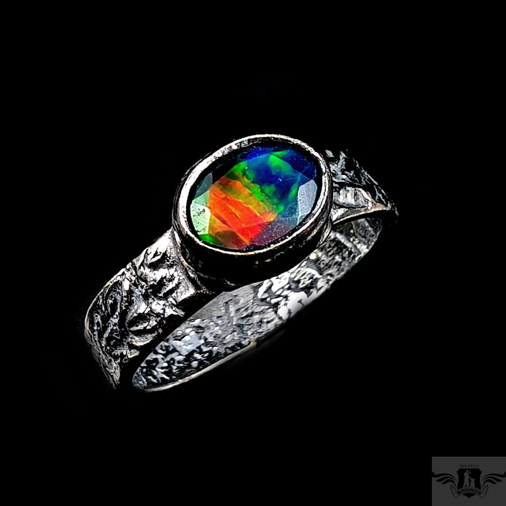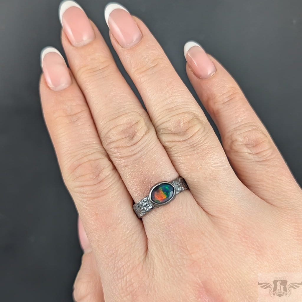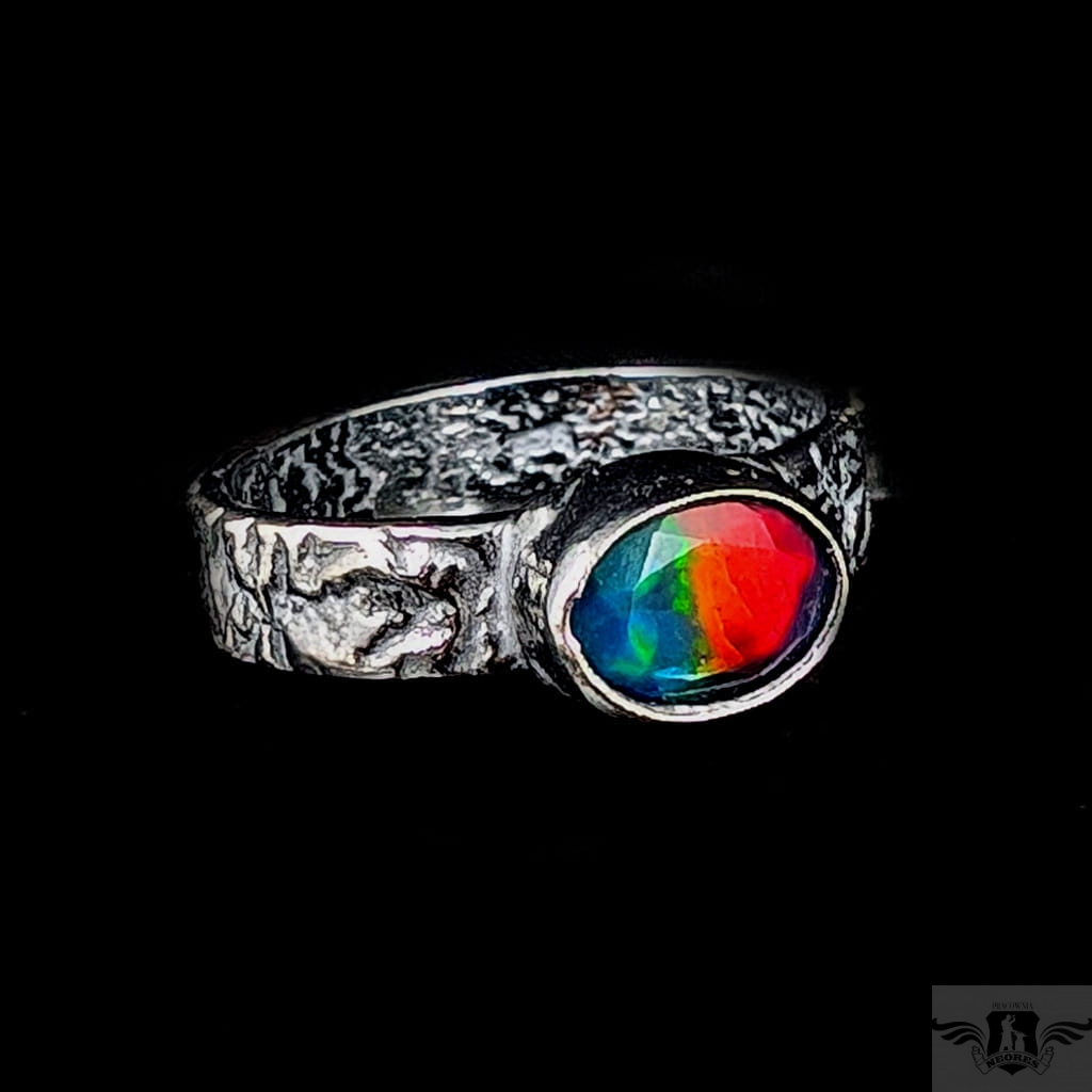 Pierścionek z przepięknym czarnym opalem etiopskim oprawionym w oksydowane srebro 925. Rozmiar jubilerski 18, Możliwe wykonanie podobnego. Obrączka ma 5 mm szerokości. Oprawa kamienia 9 x 7 mm. Waga 4,3 g.