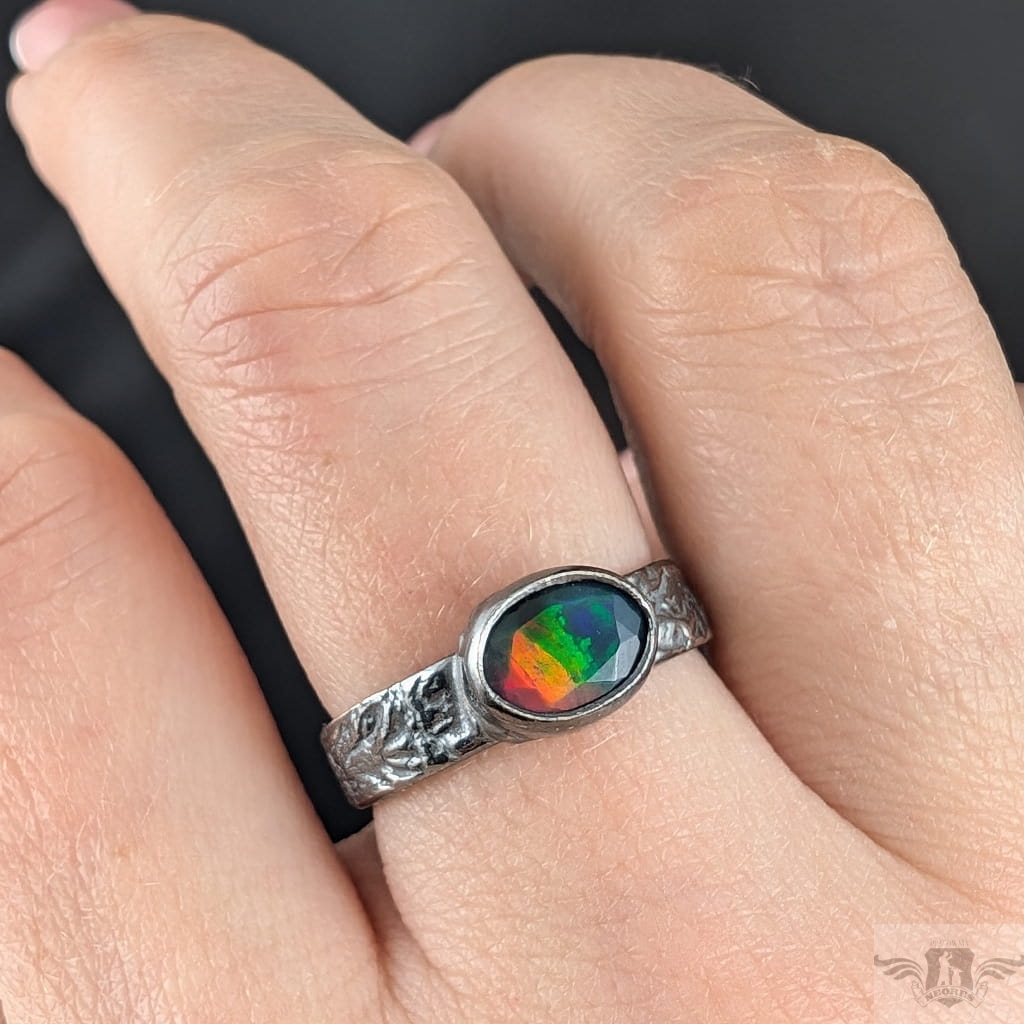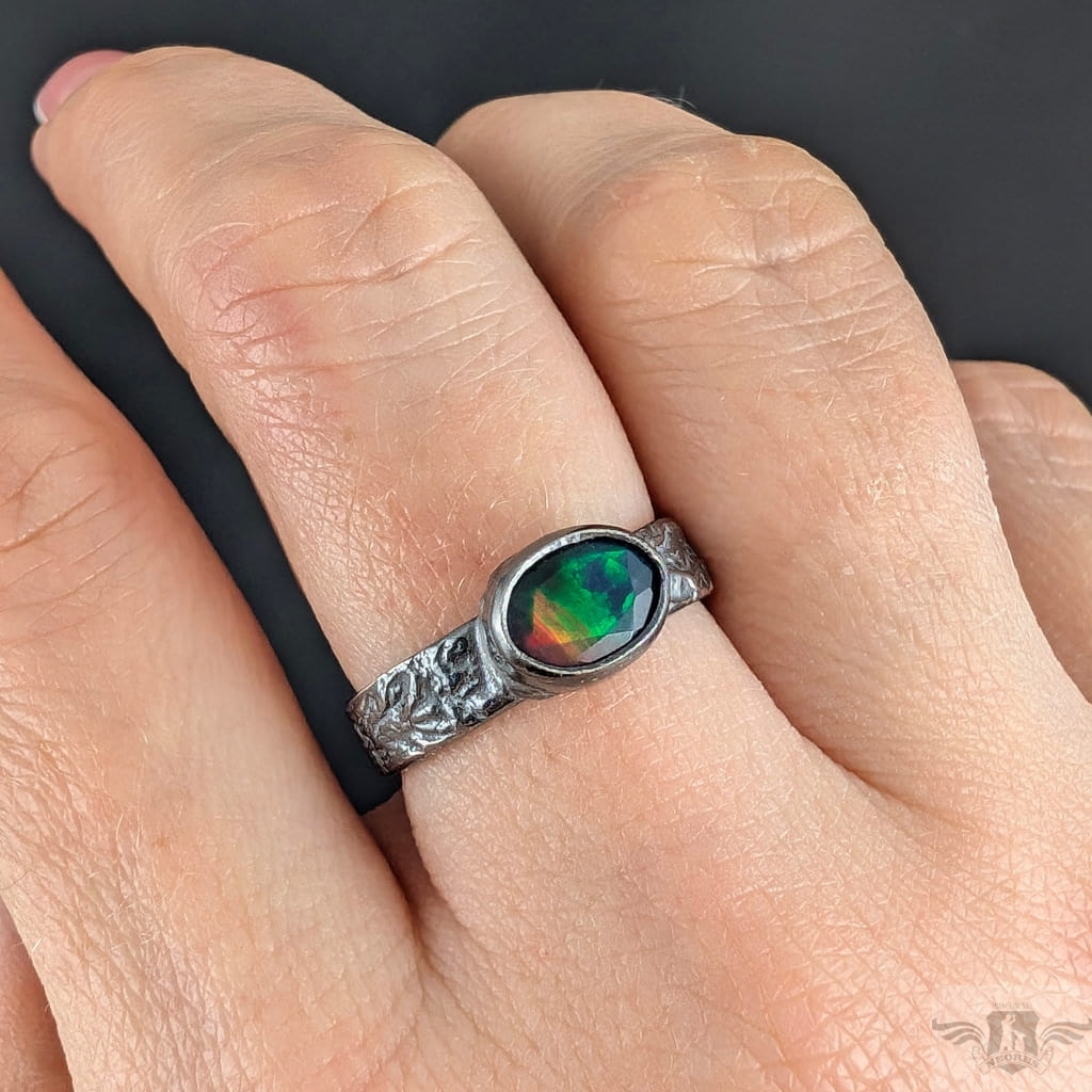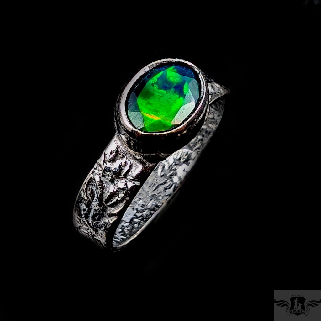 Pierścionek z przepięknym czarnym opalem etiopskim oprawionym w oksydowane srebro 925. Rozmiar jubilerski 18, Możliwe wykonanie podobnego. Obrączka ma 5 mm szerokości. Oprawa kamienia 9 x 7 mm. Waga 4,3 g.