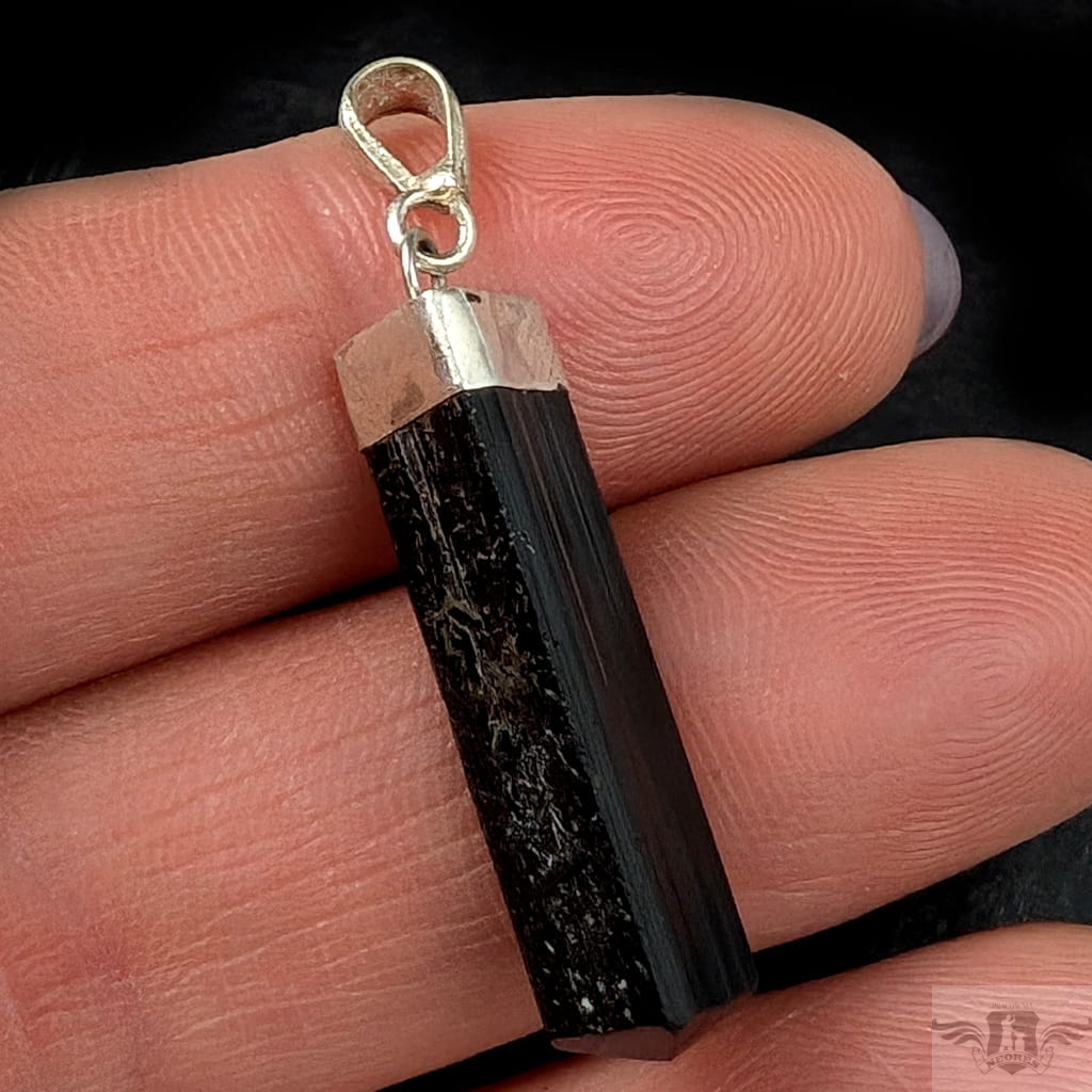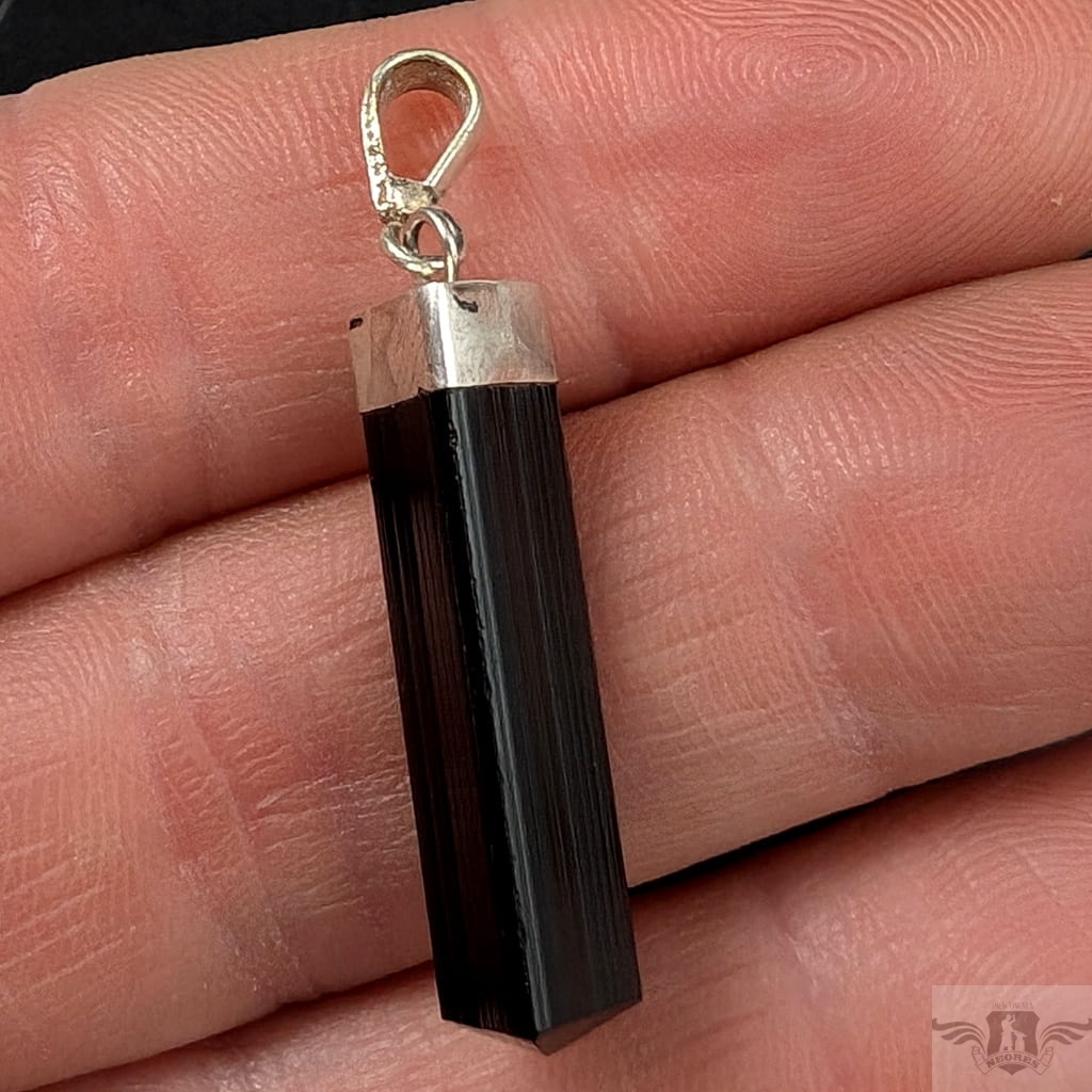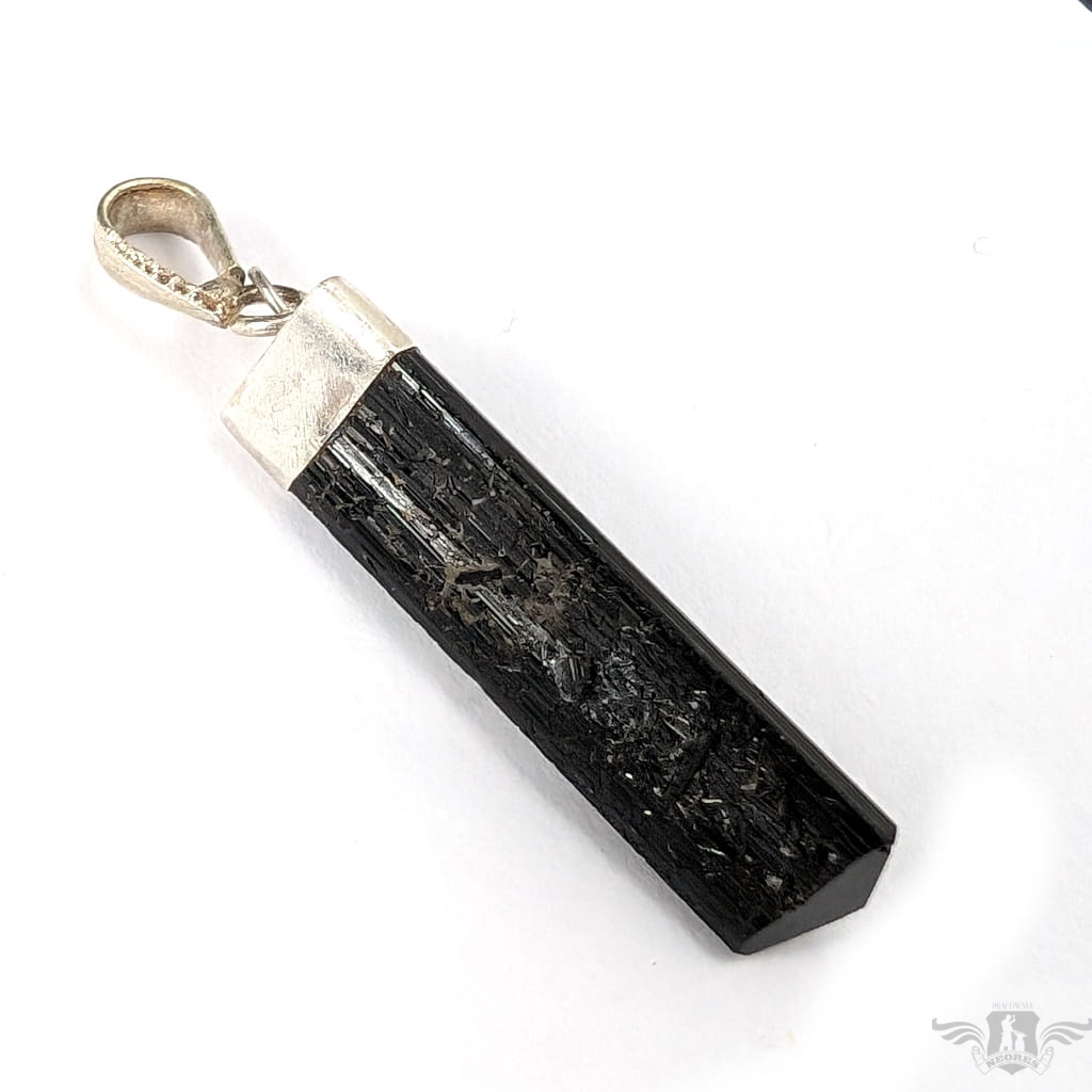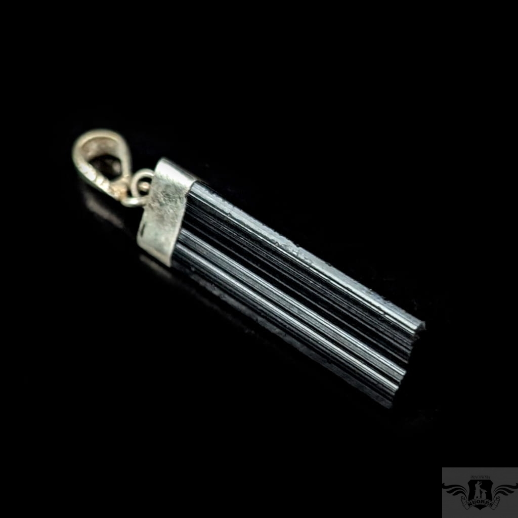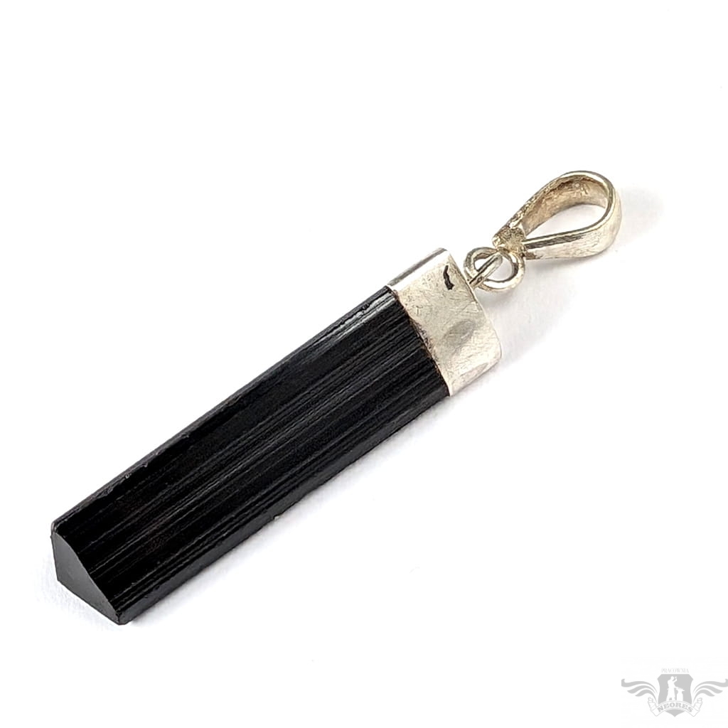 Wisiorek z oprawionym w srebro o pr. 925 czarnym turmalinem. Wymiary kamienia 26 x 6 mm. Z krawatką długosć 37 mm. Wisiorek waży 3 gramy, zostanie wysłany w ozdobnym pudełeczku.