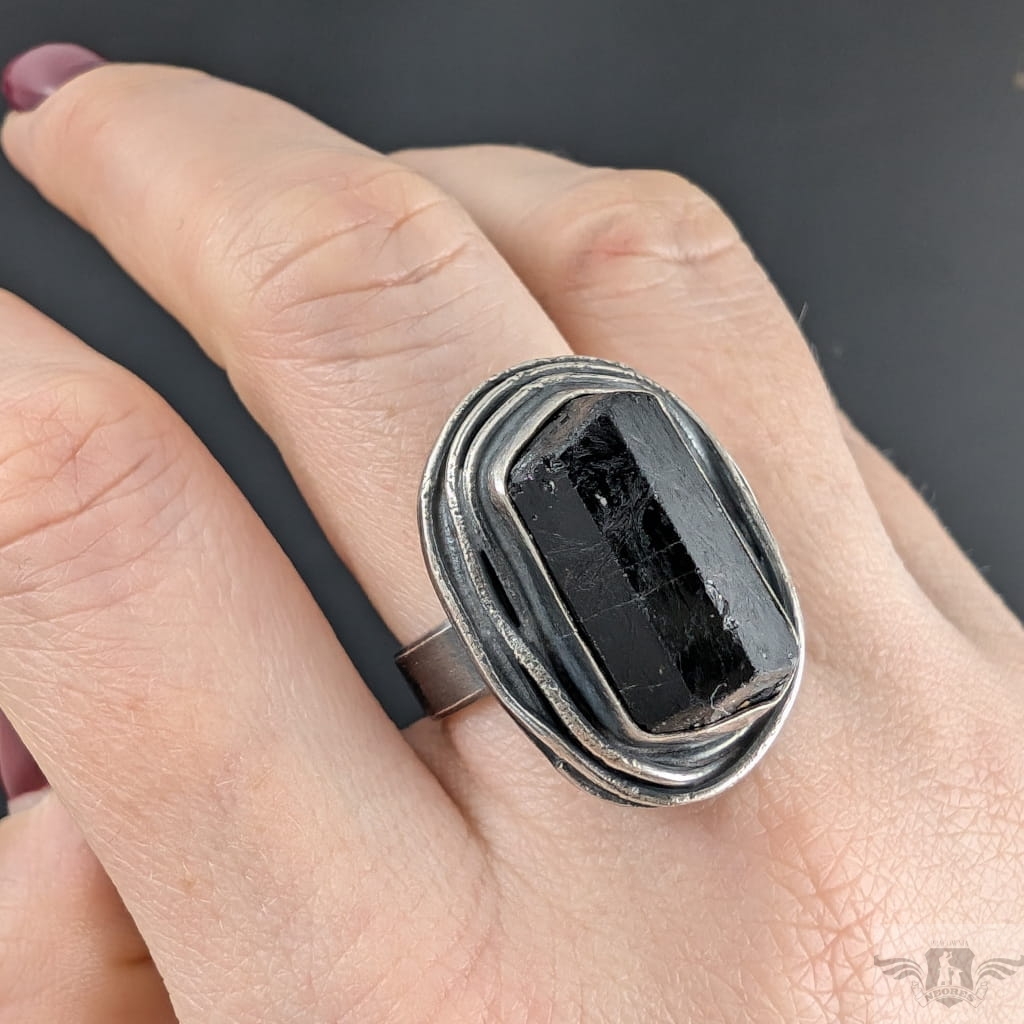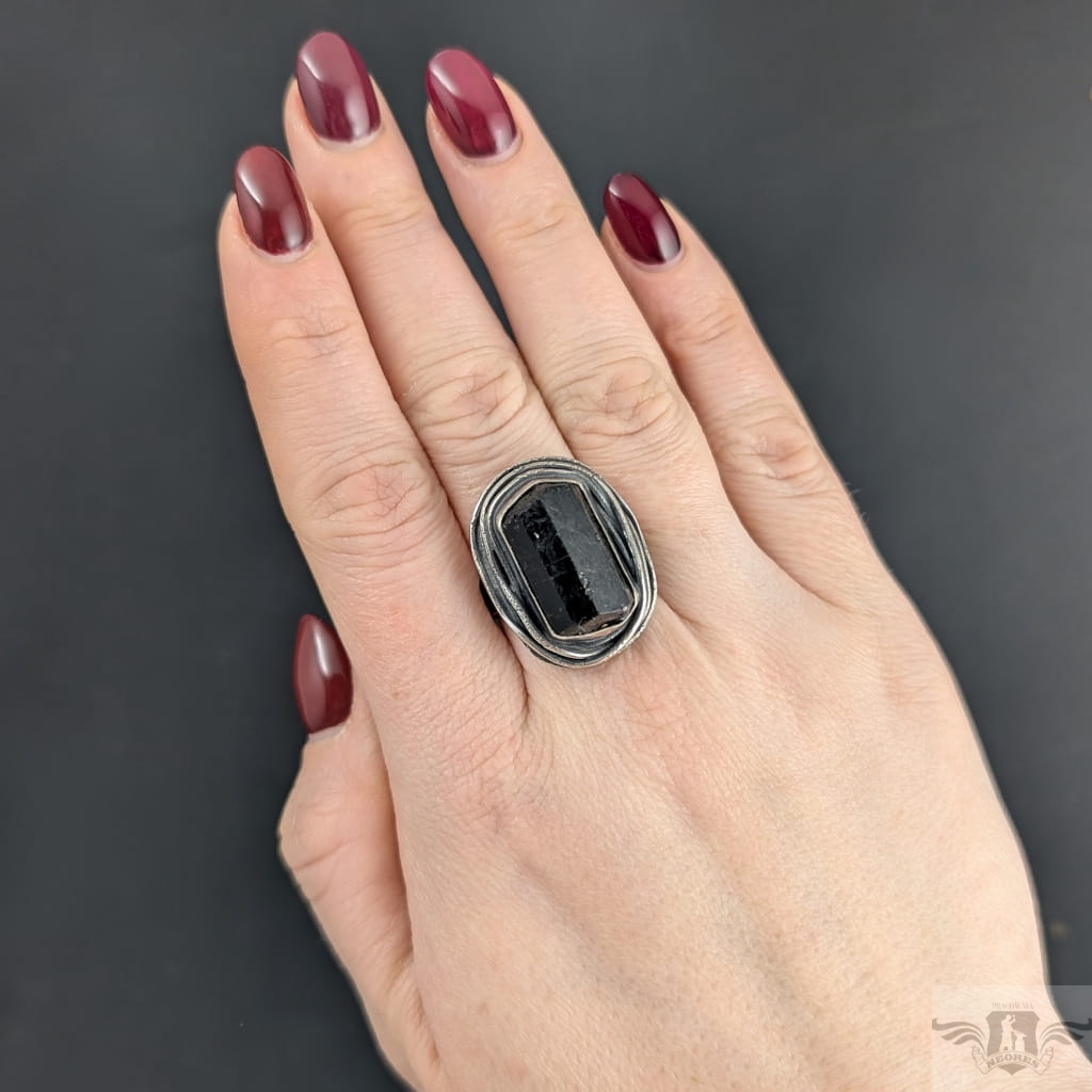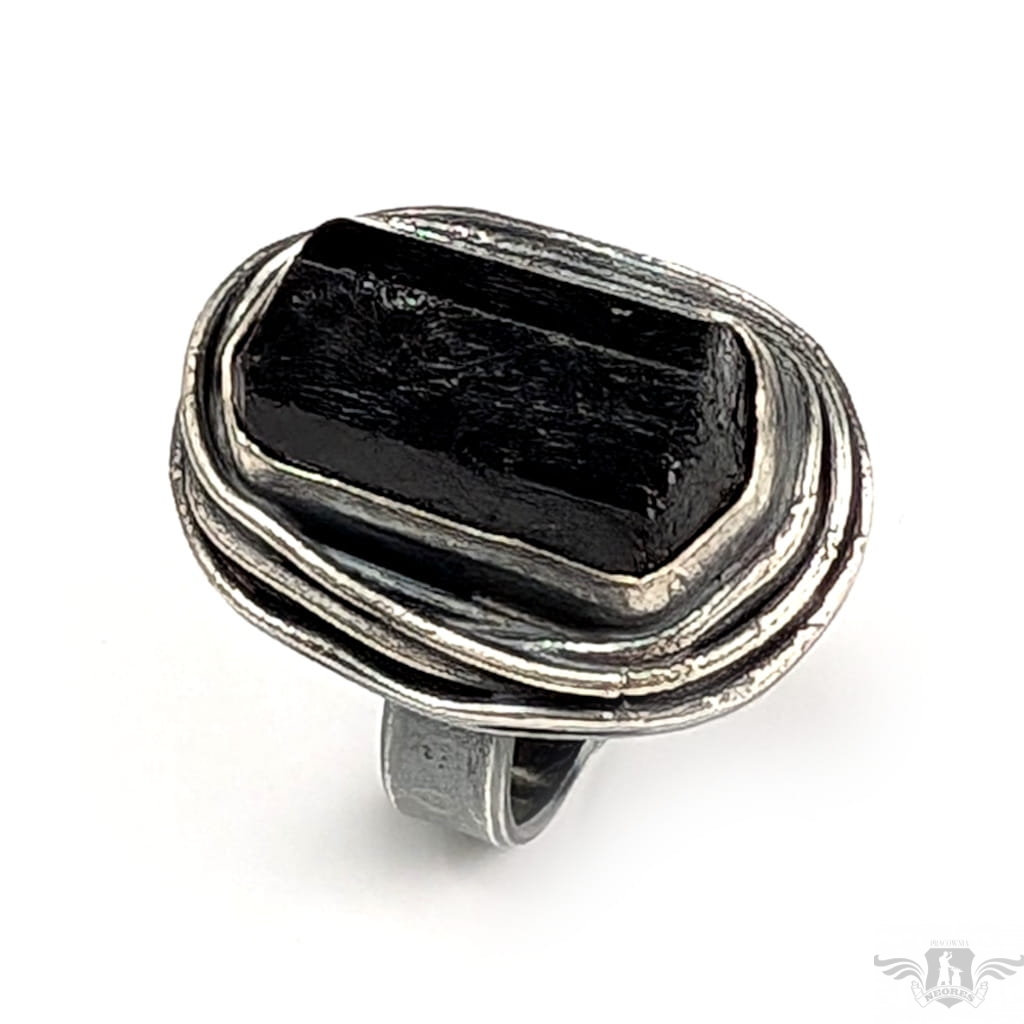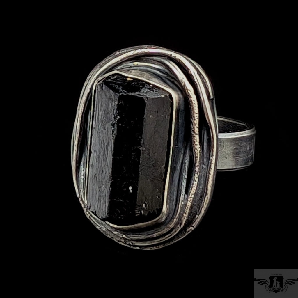 Pierścień z oprawionym w oksydowane srebro o pr. 925 czarnym, surowym turmalinem. Wymiary oprawy kamienia 28 x 21 mm. Szerokość obrączki 5 mm, rozmiar jubilerski 17, mogę powiększyć na max 18. Pierścień waży 16 gramów, zostanie wysłany w ozdobnym pudełeczku.