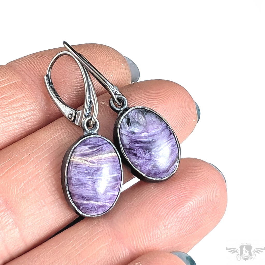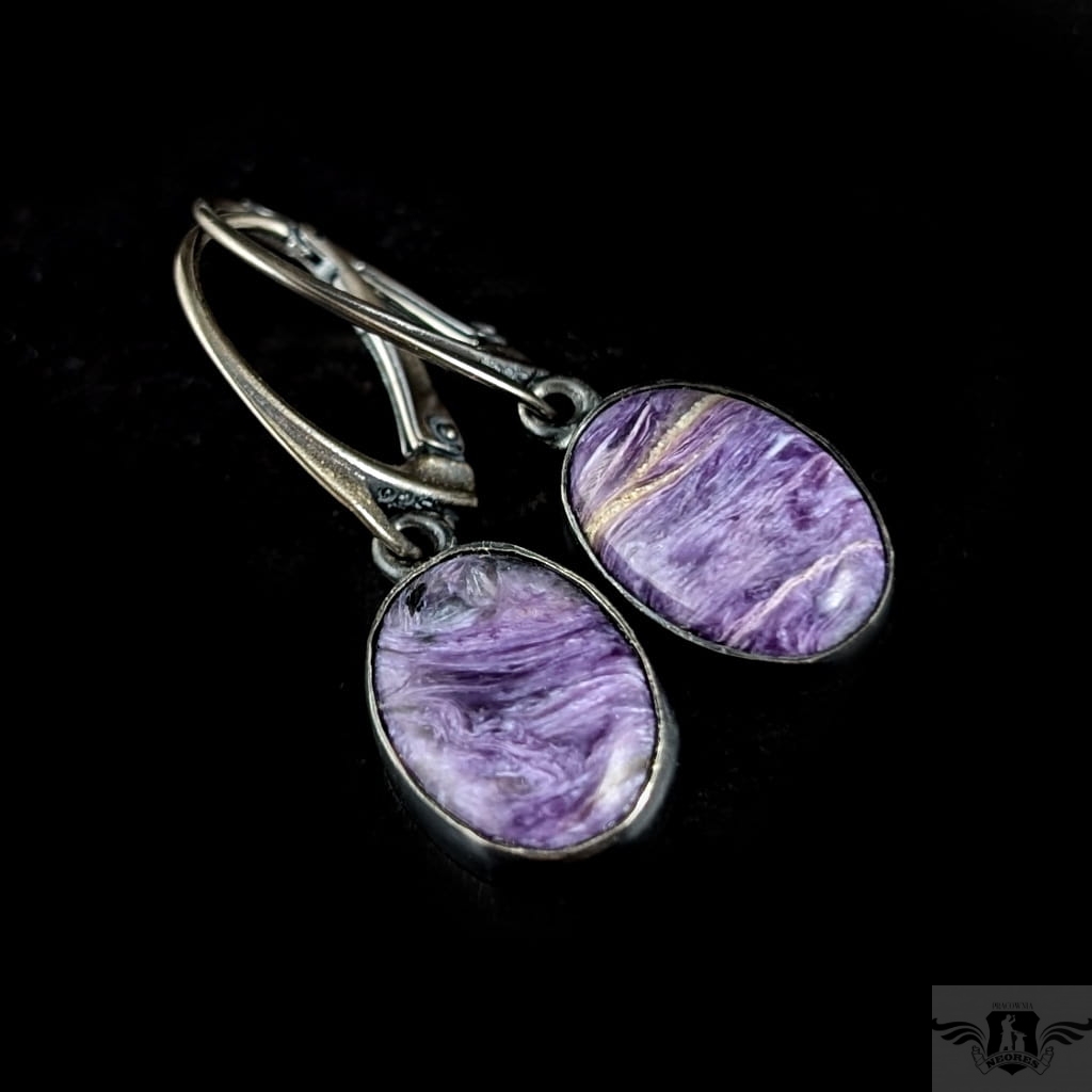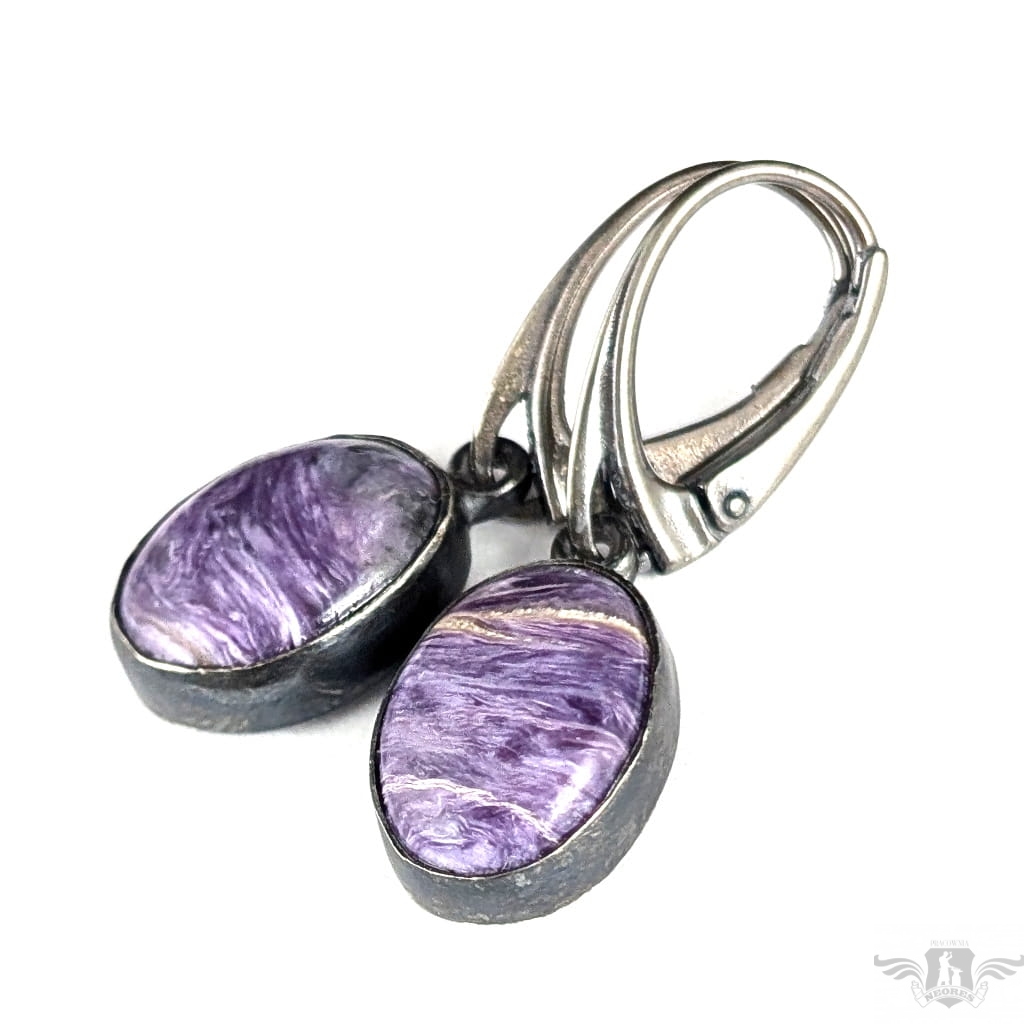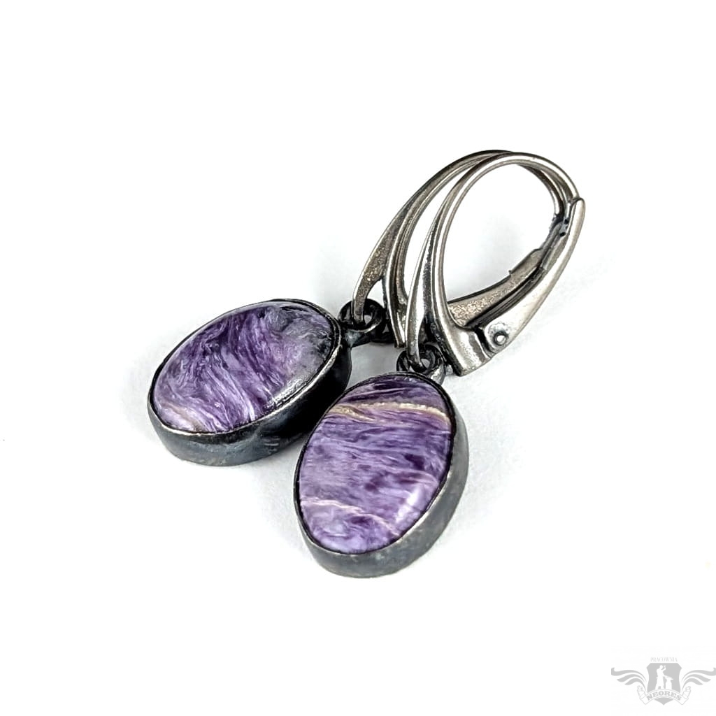 Śliczne czaroity oprawione w oksydowane srebro próby 925. Wymiary oprawy 13 x 11 mm. Gługość z biglami 32 mm. Waga jednego kolczyka 2.6 g. Zapakowane w ozdobne pudełeczko