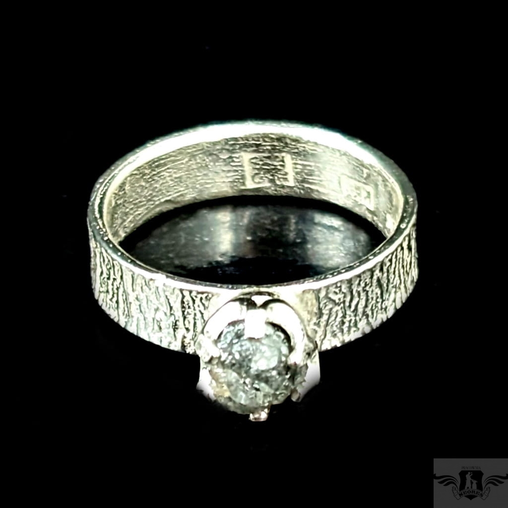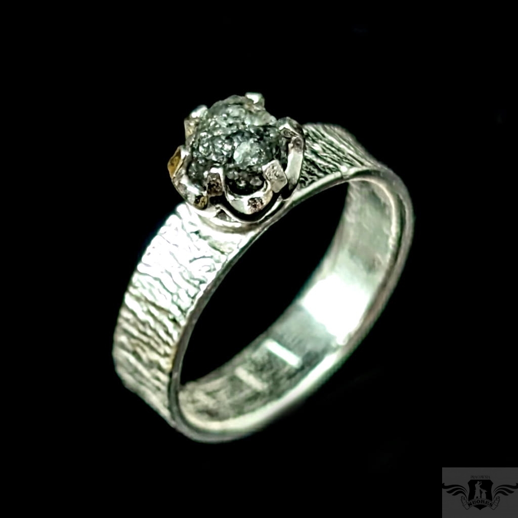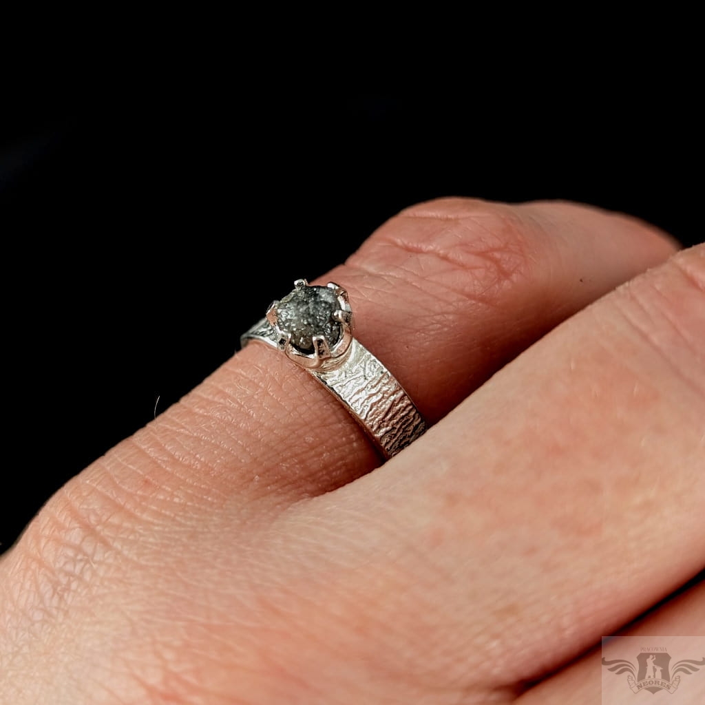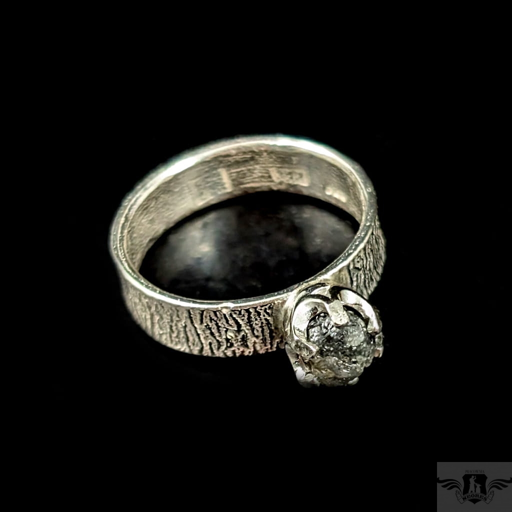 Piękny i oryginalny pierścionek z osadzonym w srebro próby 925 naturalnym, surowym diamentem. Oprawa kamienia ma średnicę 5 mm. Srebrna obrączka ma szerokość 4 mm, rozmiar jubilerski 10. Waga 3,14 g. Na zamówienie dostępne inne rozmiary jubilerskie. Wysłany w ozdobnym pudełeczku.