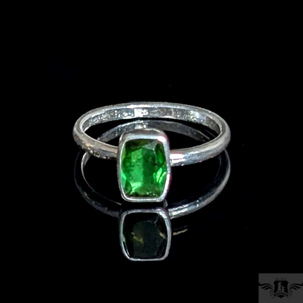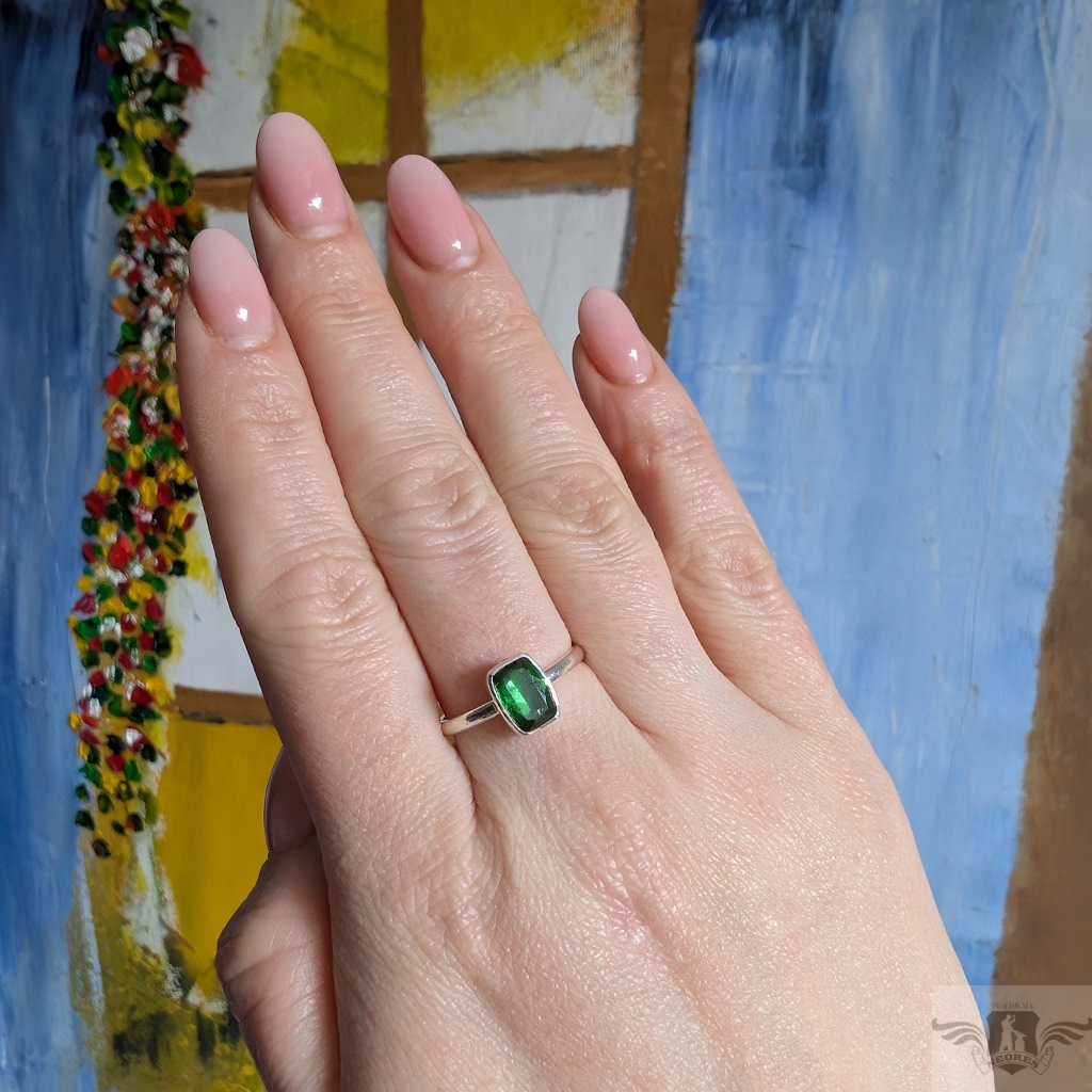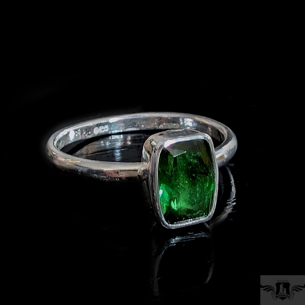 Retro pierścień z oprawionym w srebro próby 925 przepięknym zielonym turmalinem. Oprawa ma 9 x 7 mm. Rozmiar jubilerski 18, mogę powięszyć na max. 19. Waga 2,6grama. Pierścień zapakowany w ozdobne pudełeczko.