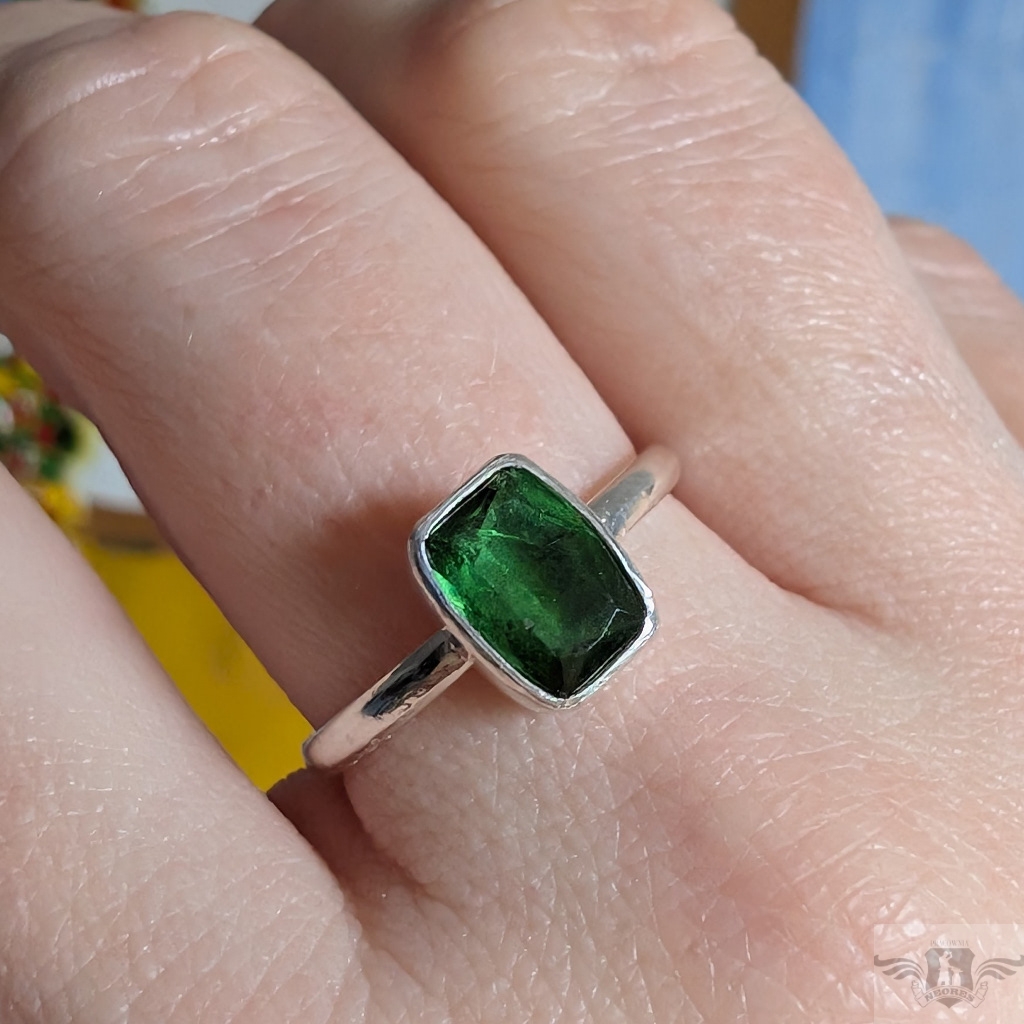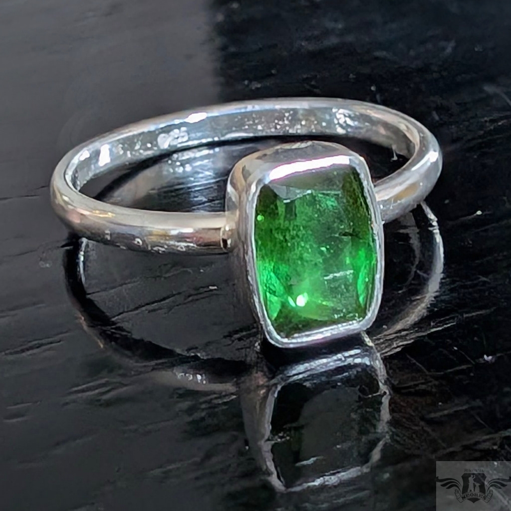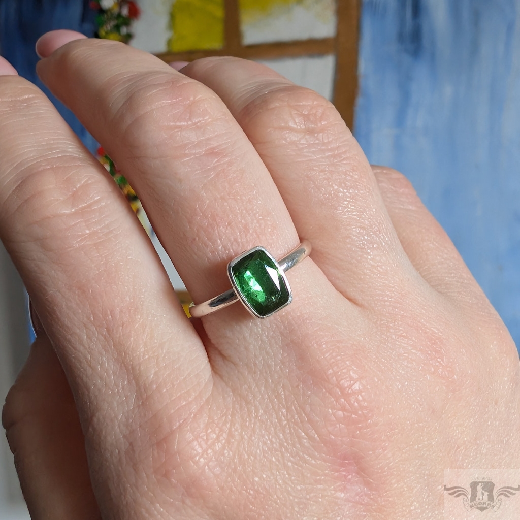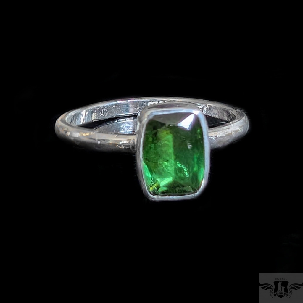 Retro pierścień z oprawionym w srebro próby 925 przepięknym zielonym turmalinem. Oprawa ma 9 x 7 mm. Rozmiar jubilerski 18, mogę powięszyć na max. 19. Waga 2,6grama. Pierścień zapakowany w ozdobne pudełeczko.