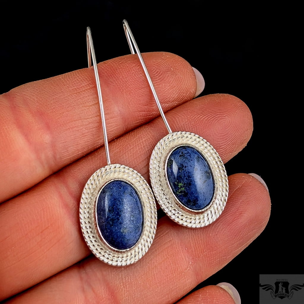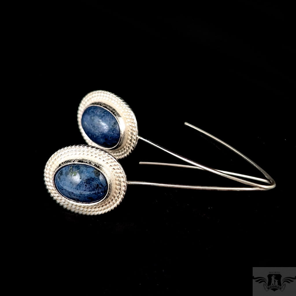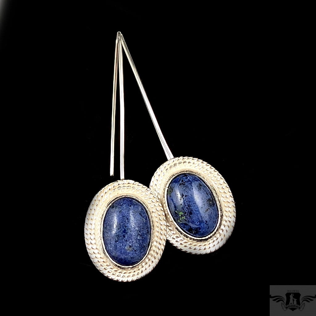 Kolczyki wykonane ze srebra próby 925 oraz pięknych, rzadkich dumortierytów. Długość całkowita z biglami 50 mm. Wymiary 19 x 16 mm. Waga jednego kolczyka 3,41 g. Kolczyki wysyłane zostaną w ozdobnym pudełeczku.