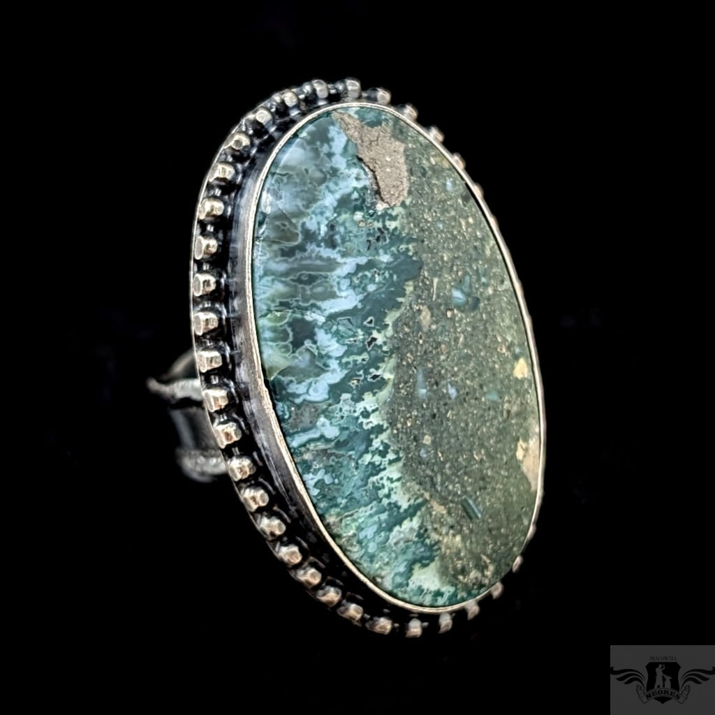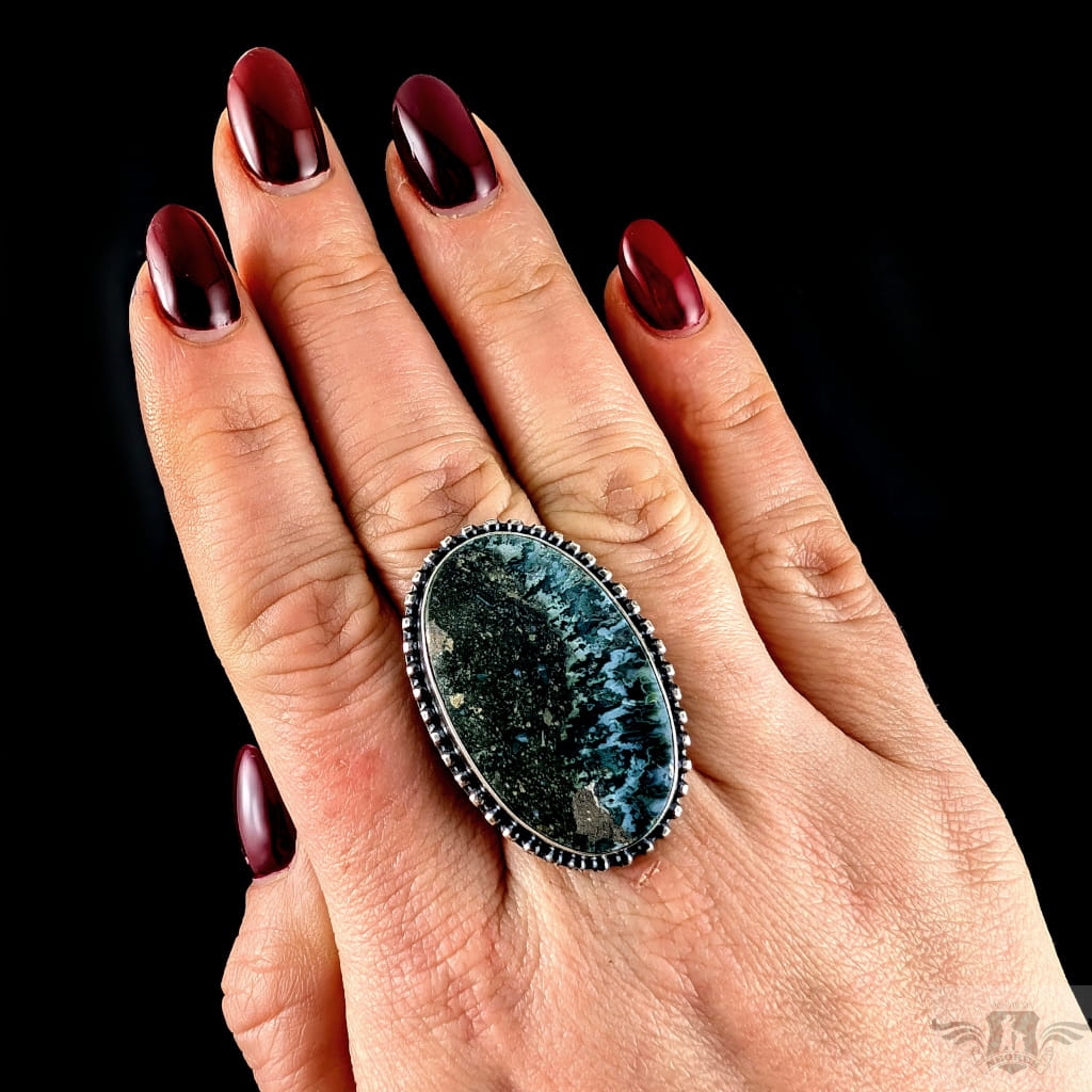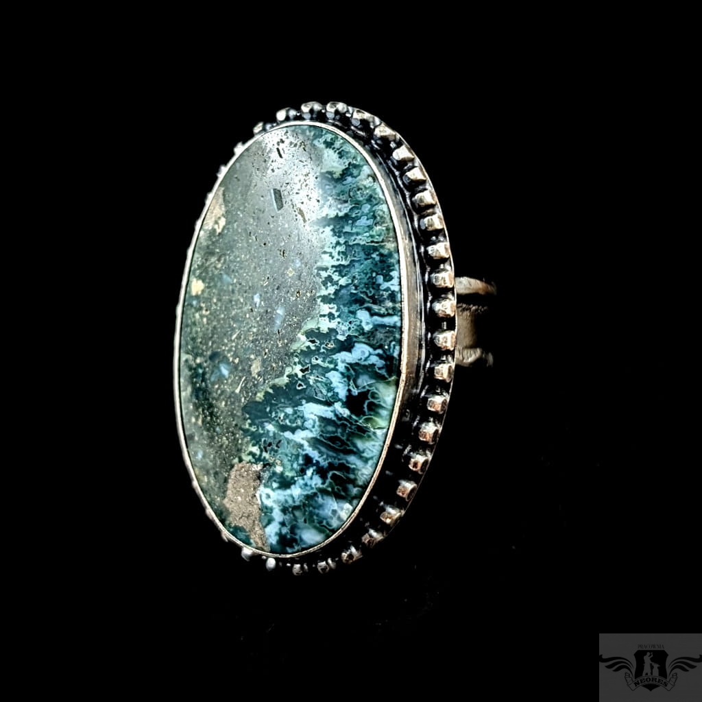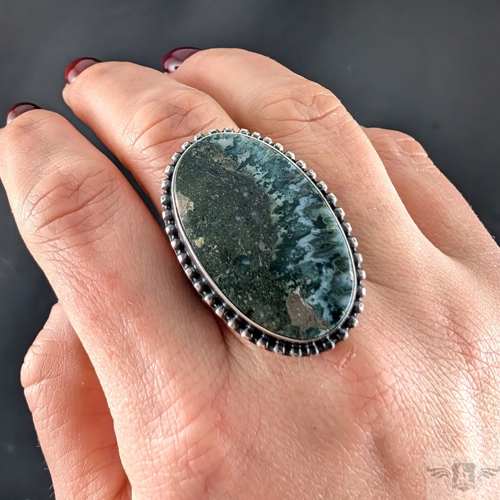 Pierścień z oprawionym przepięknym, naturalnym agatem mszystym . Kamień oprawiony w srebro pr. 925. Niezwykły pejzaż zaklęty w kamieniu. Rozmiar pierścionka 17, mogę powiększyć na max.rozmiar 18. Wymiary oprawy 37x 24 mm,, waga 15 g, obrączka szer. 7 mm. Pierścień będzie zapakowany w ozdobne pudełeczko.
