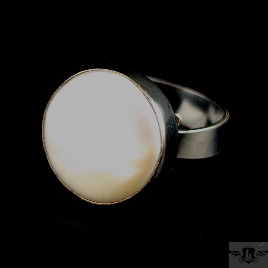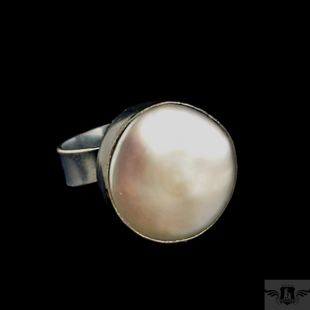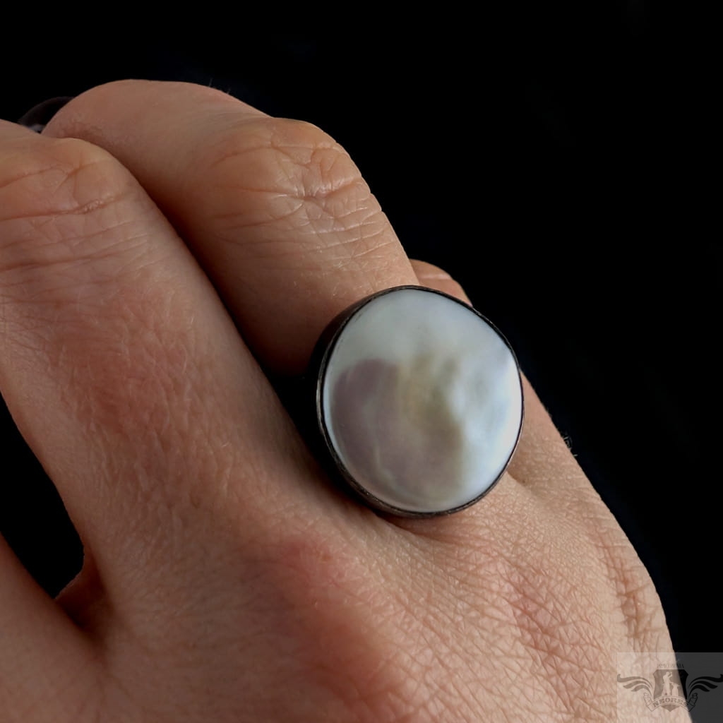 Pierścień wykonany z oksydowanego srebra próby 925 z oprawioną okazałą, piękną perłą słodkowodną. Ponadczasowa elegancja, klasyka z nutą awangardy. Wymiary : średnica 18 mm, waga pierścienia 7,2 g. Rozmiar jubilerski regulowany w szerokim zaresie 12-28 Szerokość obrączki to 5 mm.