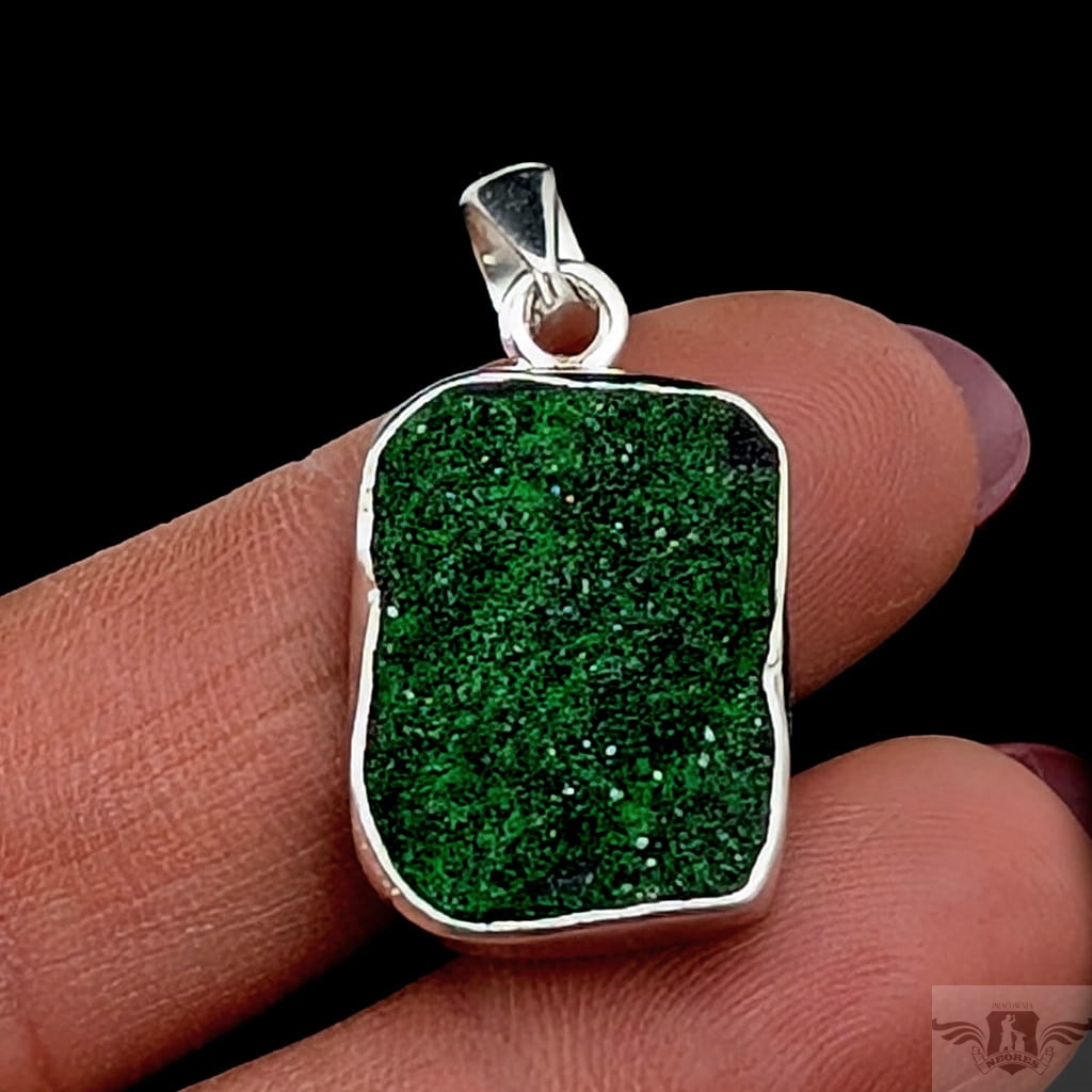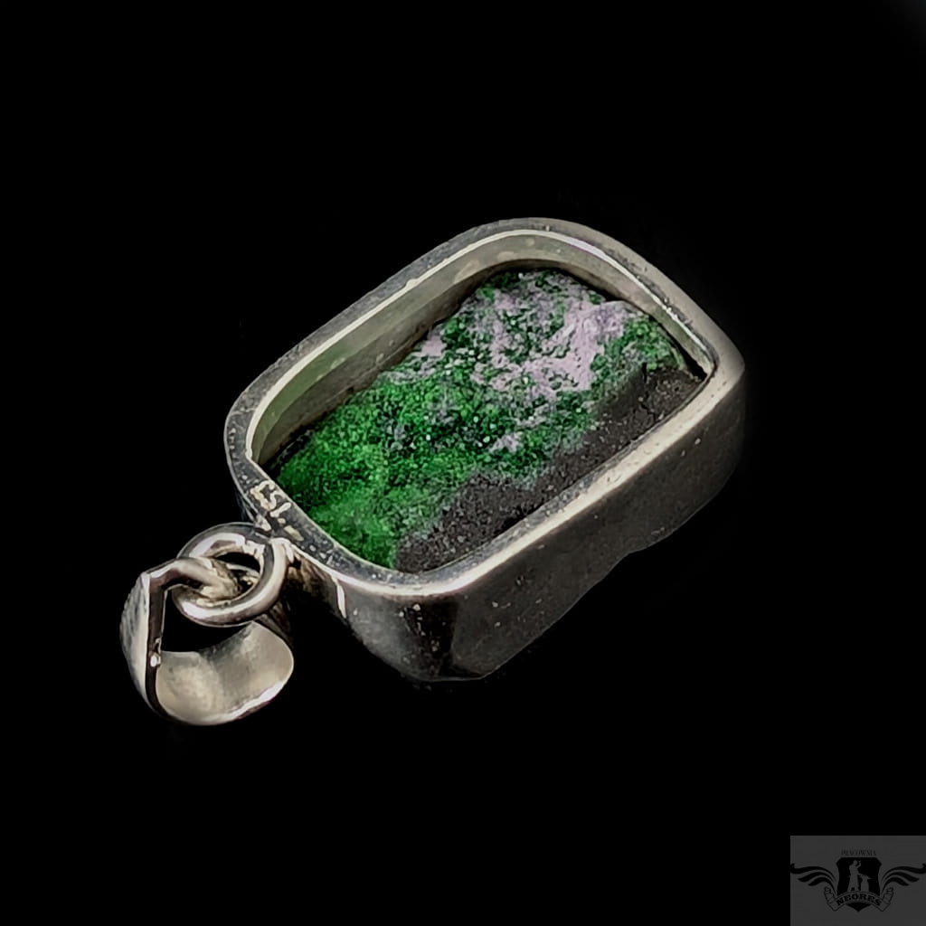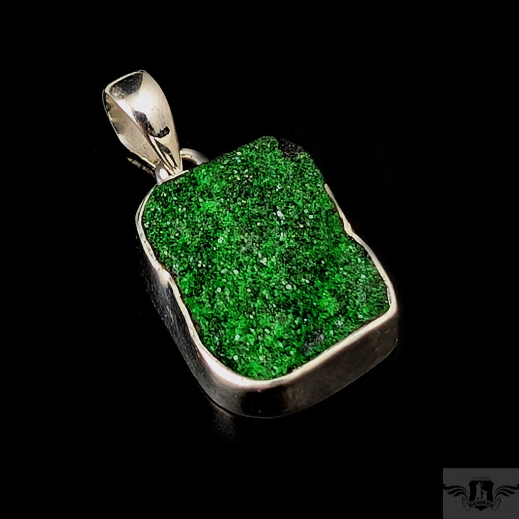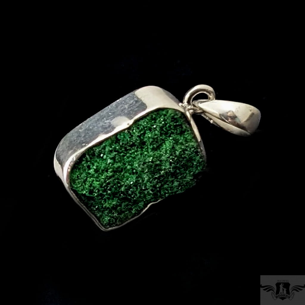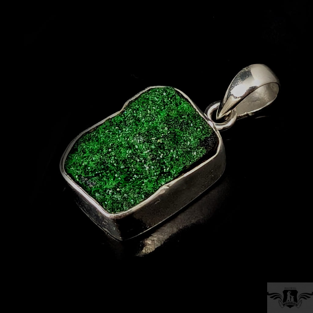 Uwarowit- unikalny i piękny, bardzo rzadko spotykany minerał, barwy szmaragdowozielonej, trawiasto- lub ciemnozielonej. Wspaniała krystaliczna struktura. Uwarowit jest zielonym granatem o zjawiskowej krystalizacji, gratką dla kolekcjonerów ze względu na coraz trudniejsze pozyskanie. Minerał oprawiony w srebro próby 925. Wymiary oprawy wisiora 20 x 16 mm, długość wraz z krawatką 32 mm. Waga wisiora 7,3 g. Wykonany przez dostawcę kamieni.