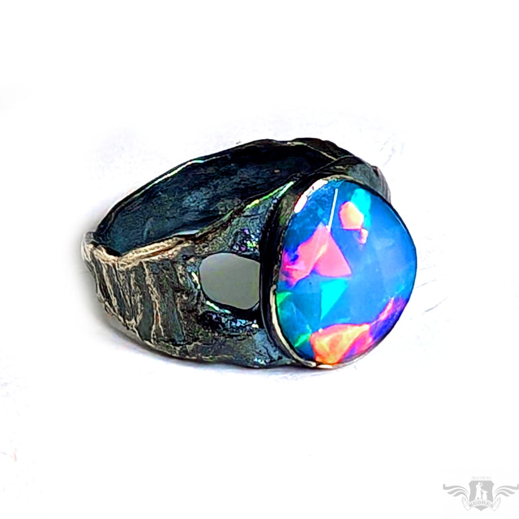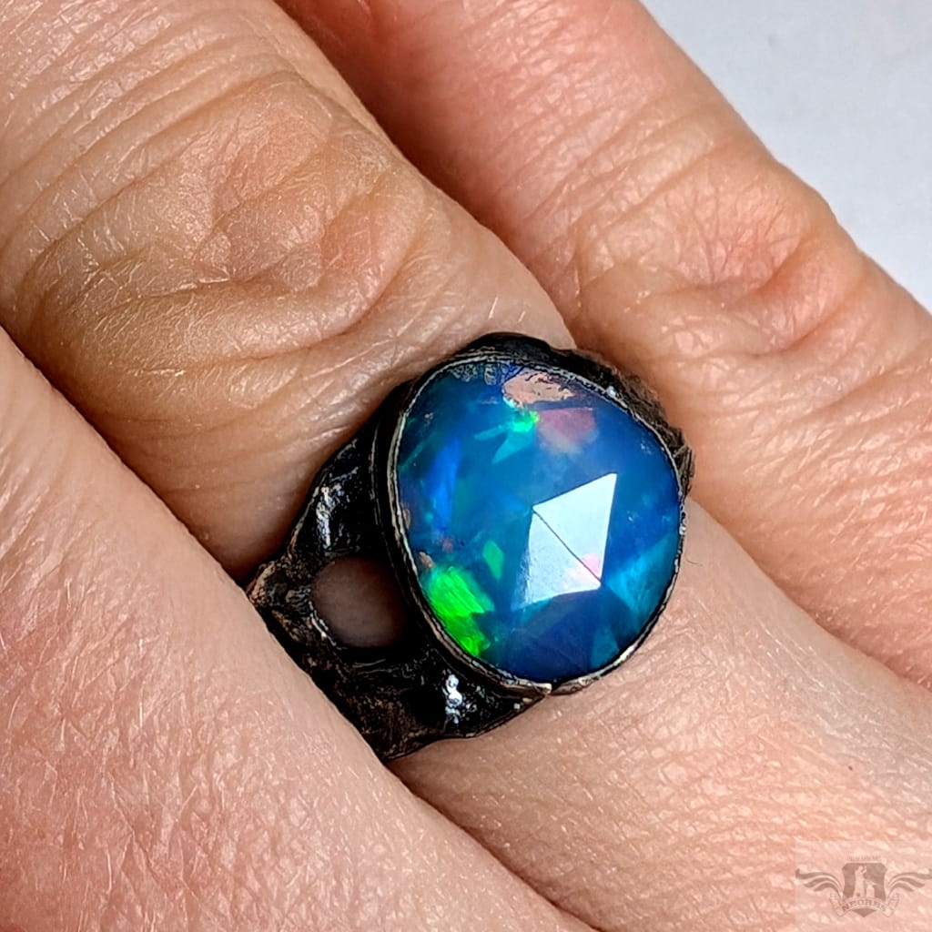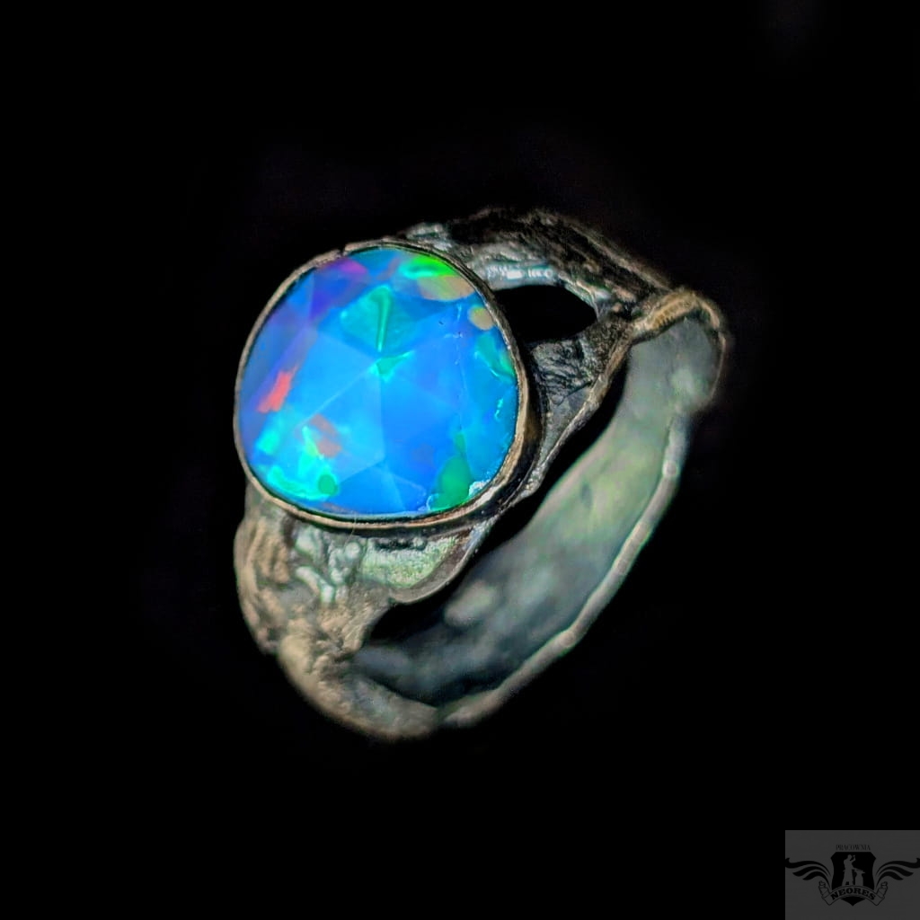 Piękny, surowy pierścień z oprawionym przepięknym opalem etiopskim o niezwykle kolorowej tafli dodatkowo spotęgowanej fasetowaniem na całej powierzchni. Kamień o wspaniałej opalizacji barw. Piękno nie do oddania na zdjęciu. Srebro pr.925, oksydowane. Wymiary oprawy 12 x 11 mm. Waga 4,4 g. Obrączka rozmiar jubilerski 17, mogę powiększyć na max 18. Obrączka ma 5 do 10 mm szerokości. Zapakowany w ozdobne pudełeczko.