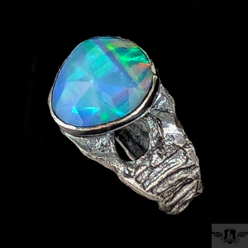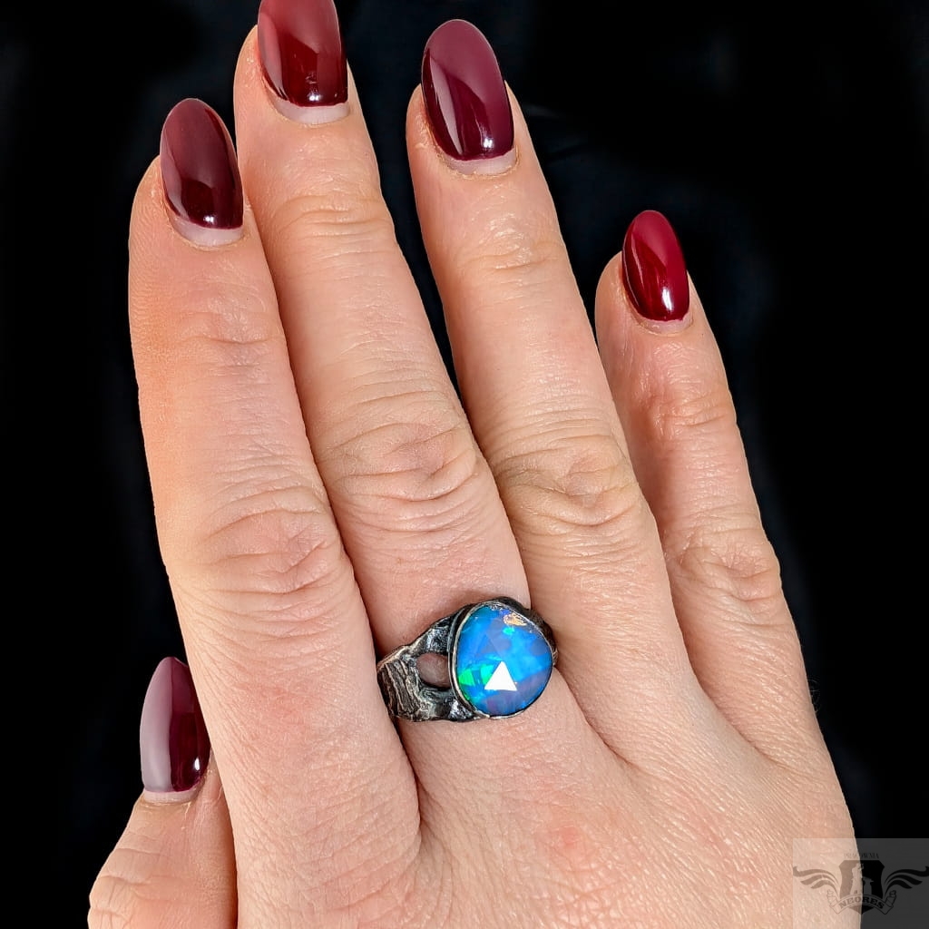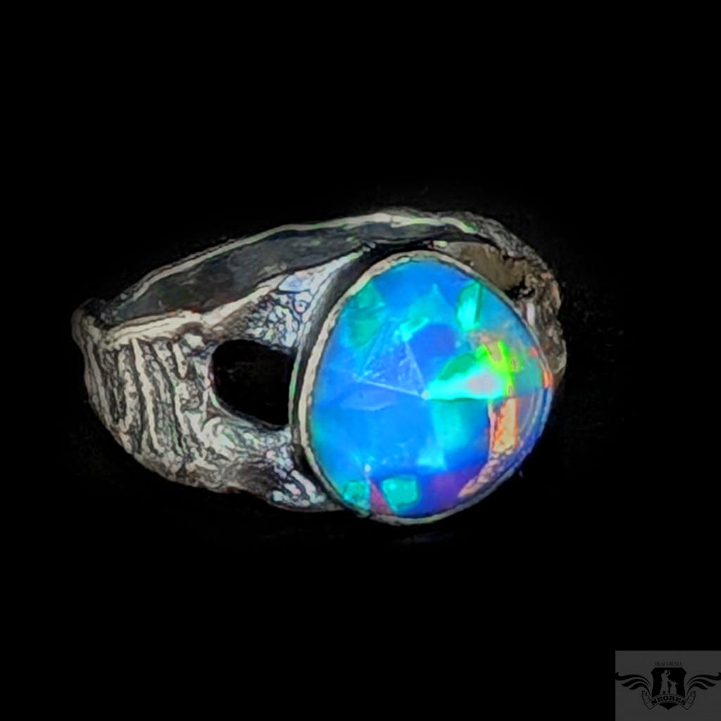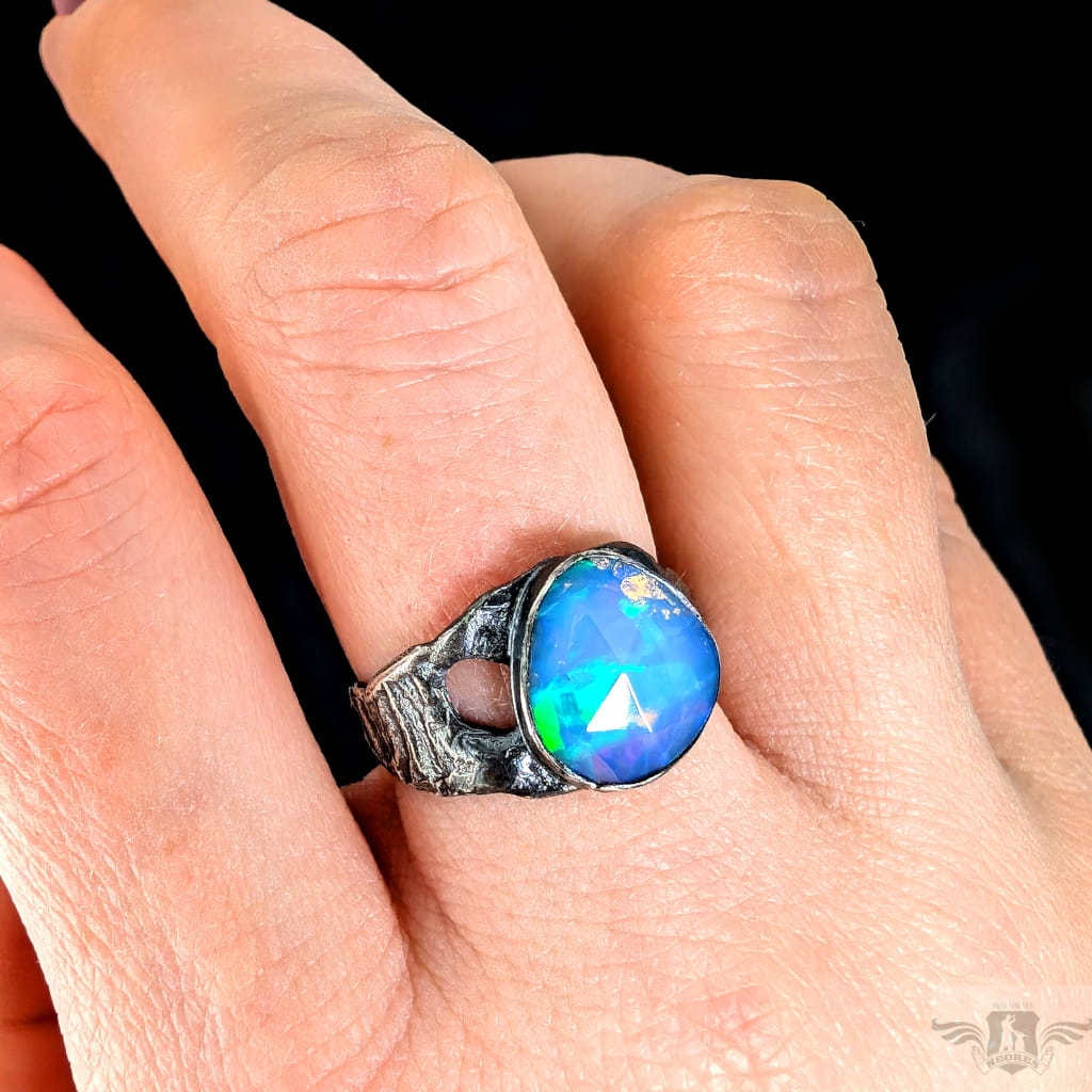 Piękny, surowy pierścień z oprawionym przepięknym opalem etiopskim o niezwykle kolorowej tafli dodatkowo spotęgowanej fasetowaniem na całej powierzchni. Kamień o wspaniałej opalizacji barw. Piękno nie do oddania na zdjęciu. Srebro pr.925, oksydowane. Wymiary oprawy 12 x 11 mm. Waga 4,4 g. Obrączka rozmiar jubilerski 17, mogę powiększyć na max 18. Obrączka ma 5 do 10 mm szerokości. Zapakowany w ozdobne pudełeczko.