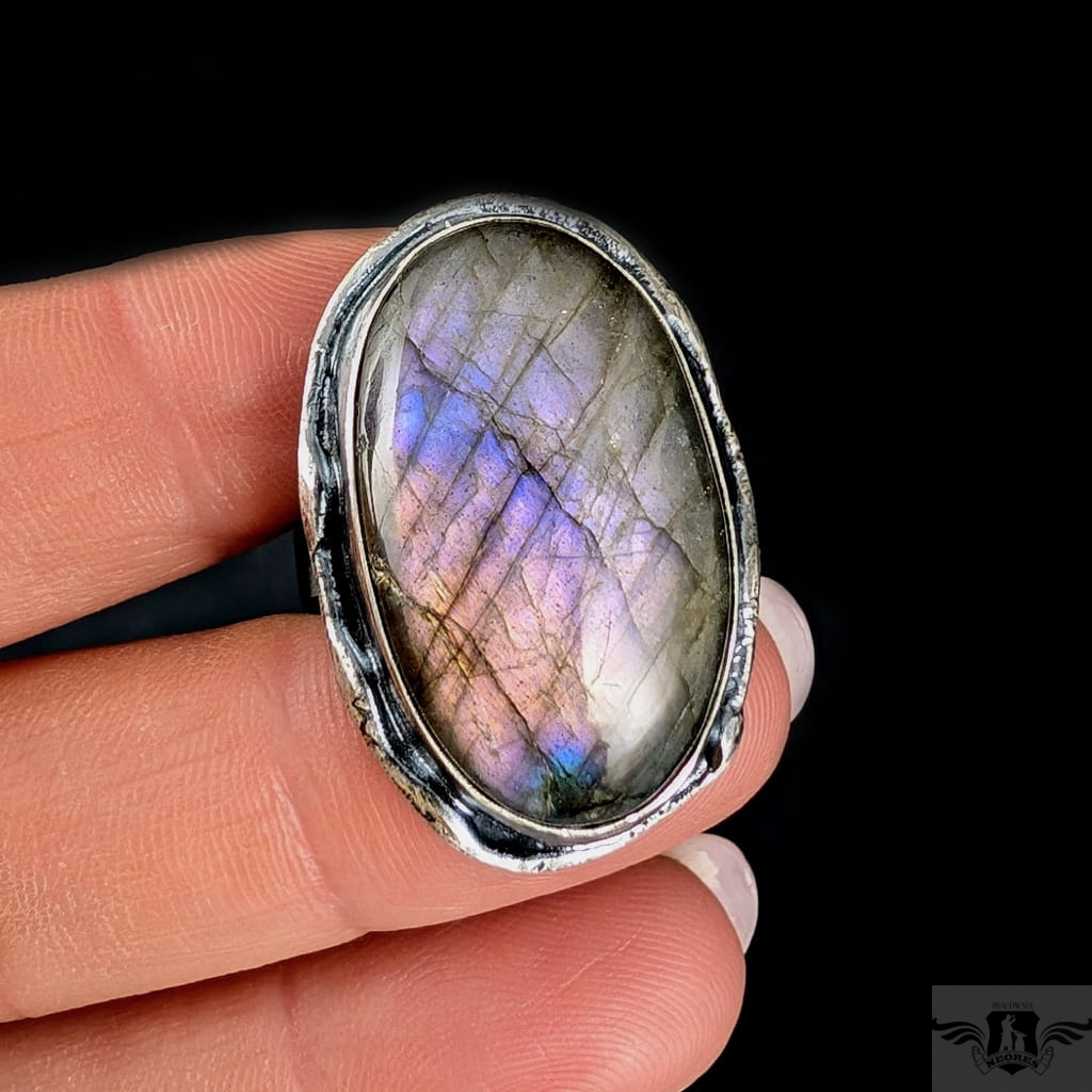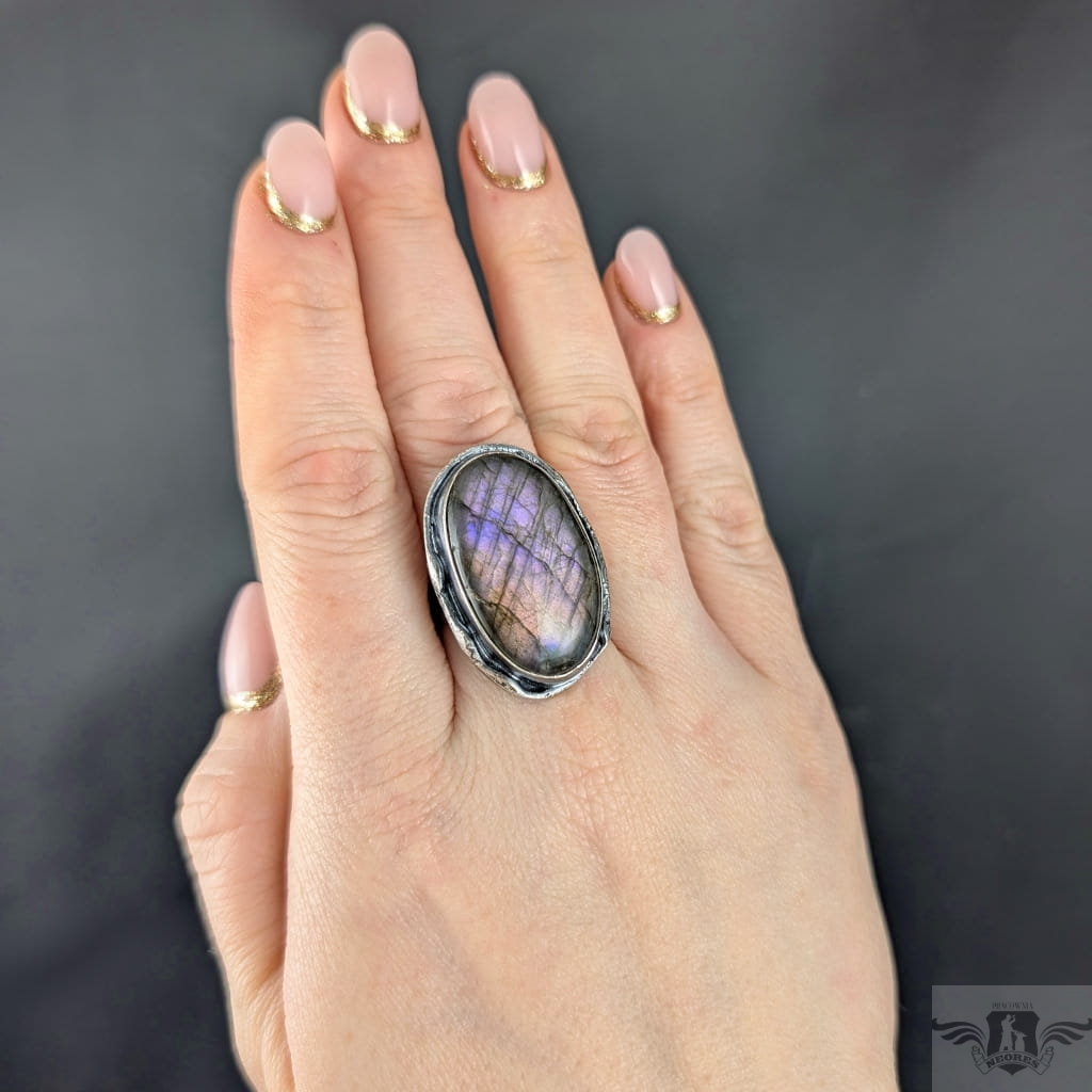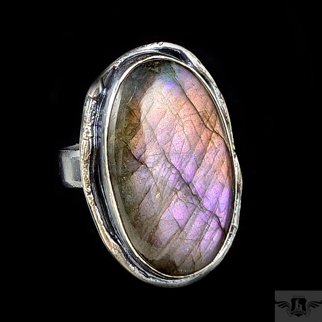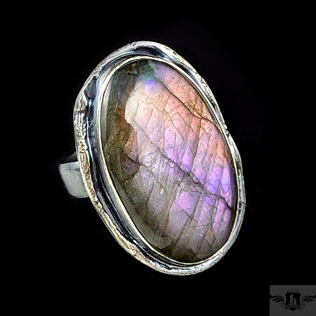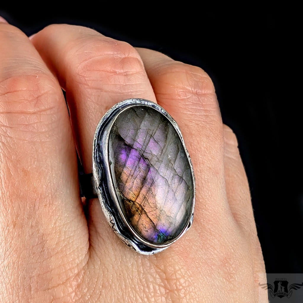 Pierścionek z oprawionym w srebro próby 925 naturalnym labradorytem o różowo-fioletowej tafli. Oksydowana, nakrapiana rama podkreśla urodę kamienia. Oprawa 32 x 22 mm, Rozmiar jubilerski regulowany w szerokim zakresie, po zakupie dopasuję na odpowiedni, proszę napisać. Obrączka ma szerokość 5 mm. Waga 14 g. Pierścień zostanie wysłany w ozdobnym pudełeczku.