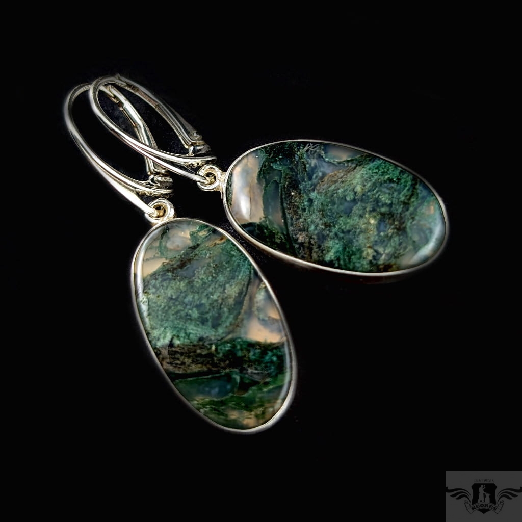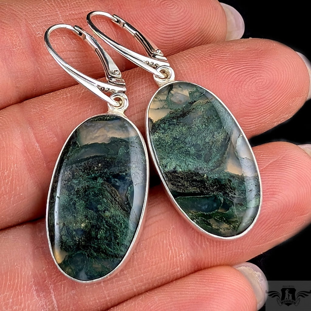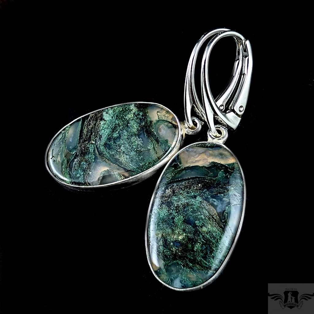 Kolczyki z oprawionymi w srebro próby 925 agatami mszystymi. Kamienie zjawiskowe, inkluzje wewnątrz wyglądają jak zaklęte pod skały i roślinność. Wymiary 27 x 13 mm, długość 43 mm. Waga jednego kolczyka 4,4 g. Kolczyki zostaną zapakowane w ozdobne pudełeczko.