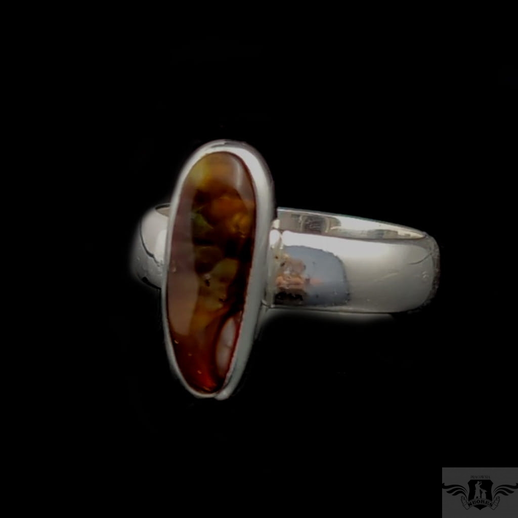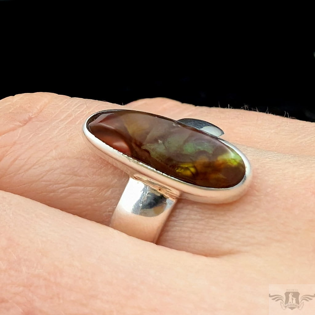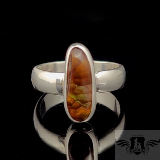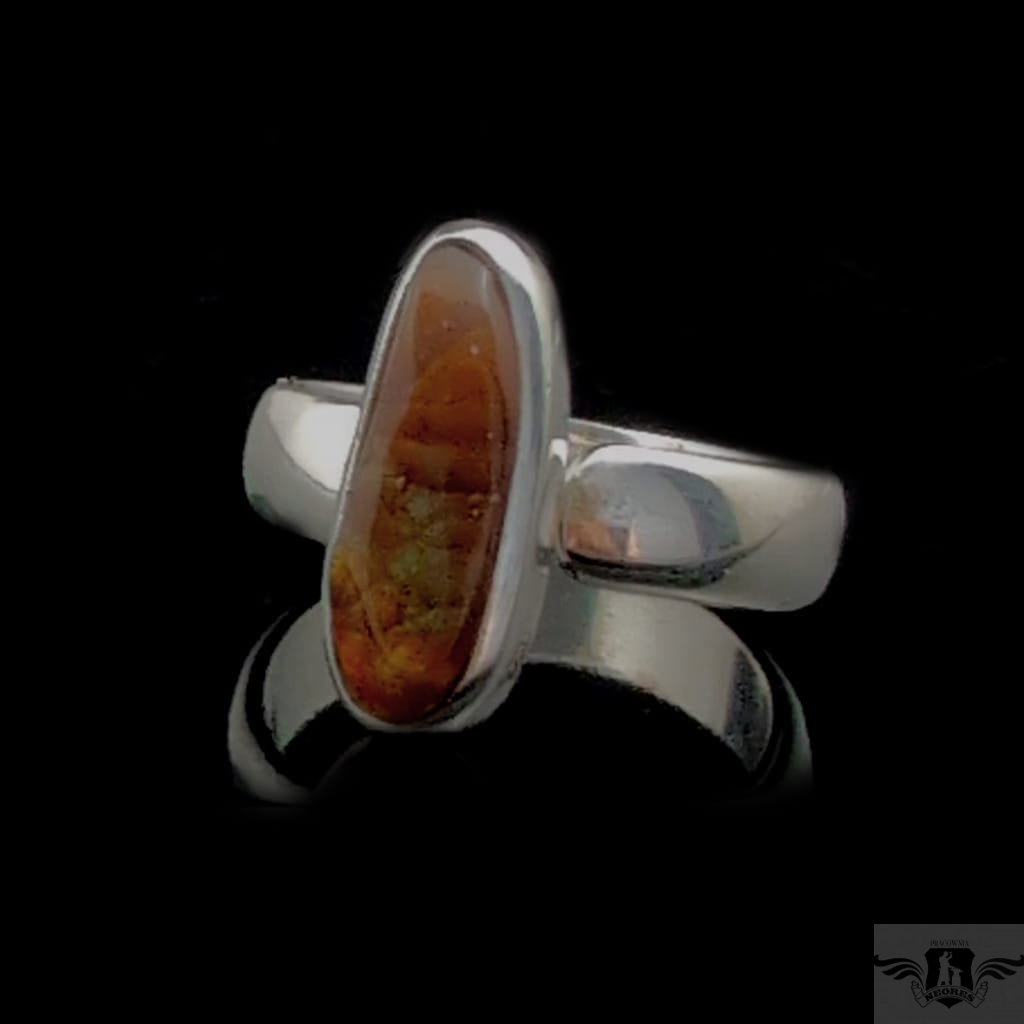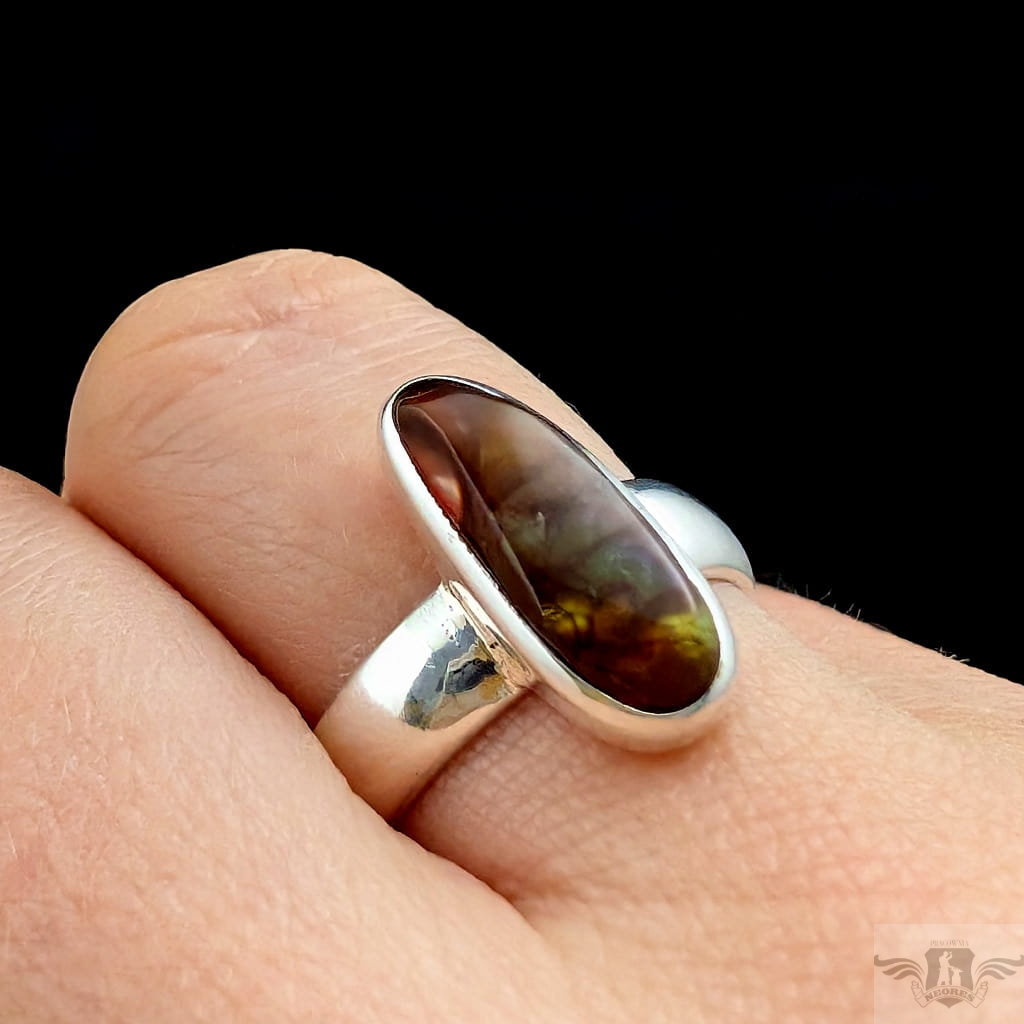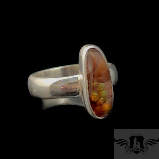 Rzadka, poszukiwana odmiana agatu, tzw. agat ognisty. Zjawisko iryzacji o podobnej do opalu czy ammolitu grze barw, która powstaje wskutek ugięcia i załamania światła na wrostkach żelaza. Tafla wyglądająca nieco jak smocza skóra. Kamień jest oprawiony w srebro próby 925, z obrączką o szerokości 5 mm. rozciętą z boku co umowżliwia regulację roziar w zakresie 15-18 po zakupie dopasuję na konkretny rozmiar. Wymiary oprawy Waga5 gramów. Zostanie zapakowany w ozdobne pudełeczko.