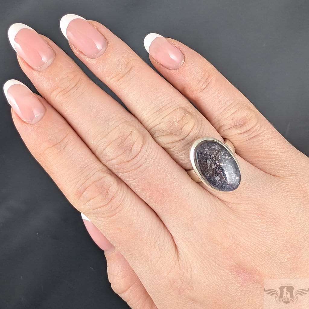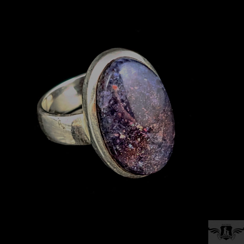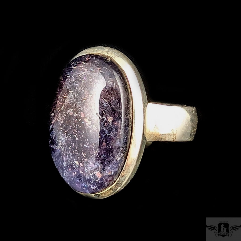 Pierścień wykonany ze srebra próby 925, który zdobi wyjątkowy okaz kamienia słonecznego w iolicie. Rzadki minerał wykazujący tzw.efekt awenturyzacji w postaci maleńkich mieniących się wrostów- łusek innych minerałów,np.hematytu. Niezwykle mienią się w słońcu. Ciekawe i atrakcyjne połączenie dwóch minerałów. Kamień ma oprawę 21 x 14 mm. Pierścionek w rozmiarze jubilerskim regulowanym w wąskim zakresie rozmiarów 14- 19. Proszę napisać na jaki dopasować. Waga 8 g. Wykonany przez dostawcę kamieni.