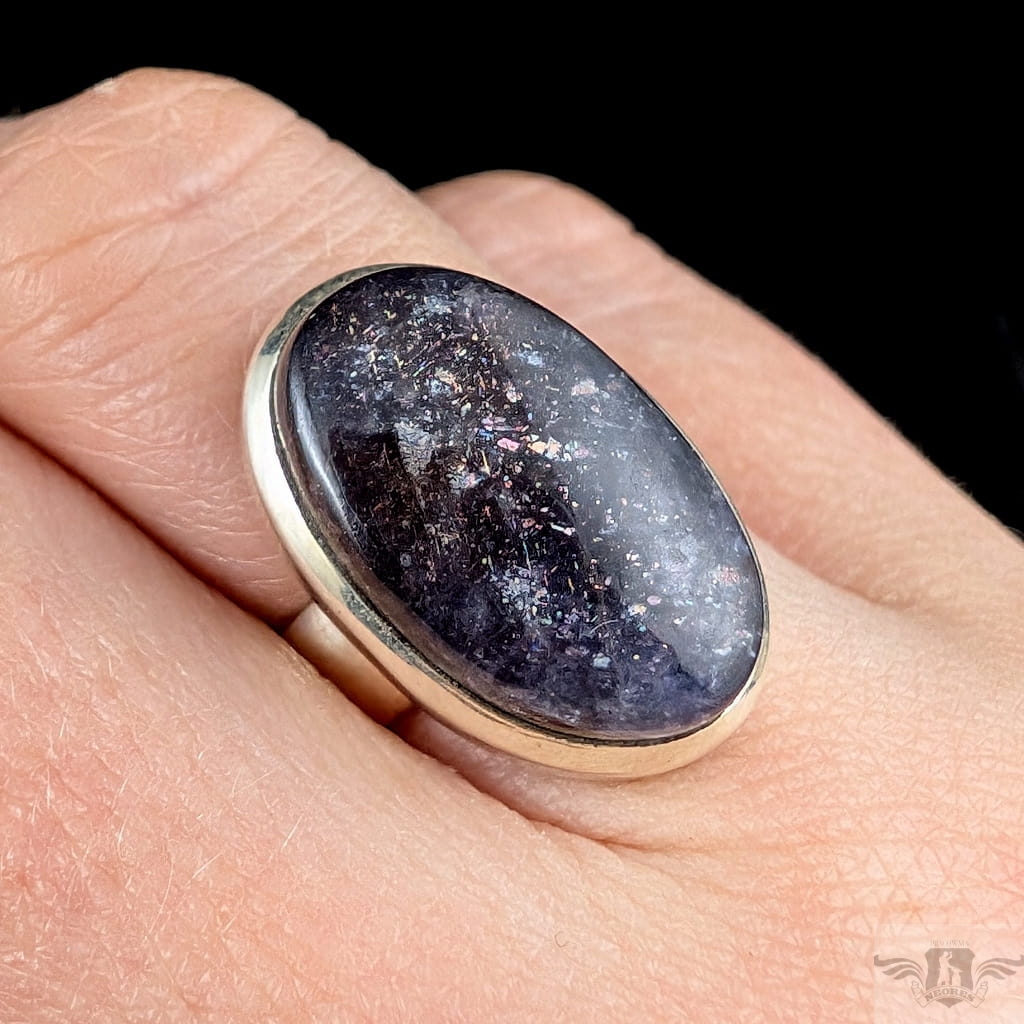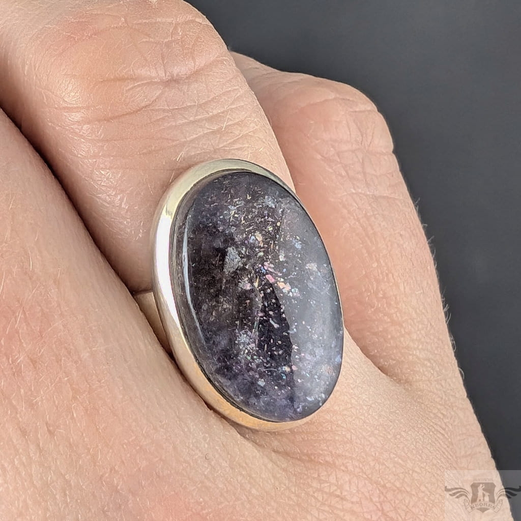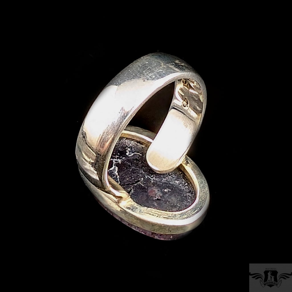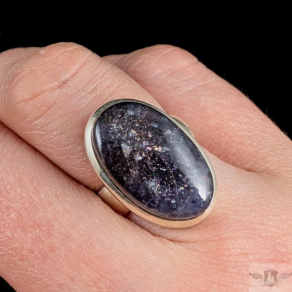 Pierścień wykonany ze srebra próby 925, który zdobi wyjątkowy okaz kamienia słonecznego w iolicie. Rzadki minerał wykazujący tzw.efekt awenturyzacji w postaci maleńkich mieniących się wrostów- łusek innych minerałów,np.hematytu. Niezwykle mienią się w słońcu. Ciekawe i atrakcyjne połączenie dwóch minerałów. Kamień ma oprawę 21 x 14 mm. Pierścionek w rozmiarze jubilerskim regulowanym w wąskim zakresie rozmiarów 14- 19. Proszę napisać na jaki dopasować. Waga 8 g. Wykonany przez dostawcę kamieni.