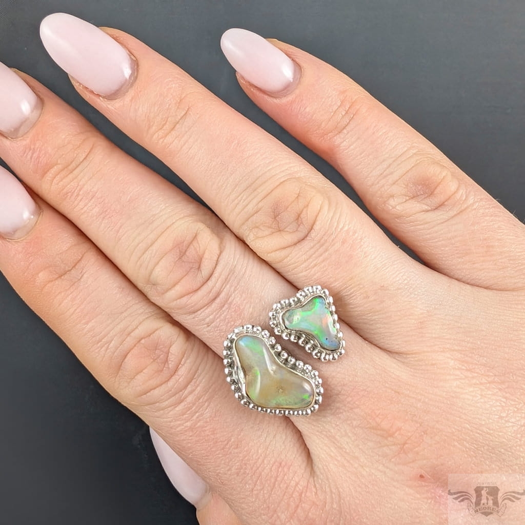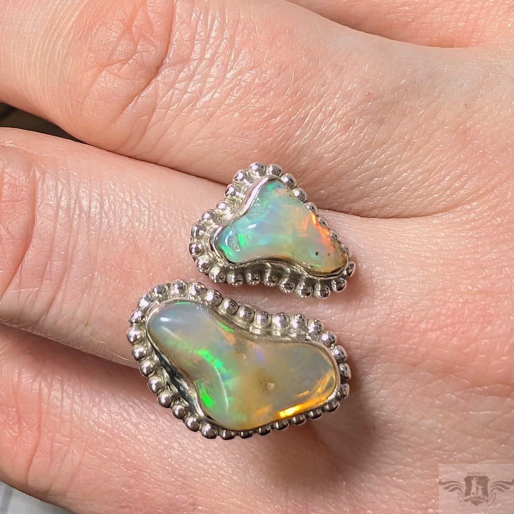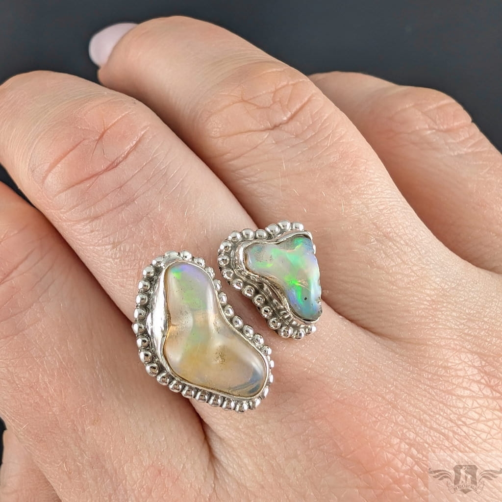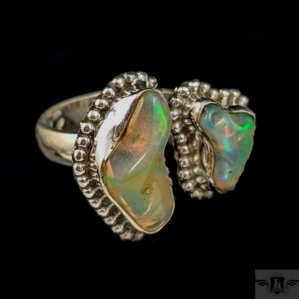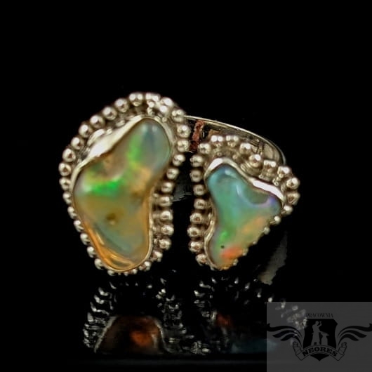 Pierścień niczym bombonierka z cukiereczkami :) Wykonany ze srebra pr. 925 oraz płonących opali z Etiopii w surowej formie i oprawie 19 x 11 mm oraz 10 x 9 mm. Rozmiar jubilerski min 16, max 20. Ustawię odpowiedni, proszę o wiadomość. Waga 7,5 g. Wykonany przez dostawcę kamieni. Pierścień zostanie zapakowany w ozdobne pudełeczko.