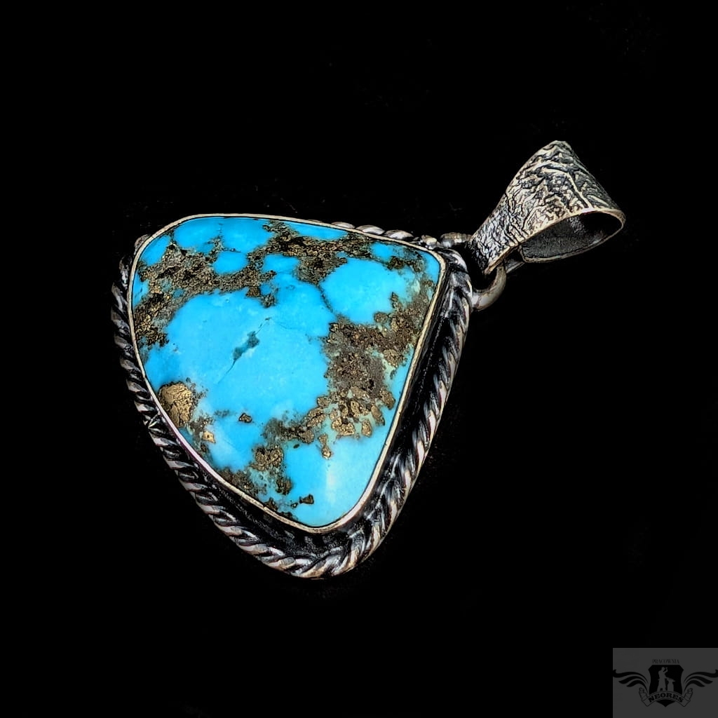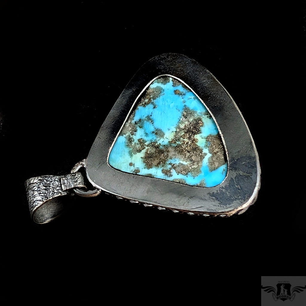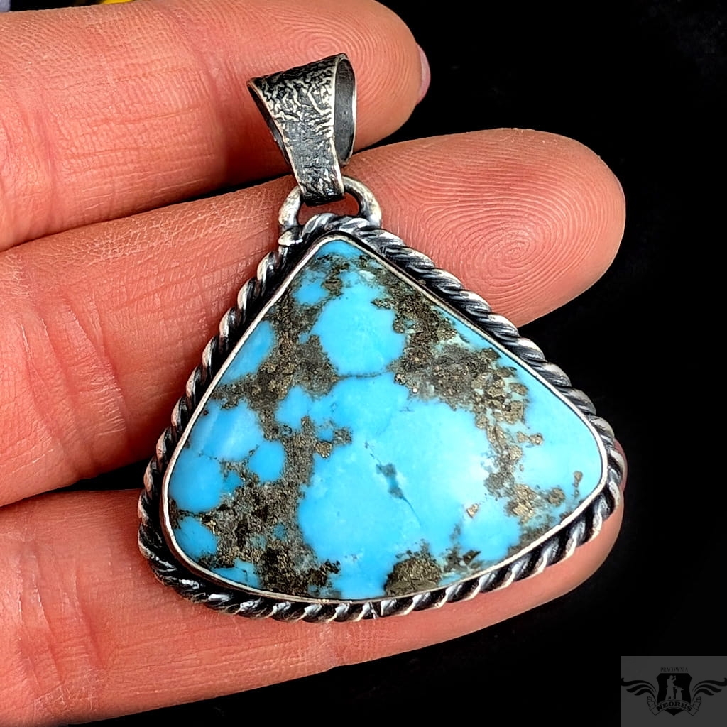 Wisiorek z naturalnym turkusem z Iranu, który zostal oprawiony w subtelną, oksydowaną ramę srebra próby 925. Wymiary oprawy 35 x 30 mm, długośc z krawatką max 41 mm, tył otwarty. Waga 17 g. Wisiorek zostanie zapakowany w ozdobne pudełeczko.