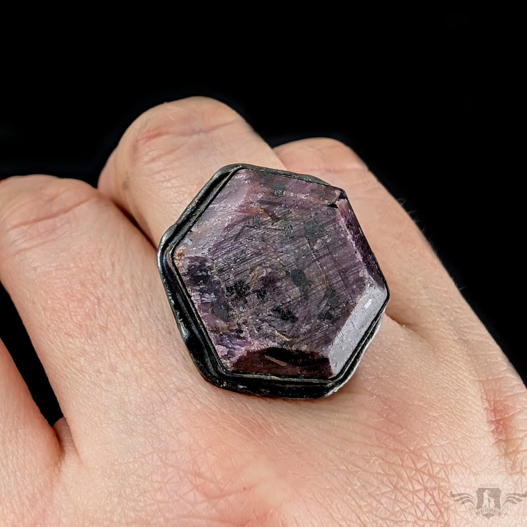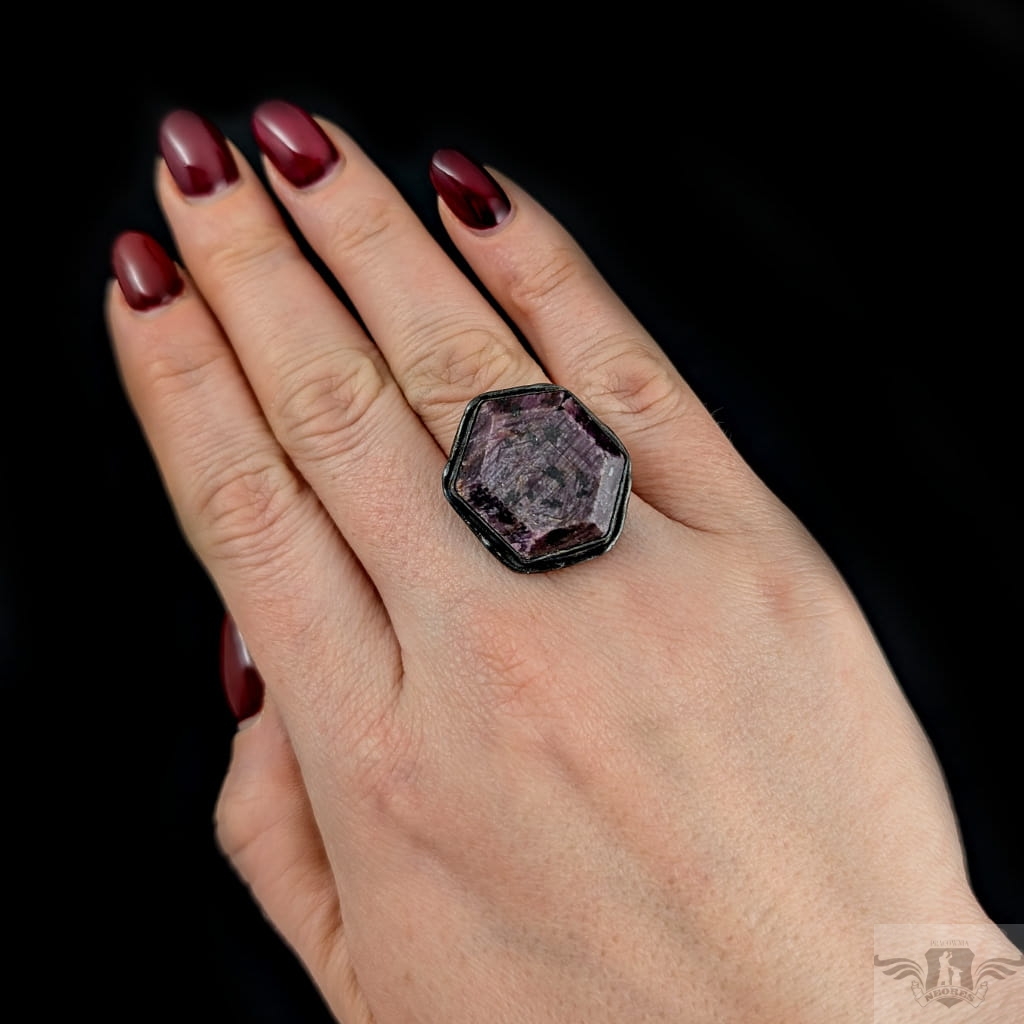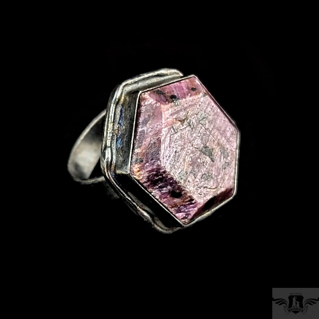 Piękny okaz surowego rubinu z iryzacją ukazującą się pod odpowiednim kątem, piękne zjawisko. Oprawa srebra próby 925, oksydowana. Waga 16 gramów. Wymiary całej oprawy 26 x 22 mm. Rozmiar regulowany w szerokim zakresie, proszę napisać, na jaki dopasować. Pierścień zostanie zapakowany w ozdobne pudełeczko.