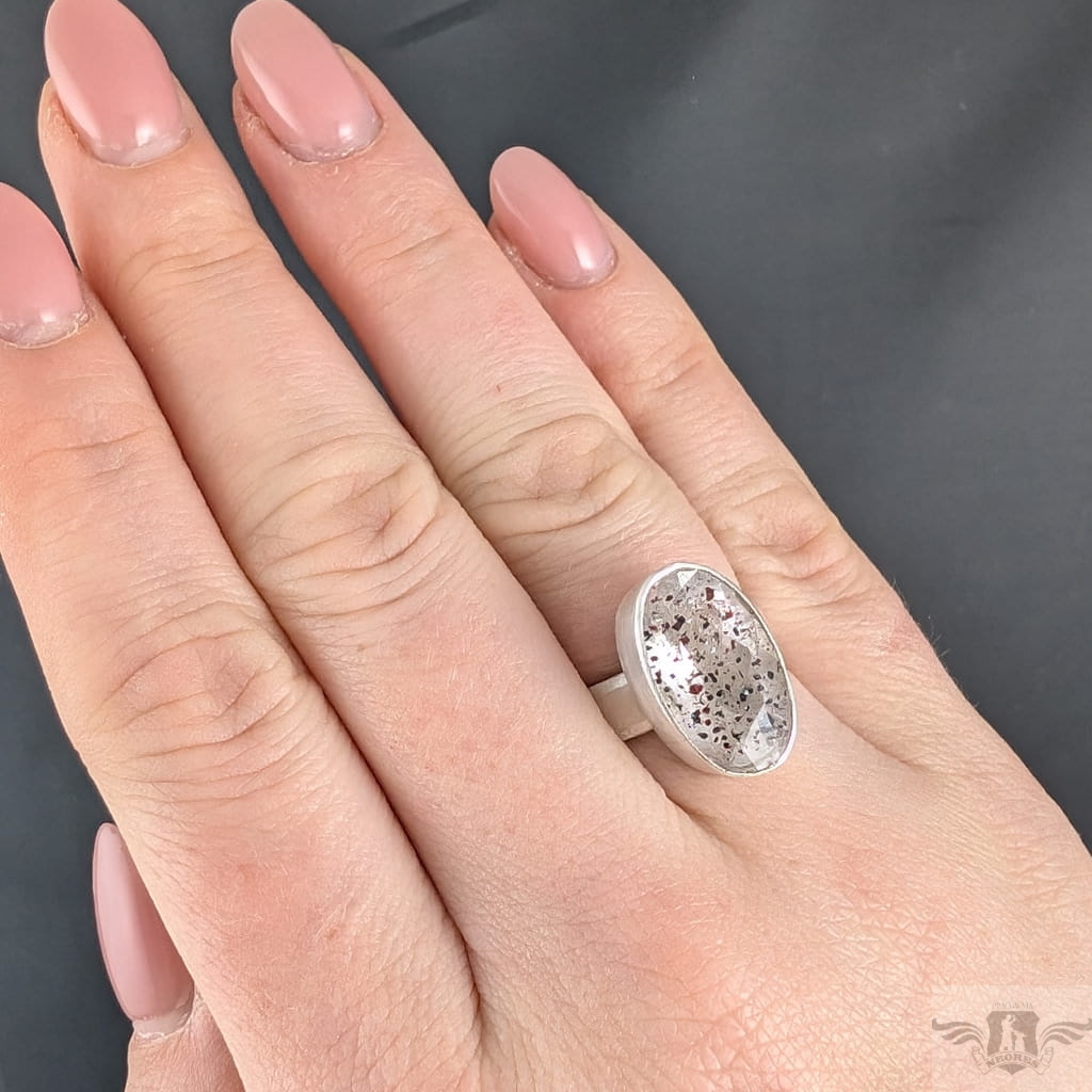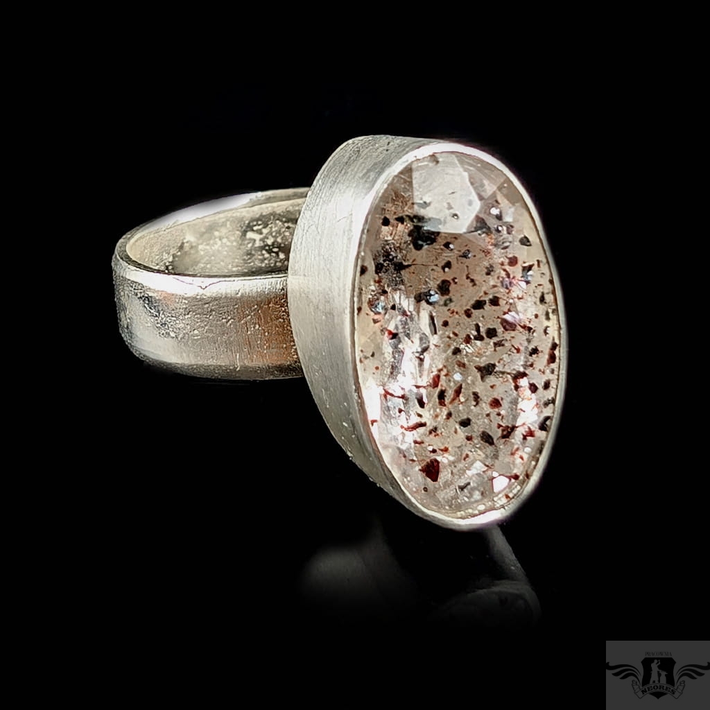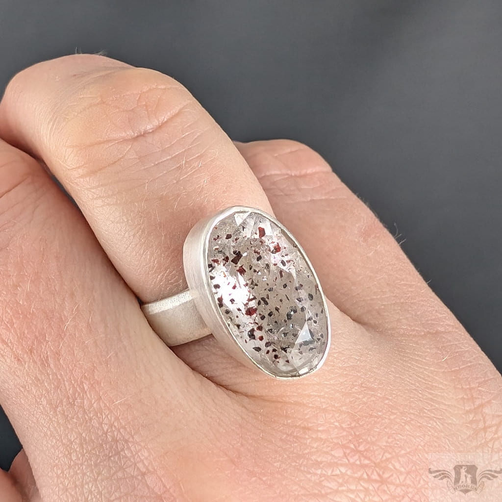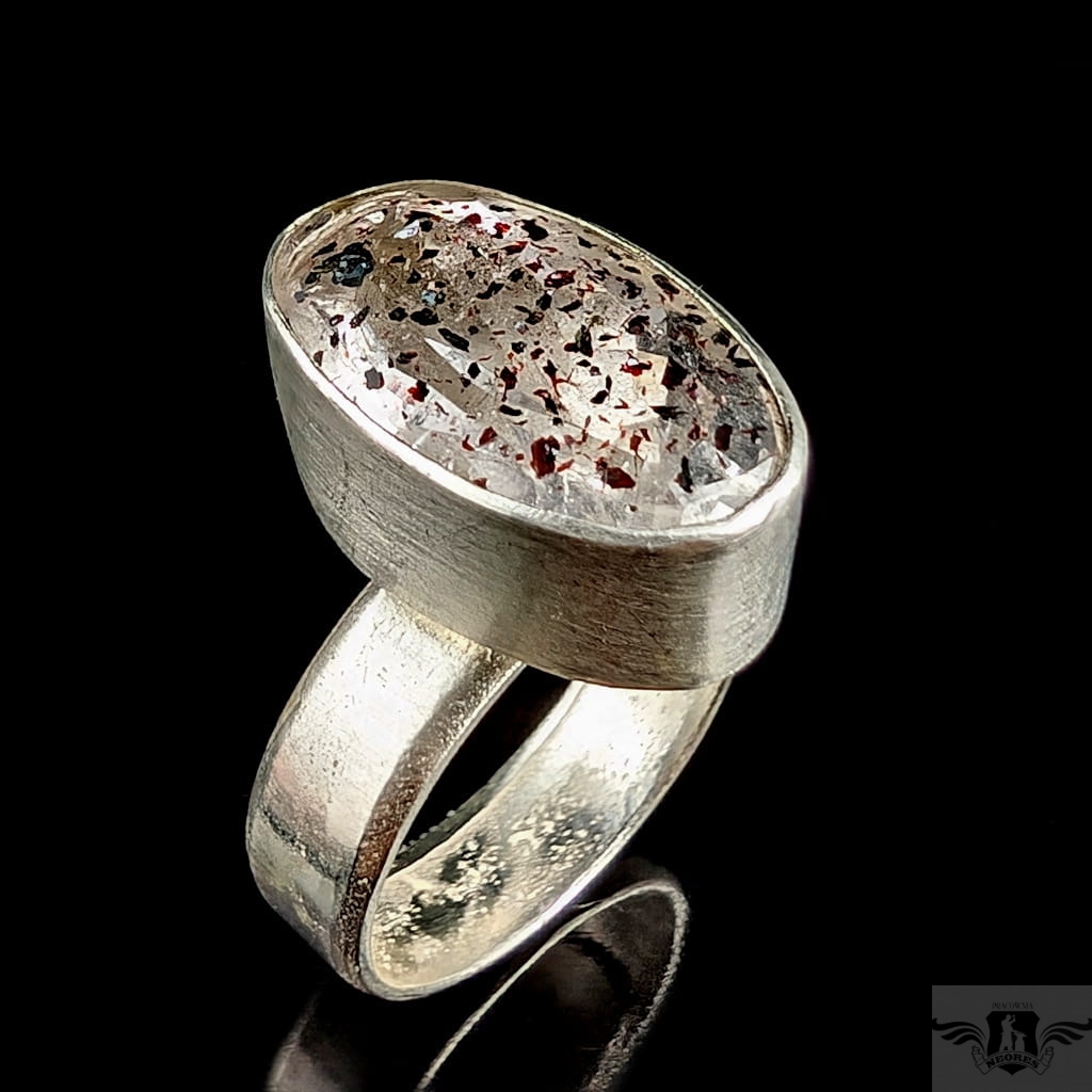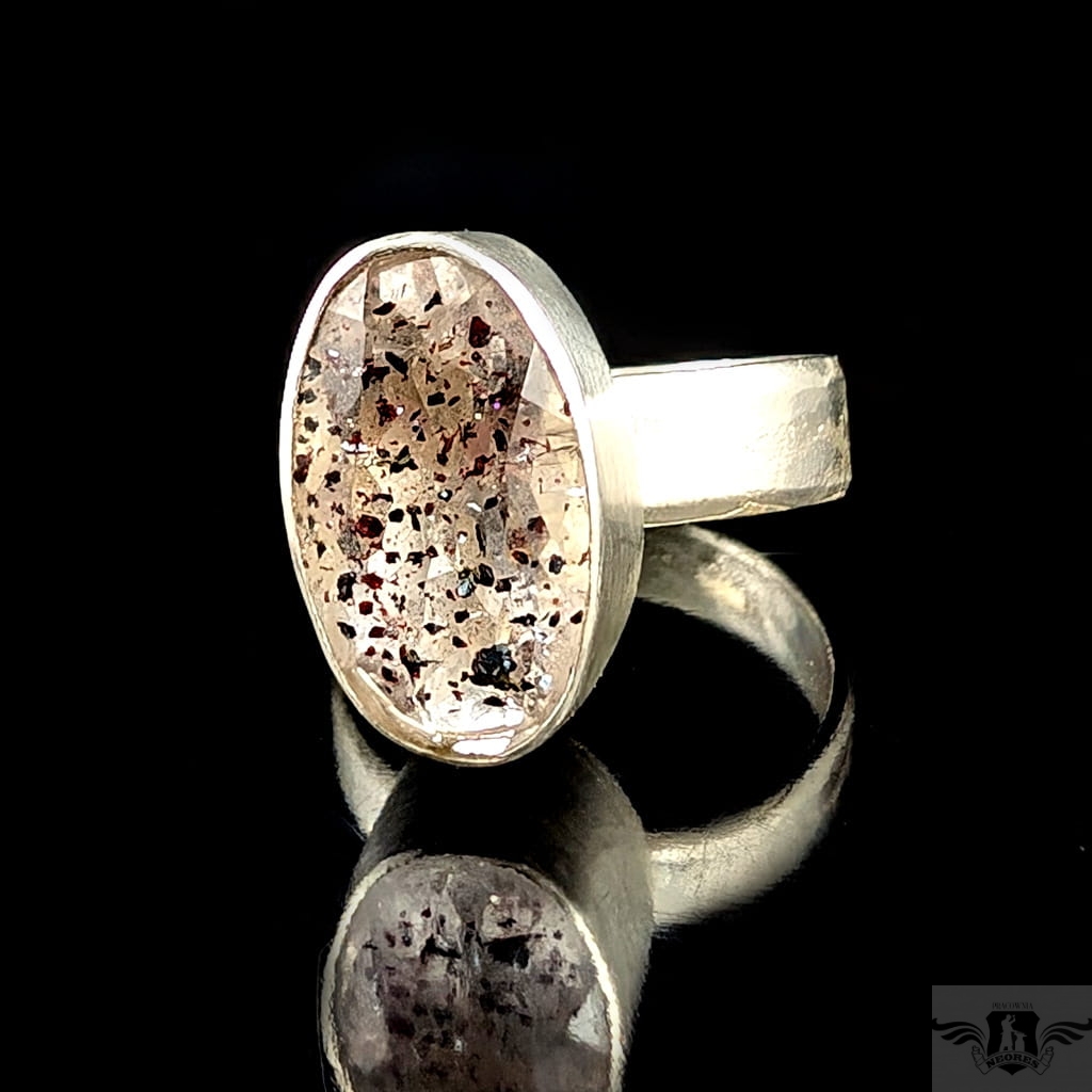 Oryginalny pierścień wykonany ze srebra próby 925. Klasyczna obrączkę (5 mm szerokości) zdobi wyjątkowy okaz Super Seven- zjawiskowa kombinacja 7 minerałów zaklętych w pięknym szlifie (m.in.lepidokrocyt, kwarc dymny,ametyst, rutyl, kryształ górski) . Ma 6,8 Ct. Kamień jest fasetowany i ma oprawę 19 x 12 mm. Pierścionek w rozmiarze jubilerskim regulowanym w szerokim zakresie, dopasuję po zakupie. waga 7 gramów. Zostanie wysłany w ozdobne pudełeczko.