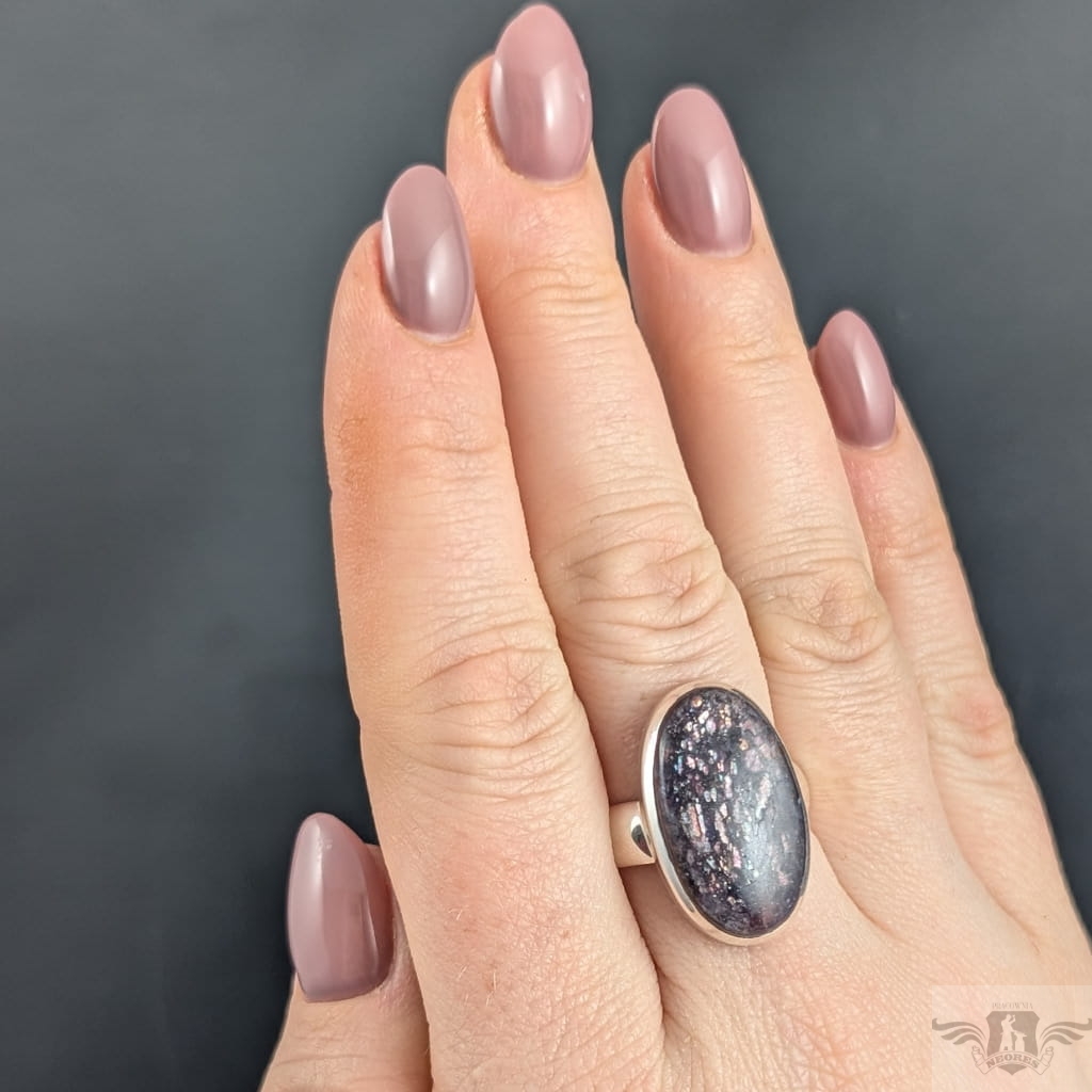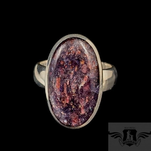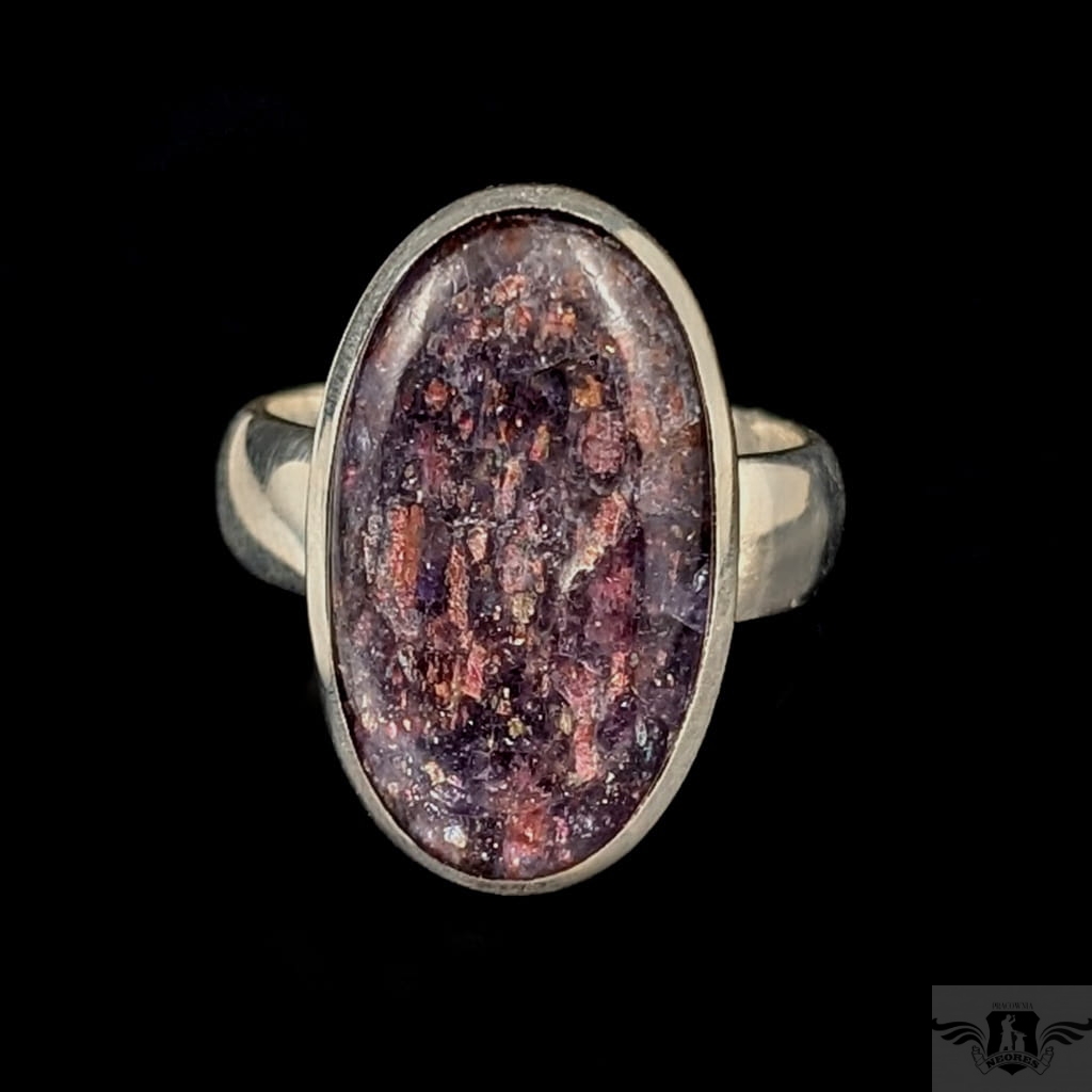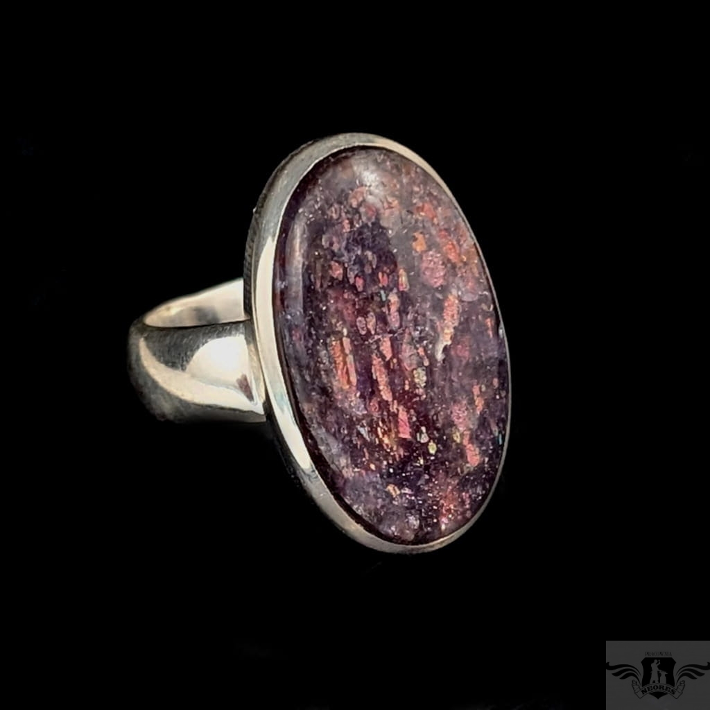 Pierścień wykonany ze srebra próby 925, który zdobi wyjątkowy okaz kamienia słonecznego w iolicie. Rzadki minerał wykazujący tzw.efekt awenturyzacji w postaci maleńkich mieniących się wrostów- łusek innych minerałów,np.hematytu. Niezwykle mienią się w słońcu i świetle maleńkimi różowo-czerwonawymi drobinami. Ciekawe i atrakcyjne połączenie dwóch minerałów. Kamień ma oprawę 25 x 15 mm. Pierścionek w rozmiarze jubilerskim regulowanym w wąskim zakresie rozmiarów 16- 20. Proszę napisać na jaki dopasować. Waga 9g Wykonany przez dostawcę kamieni.