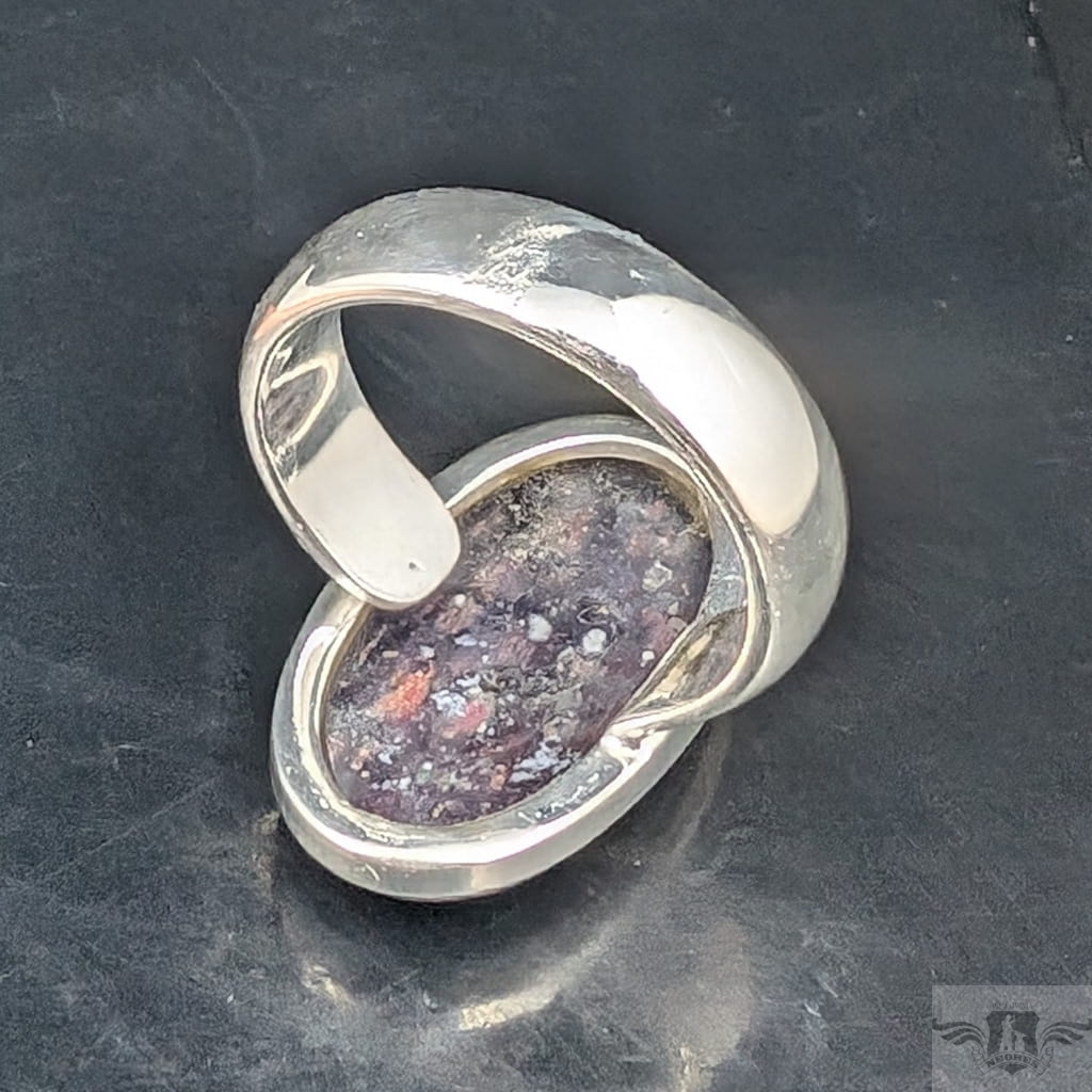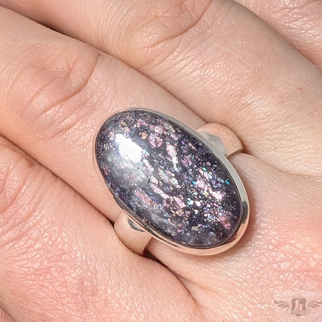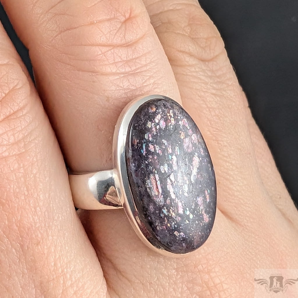 Pierścień wykonany ze srebra próby 925, który zdobi wyjątkowy okaz kamienia słonecznego w iolicie. Rzadki minerał wykazujący tzw.efekt awenturyzacji w postaci maleńkich mieniących się wrostów- łusek innych minerałów,np.hematytu. Niezwykle mienią się w słońcu i świetle maleńkimi różowo-czerwonawymi drobinami. Ciekawe i atrakcyjne połączenie dwóch minerałów. Kamień ma oprawę 25 x 15 mm. Pierścionek w rozmiarze jubilerskim regulowanym w wąskim zakresie rozmiarów 16- 20. Proszę napisać na jaki dopasować. Waga 9g Wykonany przez dostawcę kamieni.