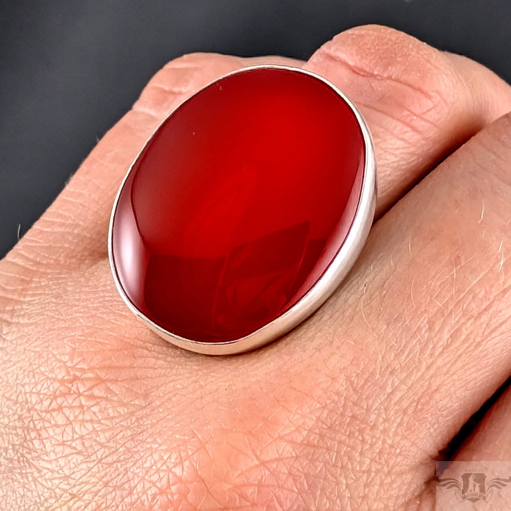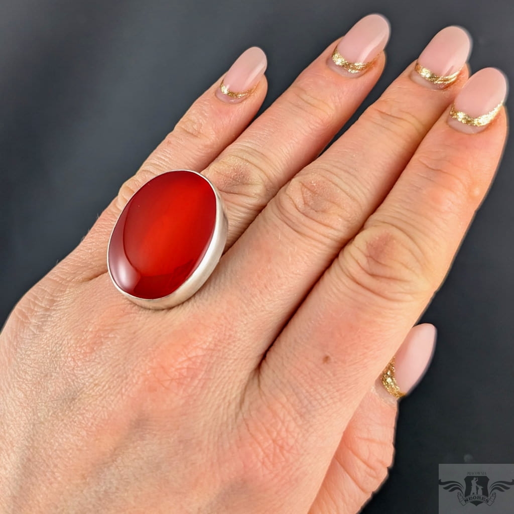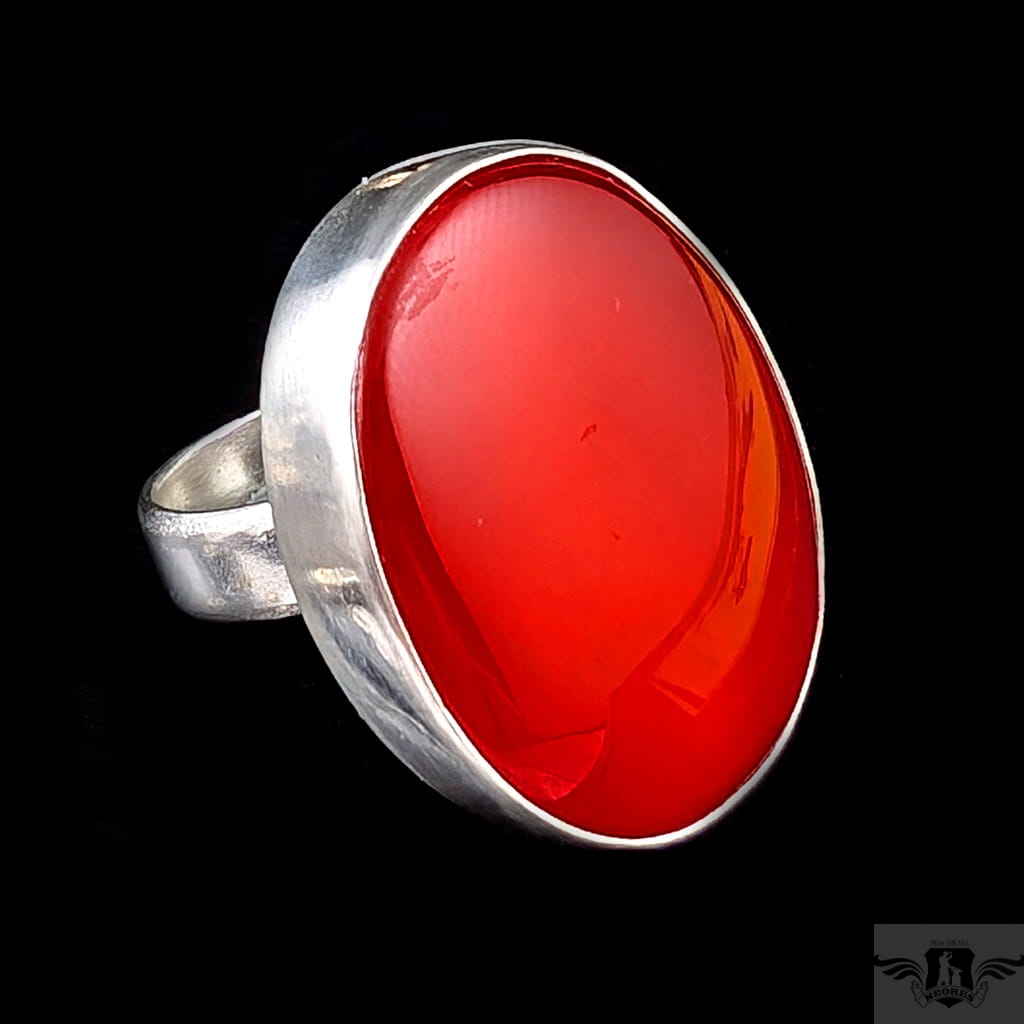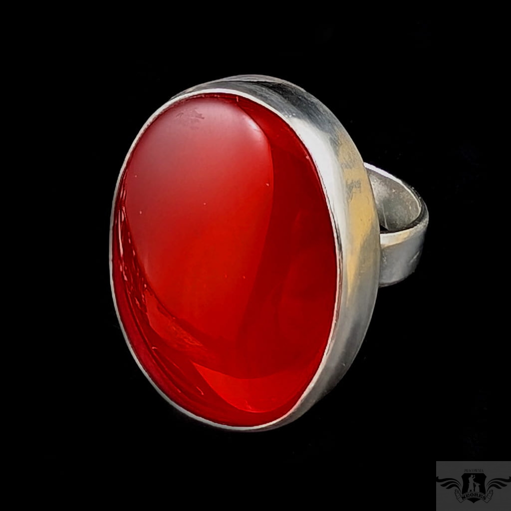 Pierścionek wykonany ze srebra próby 925 oraz zjawiskowego karneolu. Trudny do opisania piękny kolor kamienia, czerwony z pomarańczową poświatą, pięknie współgra z blaskiem srebra. Wymiary oprawy 30 x 23 mm. Waga 16 g. Rozmiar jubilerski regulowany w szerokim zakresie, proszę napisać na jaki dopasować. Obrączka ma 5 mm szerokości. Pierścionek wysyłamy w ozdobnym pudełeczku. Polecam z pięknym wisiorem.