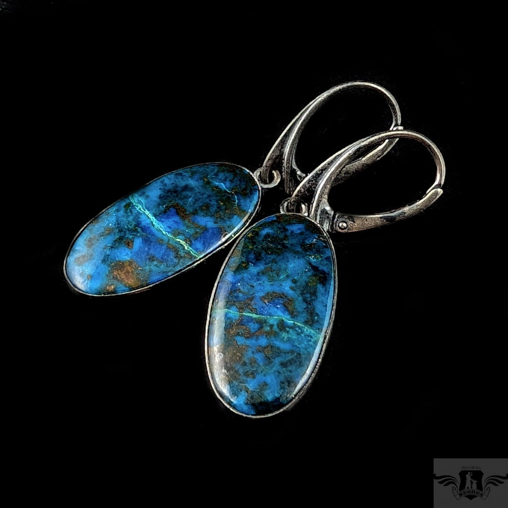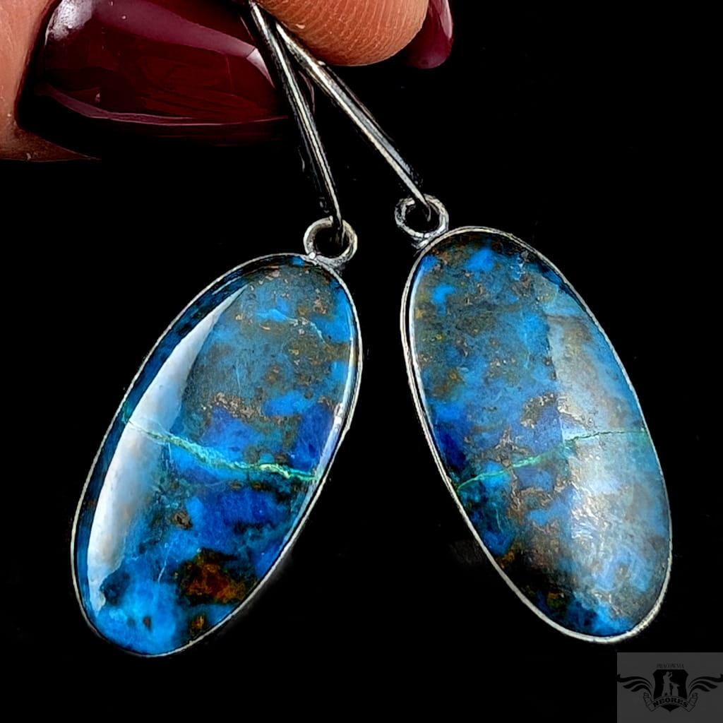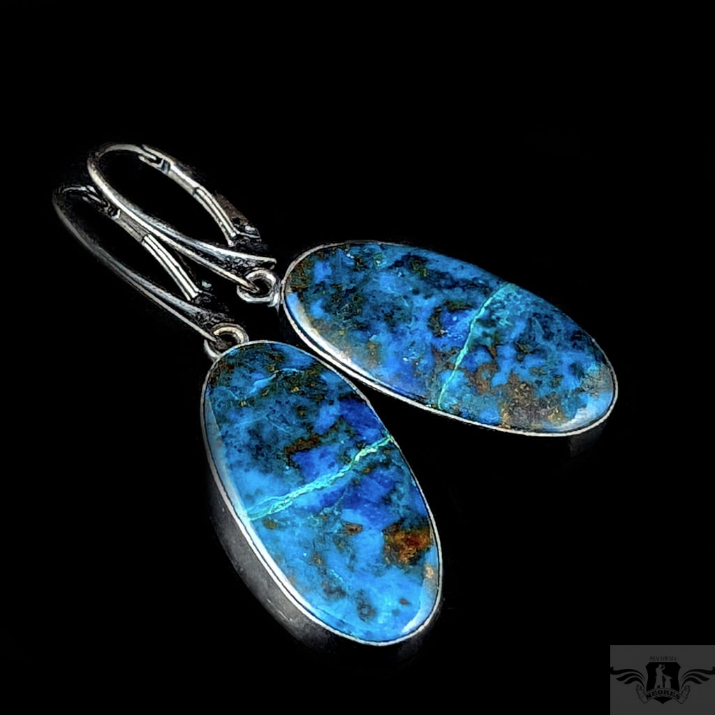 Piękne azuryty oprawione w oksydowane srebro próby 925. Wymiary całej oprawy 25 x 13 mm. Długość z biglami 42mm. Waga jednego 5,2 g. Zostaną zapakowane w ozdobne pudełeczko.