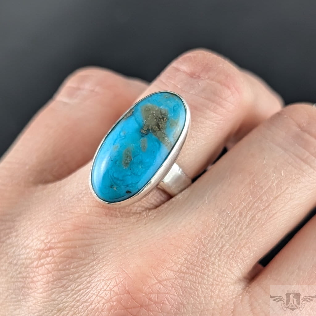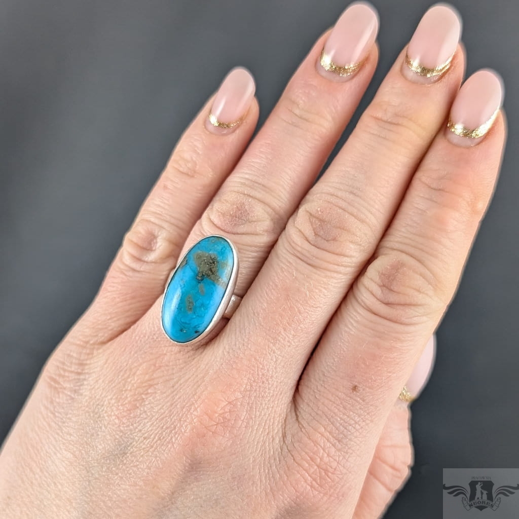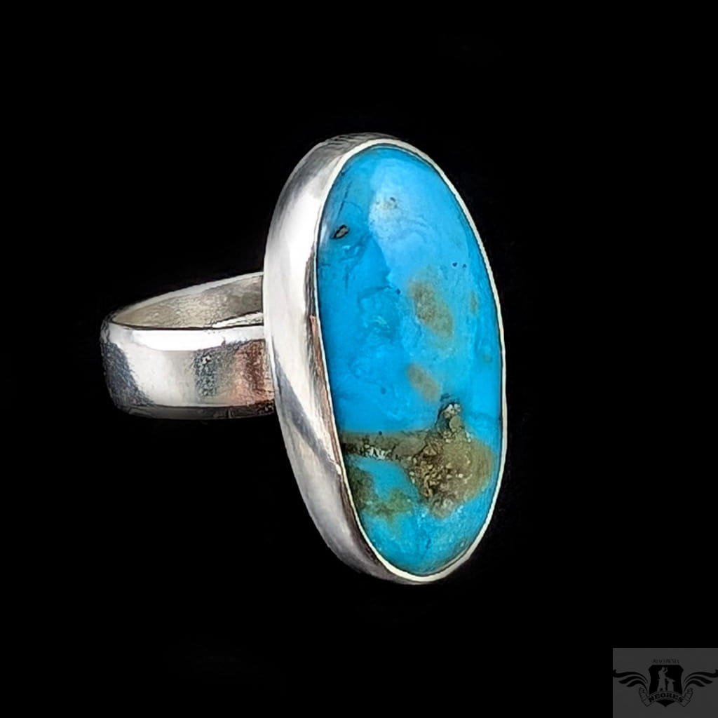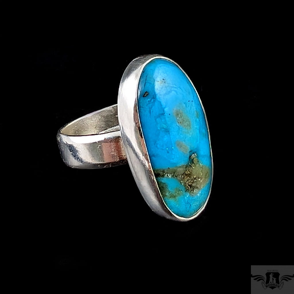Klasyczny pierścionek wykonany z oksydowanego srebra pr 925 oraz pięknego, naturalnego turkusu z Iranu o zjawiskowej błękitnej barwie. Jest piękny, wygląda jak stare klejnoty z babcinych puzderek. Rozmiar obrączki regulowany, do dopasowania w szerokim zakresie, proszę napisać na jaki ustawić. Oprawa 25 x 13 mm. Waga 8 g. Pierścień wyslany zostanie w ozdobnym pudełeczku