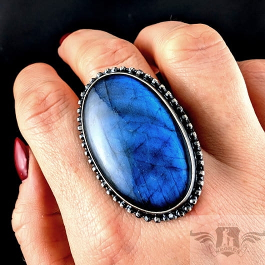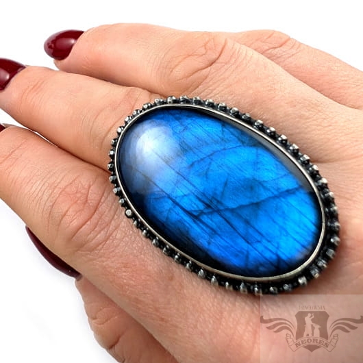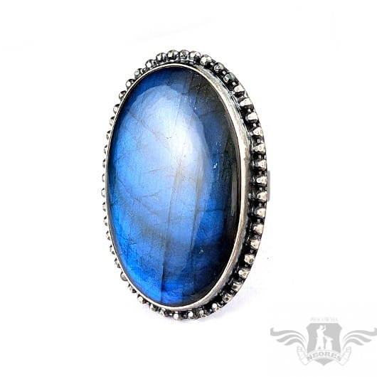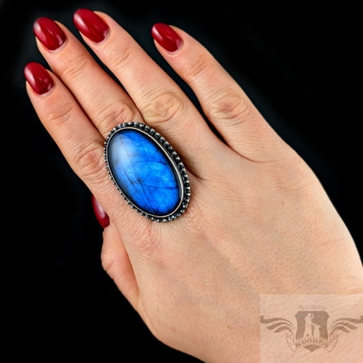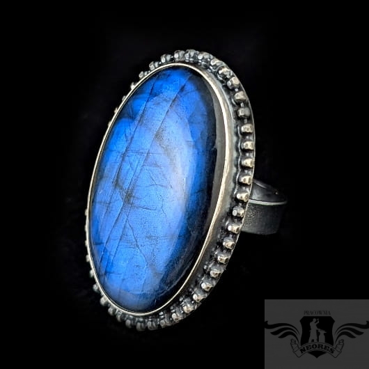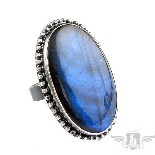 Bardzo okazały pierścień wykonany własnoręcznie ze srebra próby 925 oraz przepięknego labradorytu. Oprawa oksydowana. Wymiary oprawy 42 x 28 mm. Rozmiar jubilerski 19, mogę powiekszyć na max 26 Obrączka ma 5 mm szerokości, waga 21 g. Pierścionek zostanie zapakowany w ozdobne pudełeczko.