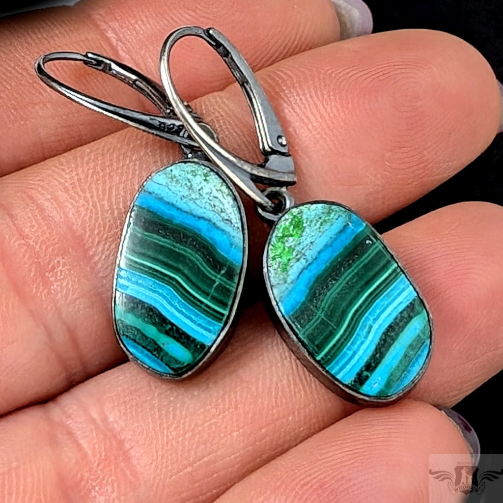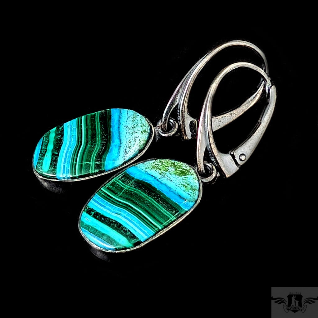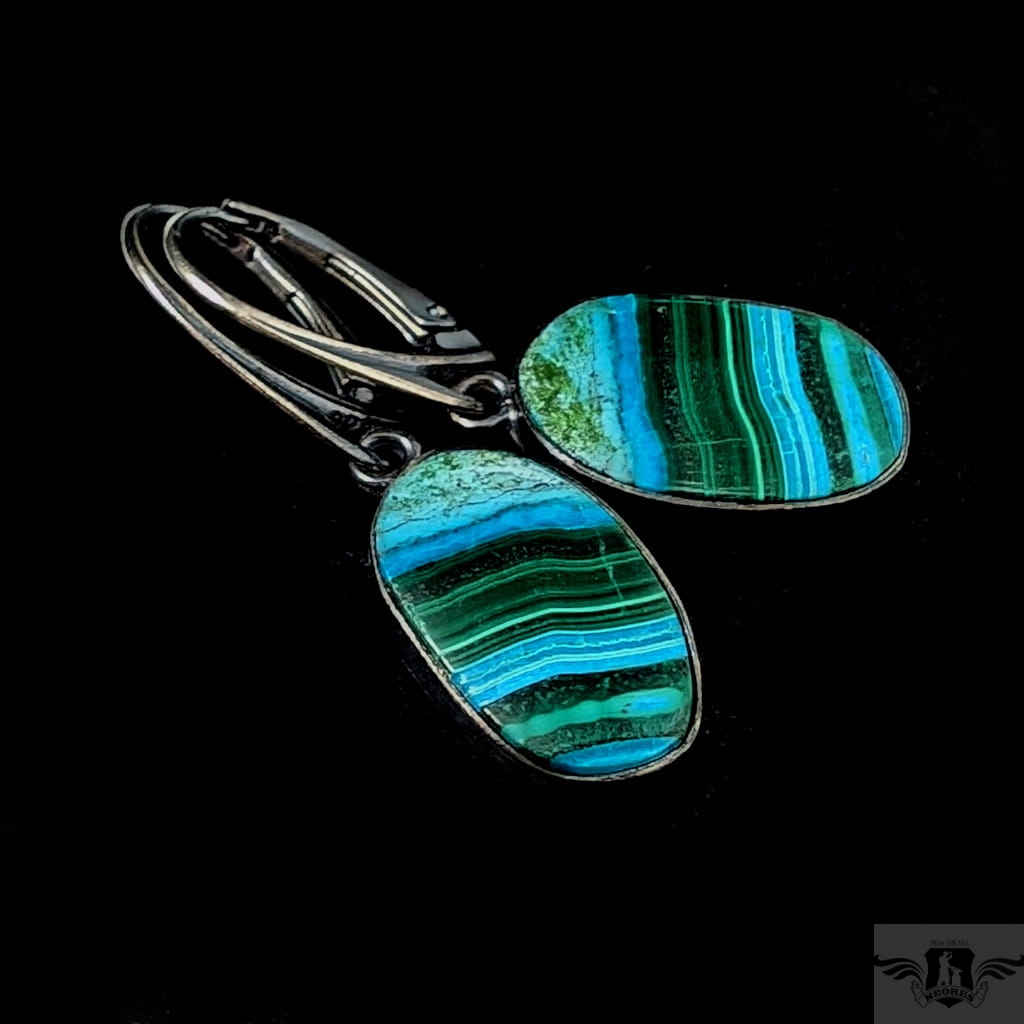 Kolczyki wykonane z oksydowanego srebra próby 925 oraz pięknego malachitu z chryzokolą z unikalnym charakterystycznym dla tego kamienia malunkiem. Wymiary oprawy 18 x 11 mm. Długość całkowita 37 mm. Waga 3,27 g. Kolczyki zapakowane w ozdobne pudełeczko.