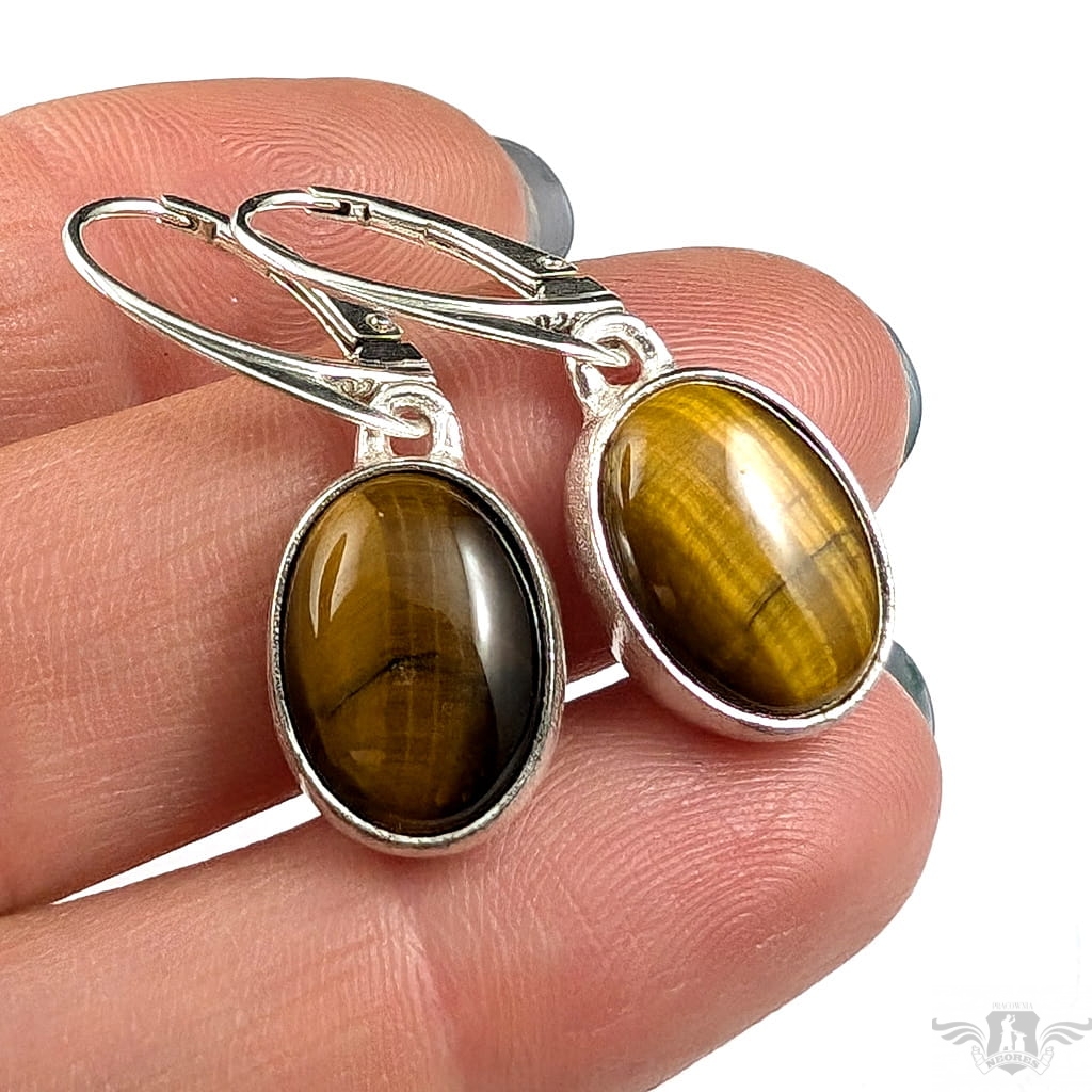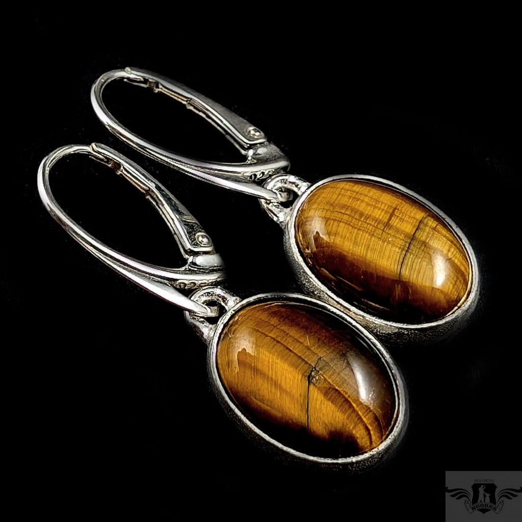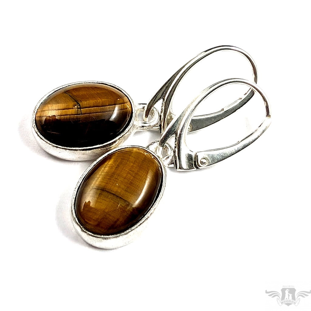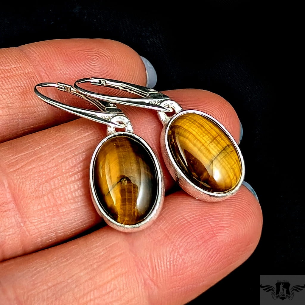 Kolczyki wykonane ze srebra próby 925 oraz pięknych kamieni tygrysiego oka. Długość całkowita z biglami 33 mm, wymiary elementów z kamieniami 16 x 11 mm. Waga jednego kolczyka 3.12 grama. Kolczyki zostaną zapakowane w ozdobne pudełeczko.