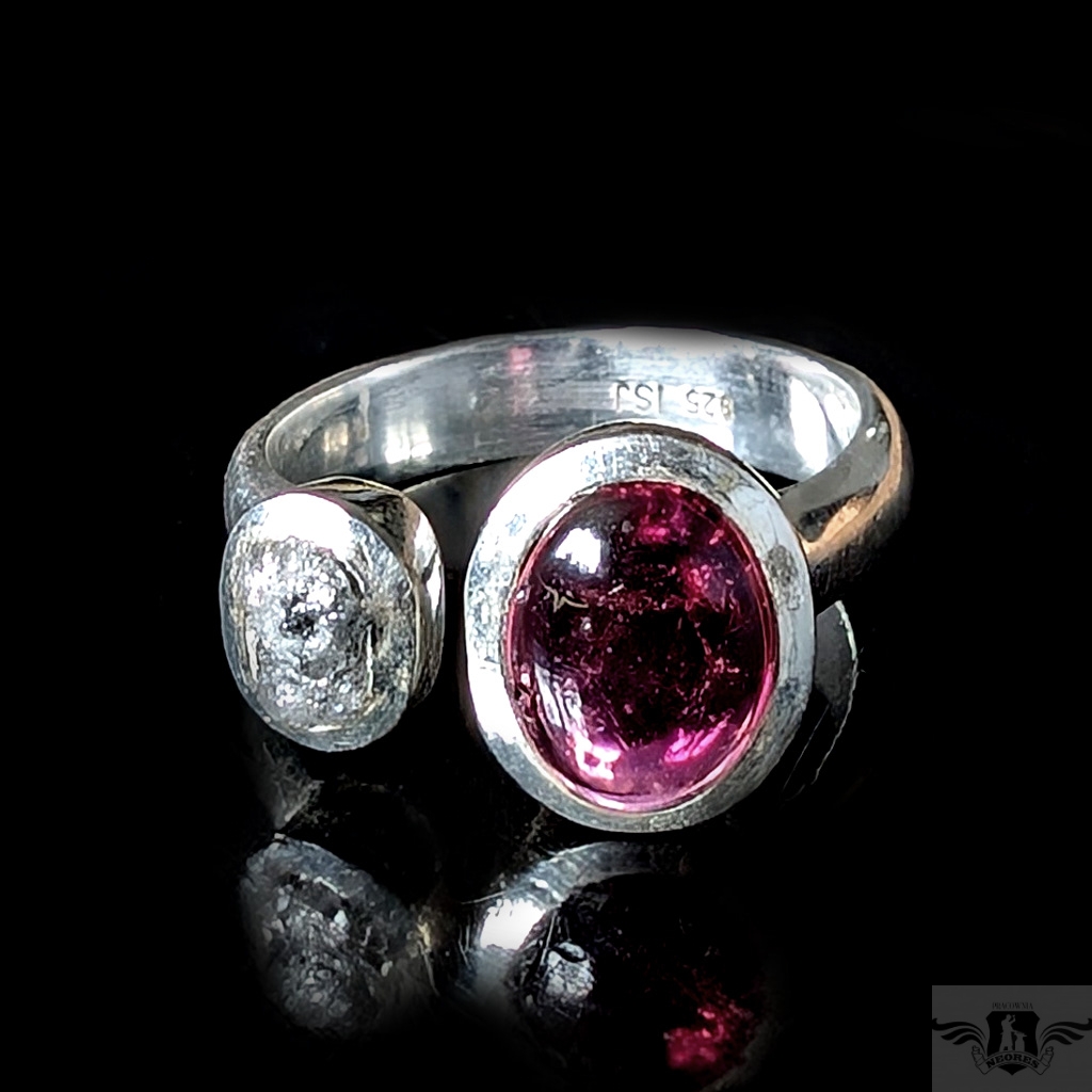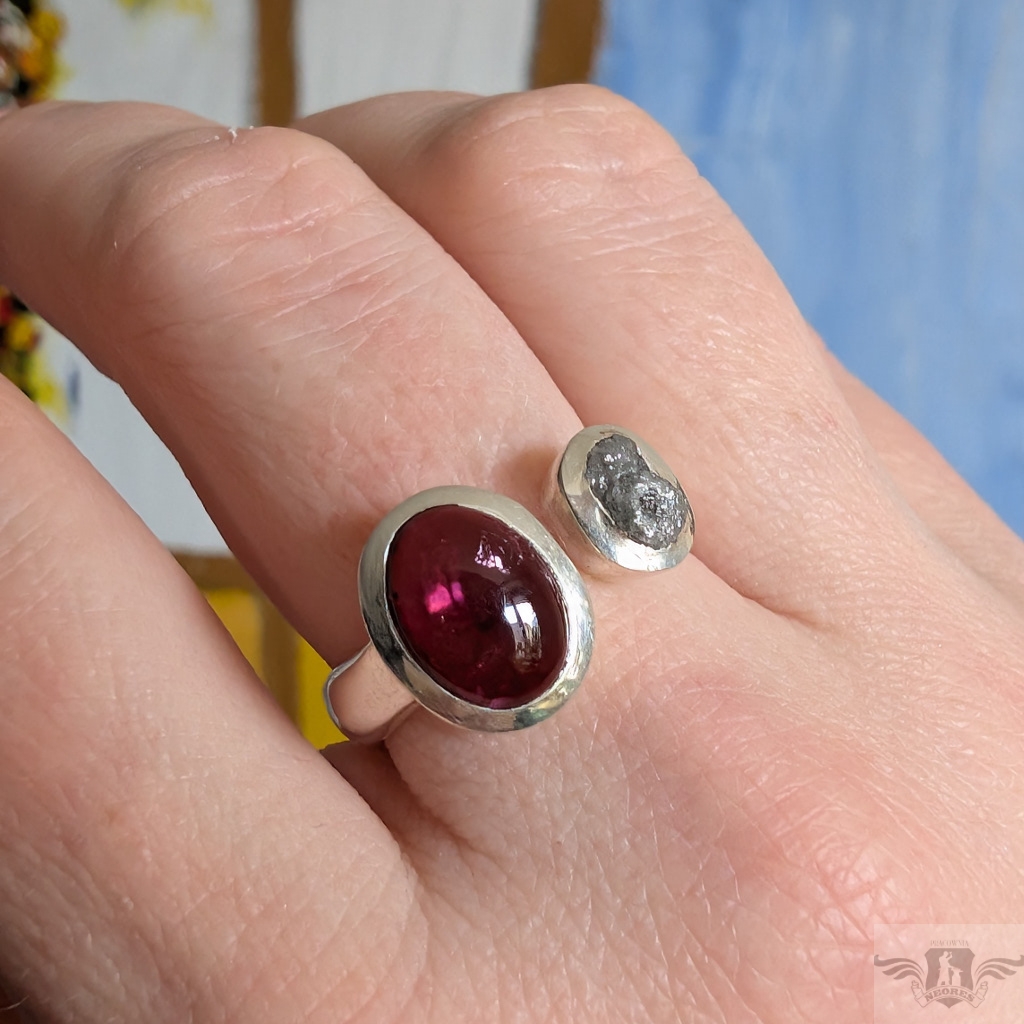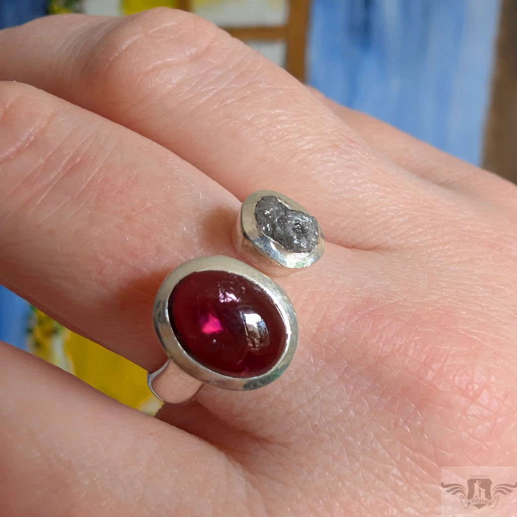 Pierścień wykonany ze srebra pr. 925 z surowym diamentem i pięknego turmalinu o różowej barwie. Niezwykłe połączenie. Wymiary oprawy diamentu 8 x 6 mm, turmalinu 12 x 10. Rozmiar jubilerski minimum 17, mogę powiększyć na max 20. Ustawię odpowiedni, proszę o wiadomość. Waga 6,3 g. Polecam, piękny i bardzo oryginalny. Wykonany przez dostawcę kamieni. Pierścień zostanie zapakowany w ozdobne pudełeczko.