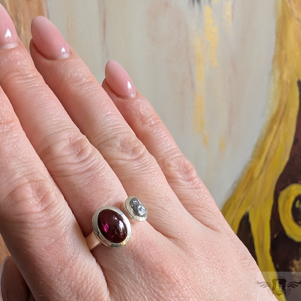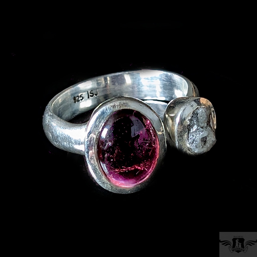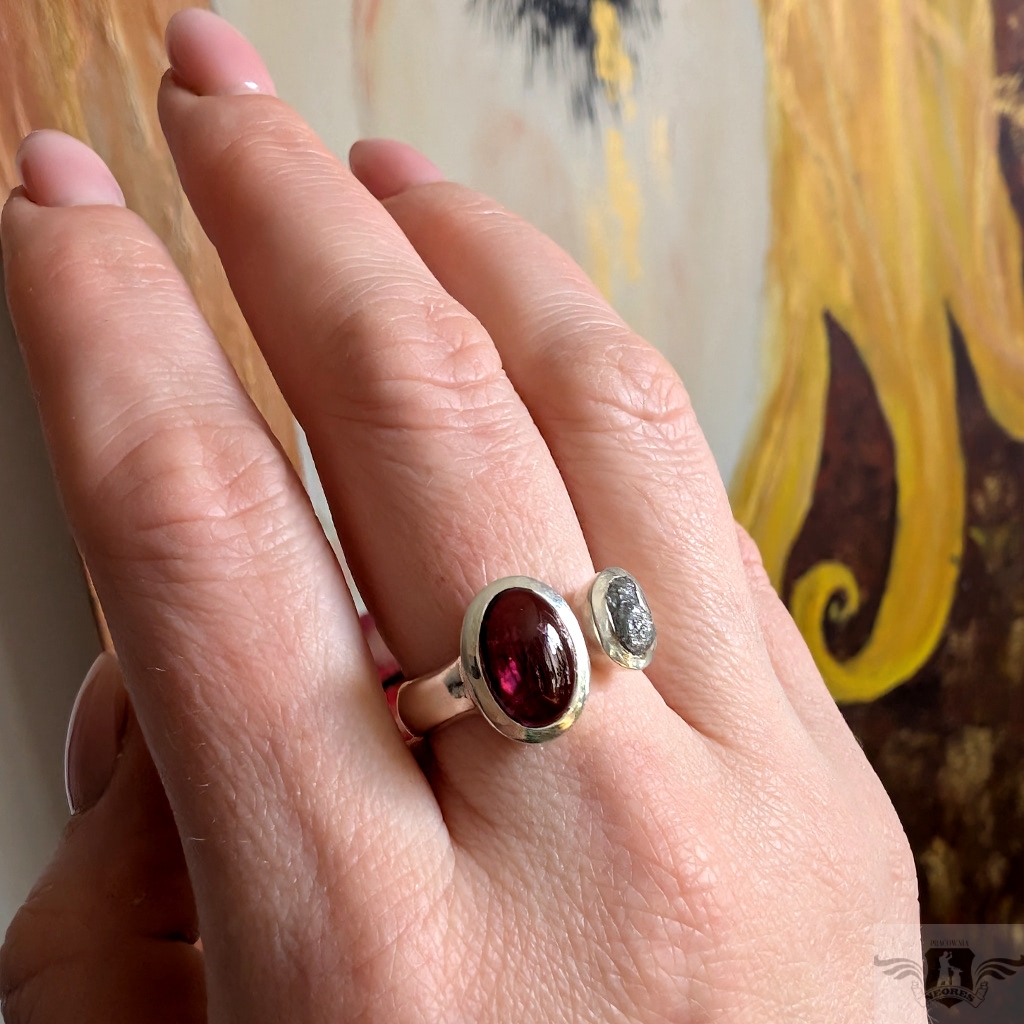 Pierścień wykonany ze srebra pr. 925 z surowym diamentem i pięknego turmalinu o różowej barwie. Niezwykłe połączenie. Wymiary oprawy diamentu 8 x 6 mm, turmalinu 12 x 10. Rozmiar jubilerski minimum 17, mogę powiększyć na max 20. Ustawię odpowiedni, proszę o wiadomość. Waga 6,3 g. Polecam, piękny i bardzo oryginalny. Wykonany przez dostawcę kamieni. Pierścień zostanie zapakowany w ozdobne pudełeczko.