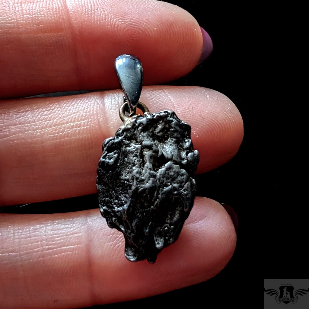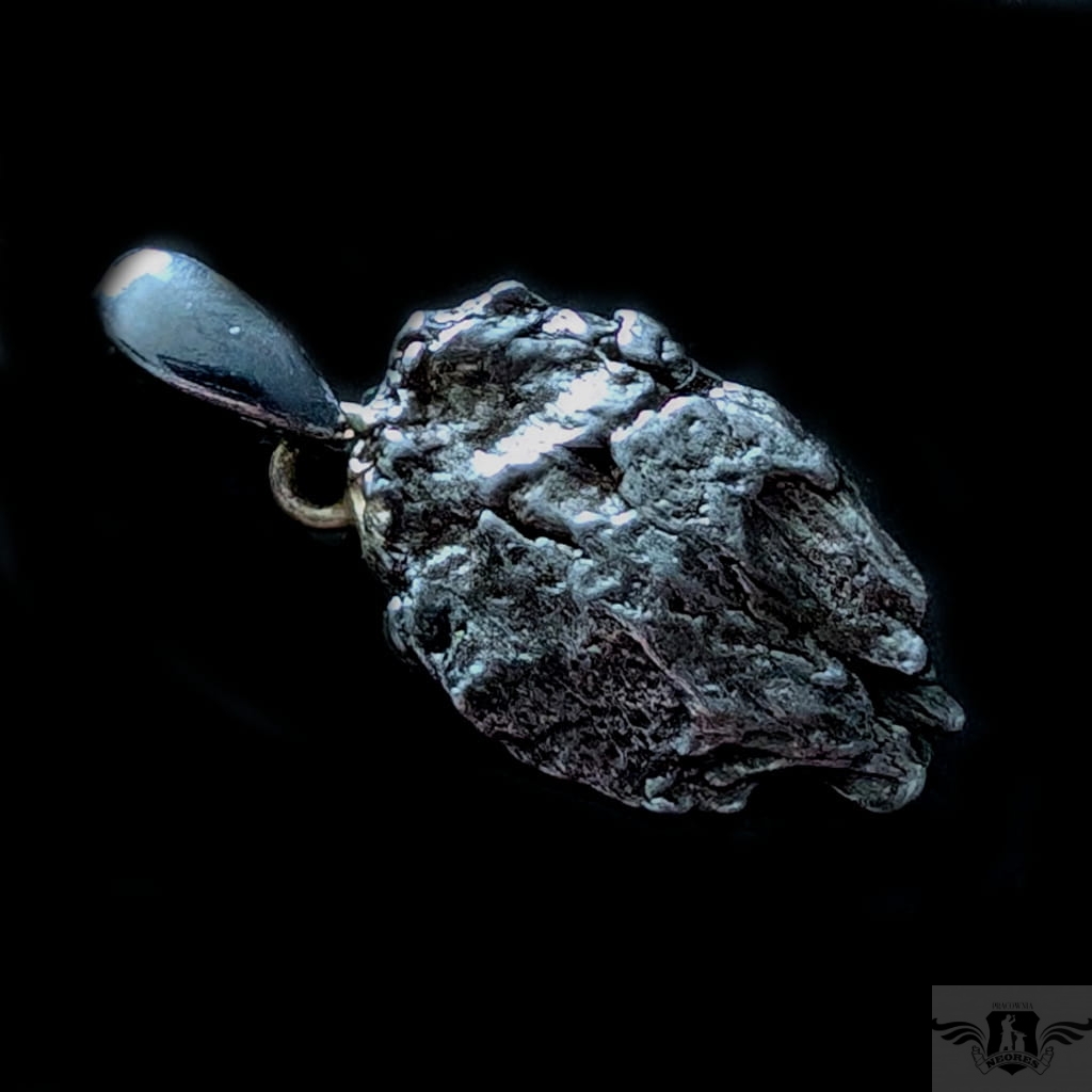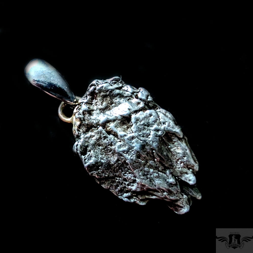 Wyjątkowy wisior z okazałym, meteorytem żelaznym Campo del Cielo, który znaleziono w 1576 roku w Argentynie. Meteorytom przypisywane są magiczne właściwości talizmanów. Z pewnością jest to niebanalny materiał jubilerski w ciekawy sposób zakomponowany w srebro.Uniwersalny,dla niego lub dla niej. Do meteorytu dołączona jest jego metryka. Wymiaty 22 x 16 mm, z krawatką z oksydowanego srebra długosć 33 mm, Waga wisiora 6,5 g. Wisior zostanie zapakowany w ozdobne pudełeczko.